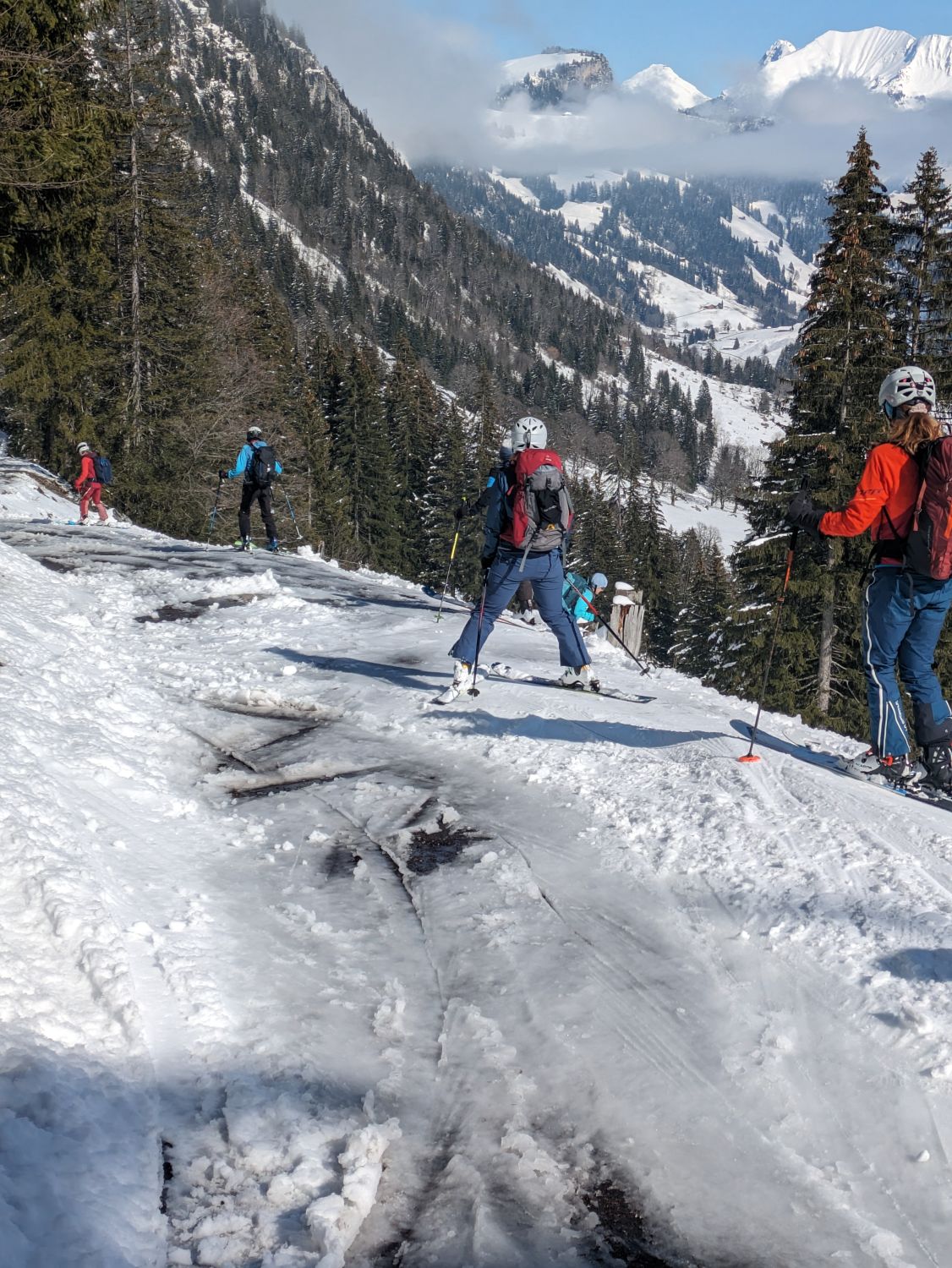 Unterhalb des Brätliplatzes werden die Sonne und die warmen Temperaturen nun den Schnee sehr schnell wegräumen. Tragepassagen werden unumgänglich.
