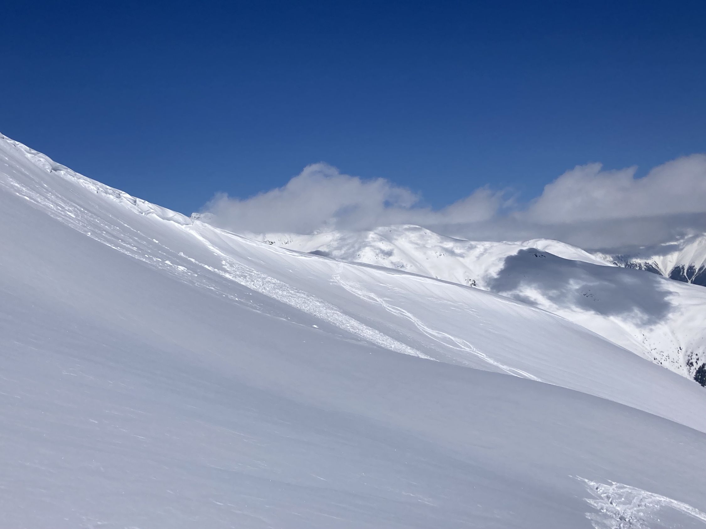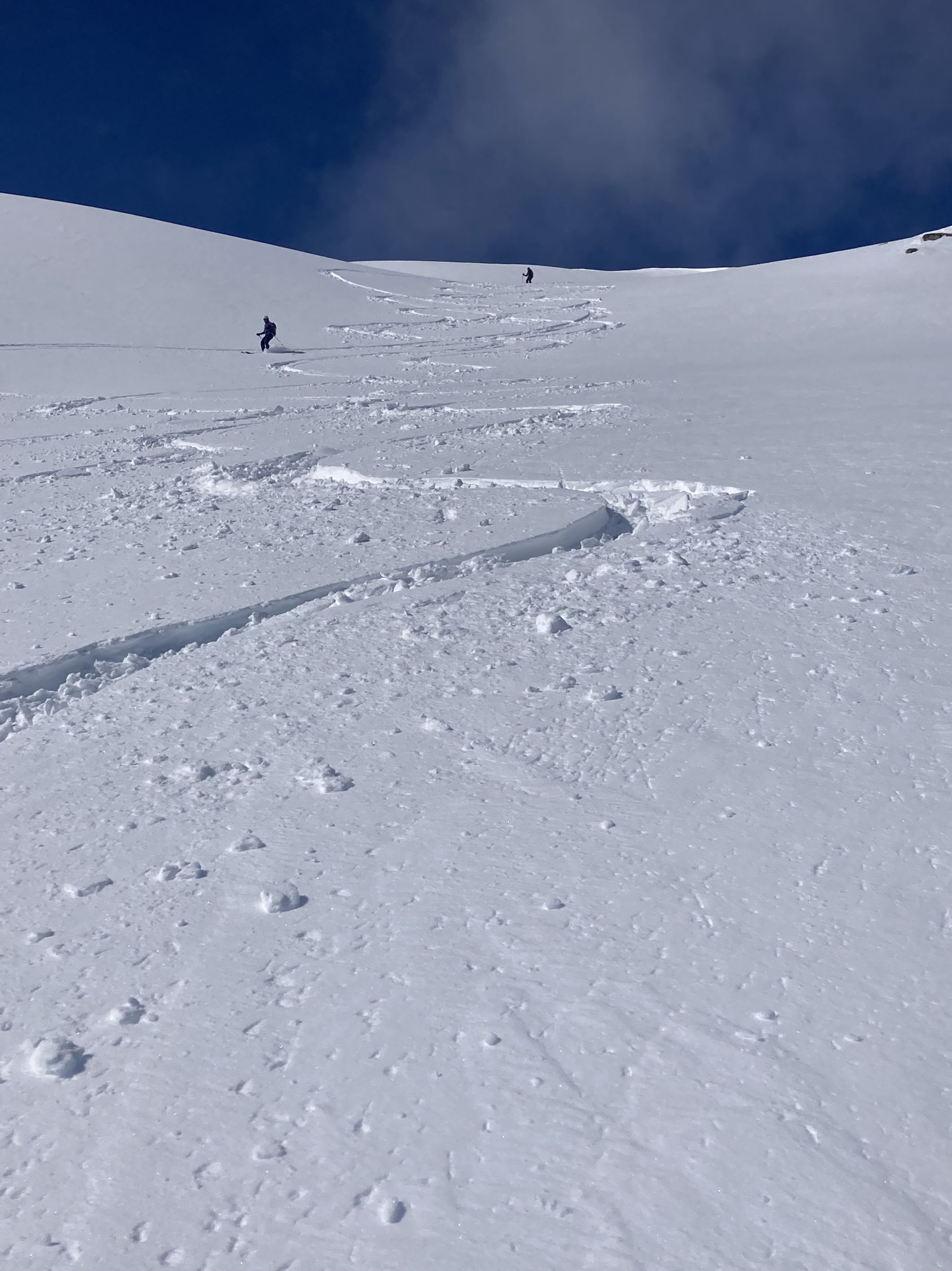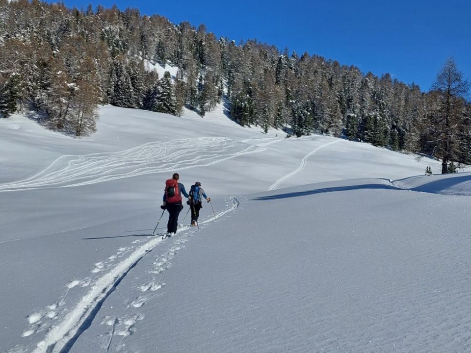 Die untersten Hänge haben sehr wenig Schnee. Ging gerade noch so, teilweise über Gras. Morgen nicht mehr. Ab ca. Pt. 1912 gut. Ansonsten schöne Verhältnisse, auch wenn der Pulverschnee schwerer und schwerer wurde. z.T. windbearbeitet. Direktabfahrt vom Gipfel tiptop. Ab Acla Laret auf Winterwander-/Schlittelweg empfehlenswert (hübsch und sehr entspannend zu fahren), da auf der Aufstiegsroute zuunterst zuwenig Schnee.