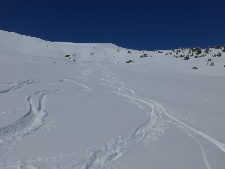 Schöner Neuschnee, ca. 30 cm, nordseitig Pulver, südseitig schon etwas schwer, aber noch gut zu fahren. Sonniges Bergwetter, nachmittags an einigen Stellen Nebelschwaden.