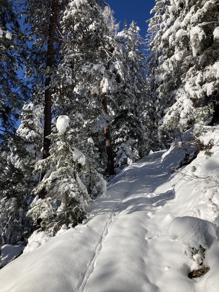 Ab Wiesen gut zu gehen mit den Ski im Aufstieg. Zurück auf dem Waldweg tragstellen.