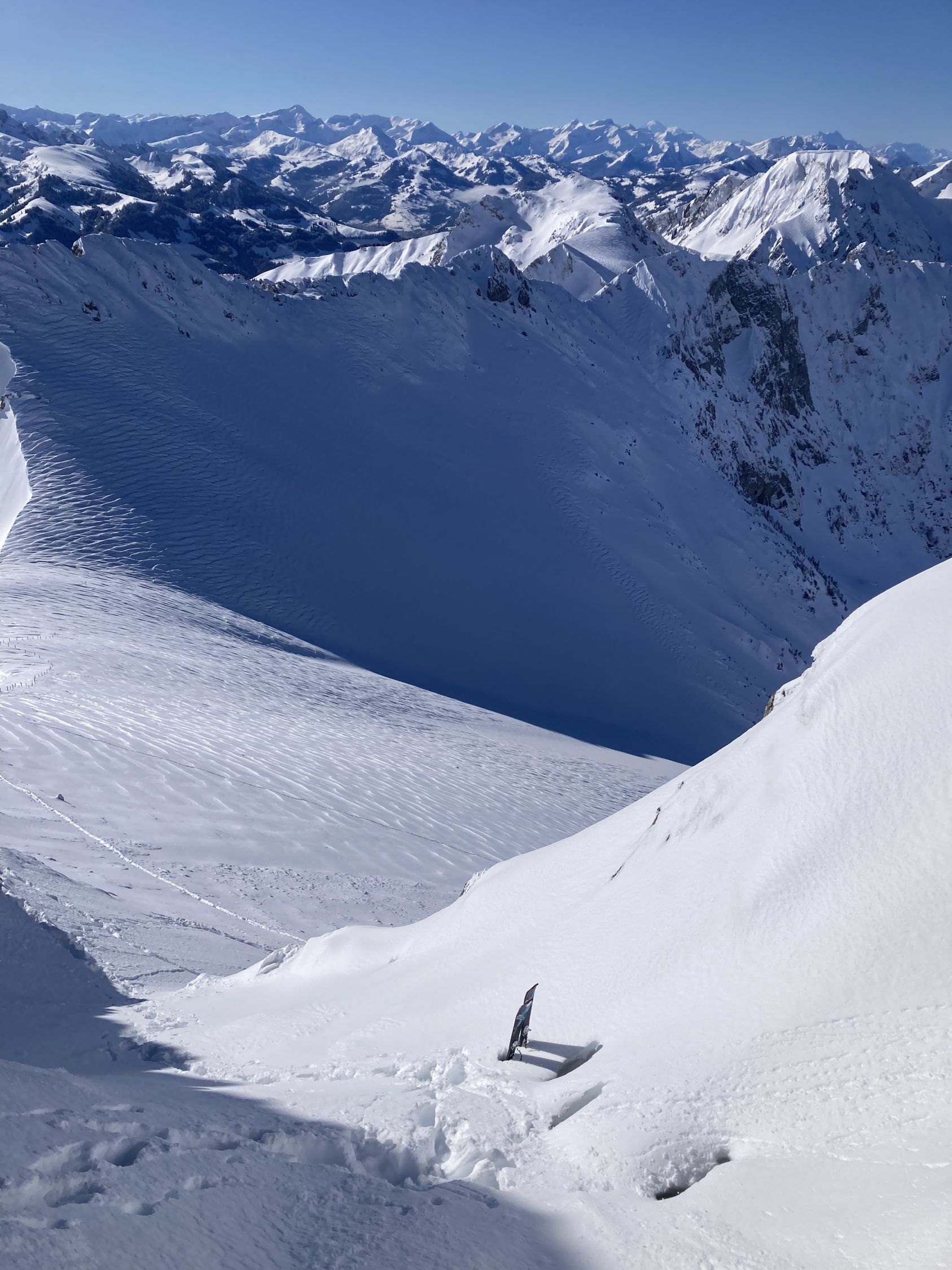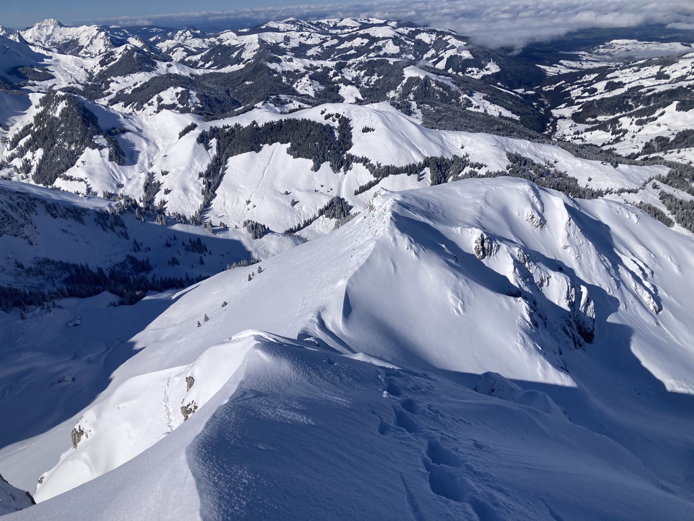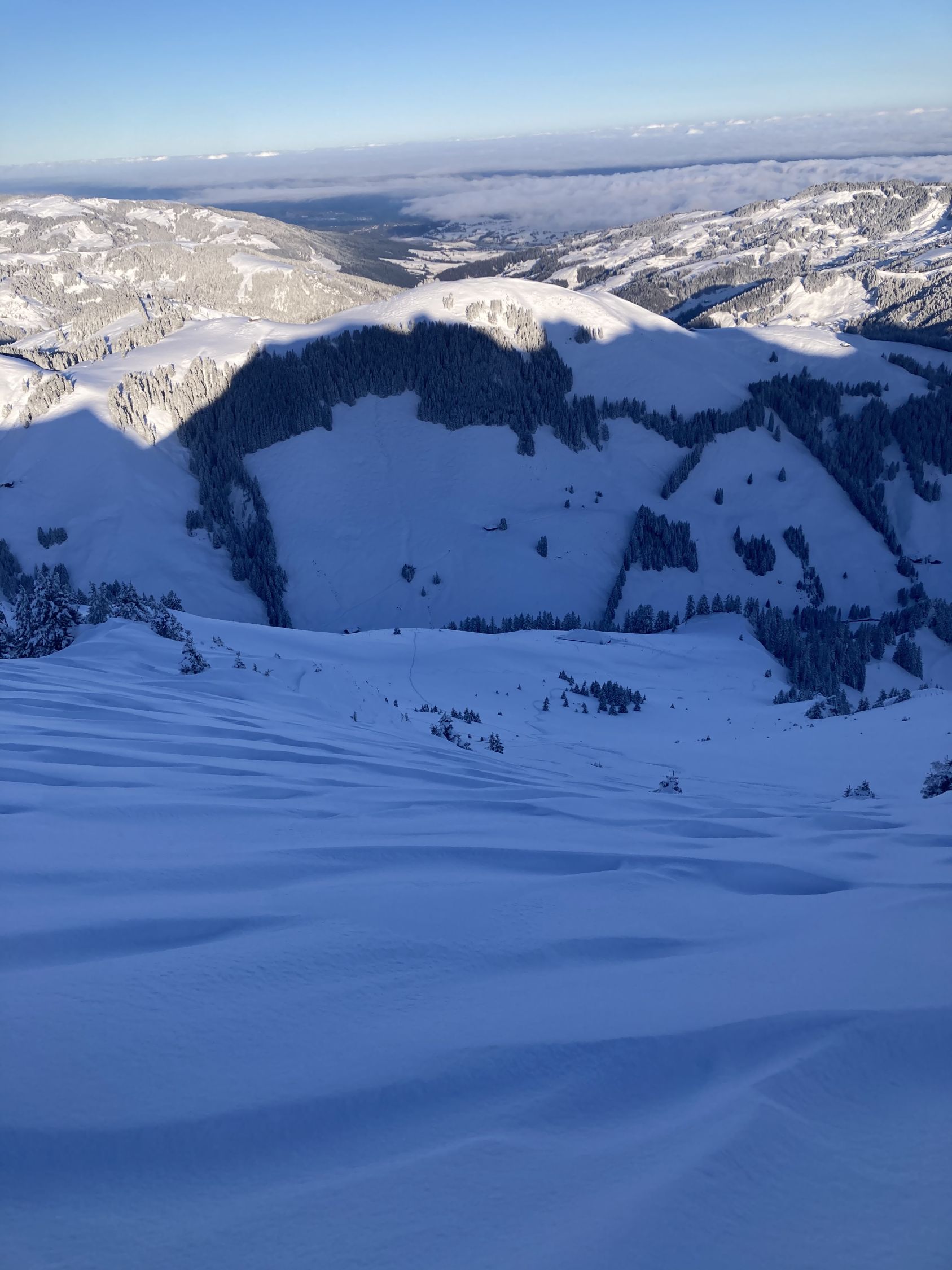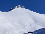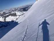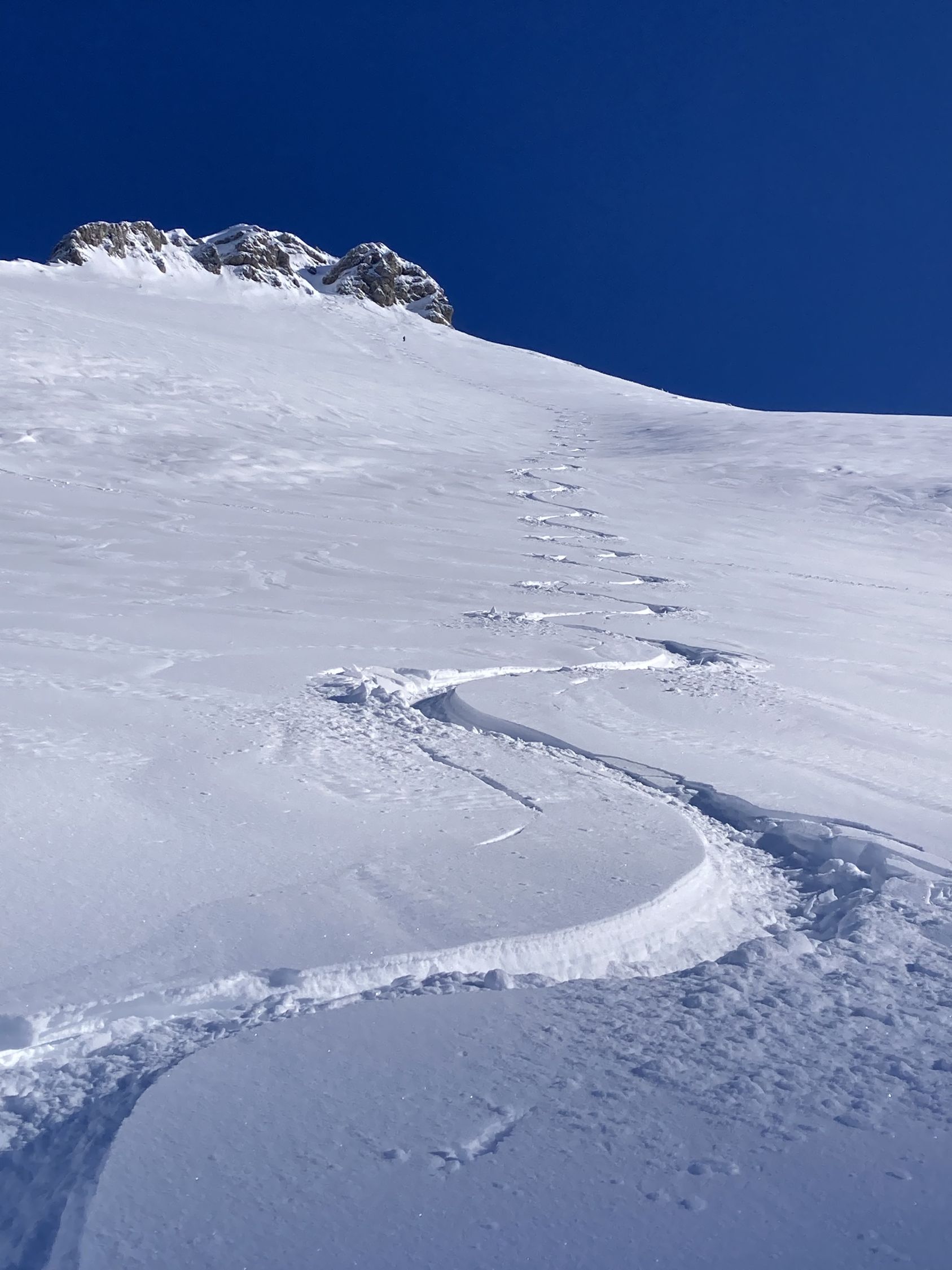 Ab Hengst fahrbar - Unterlage ab 1500m, darüber 30cm leicht gepresster Puder. Über 1900m schon Windeinfluss aber nirgends kritisch. Vom Skidepot bis Gipfel teils hüfttief gespurt, dafür Firstline vom Feinsten. Zum Einwärmen vorher noch Alpiglenmäre gemacht - auch top!