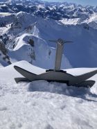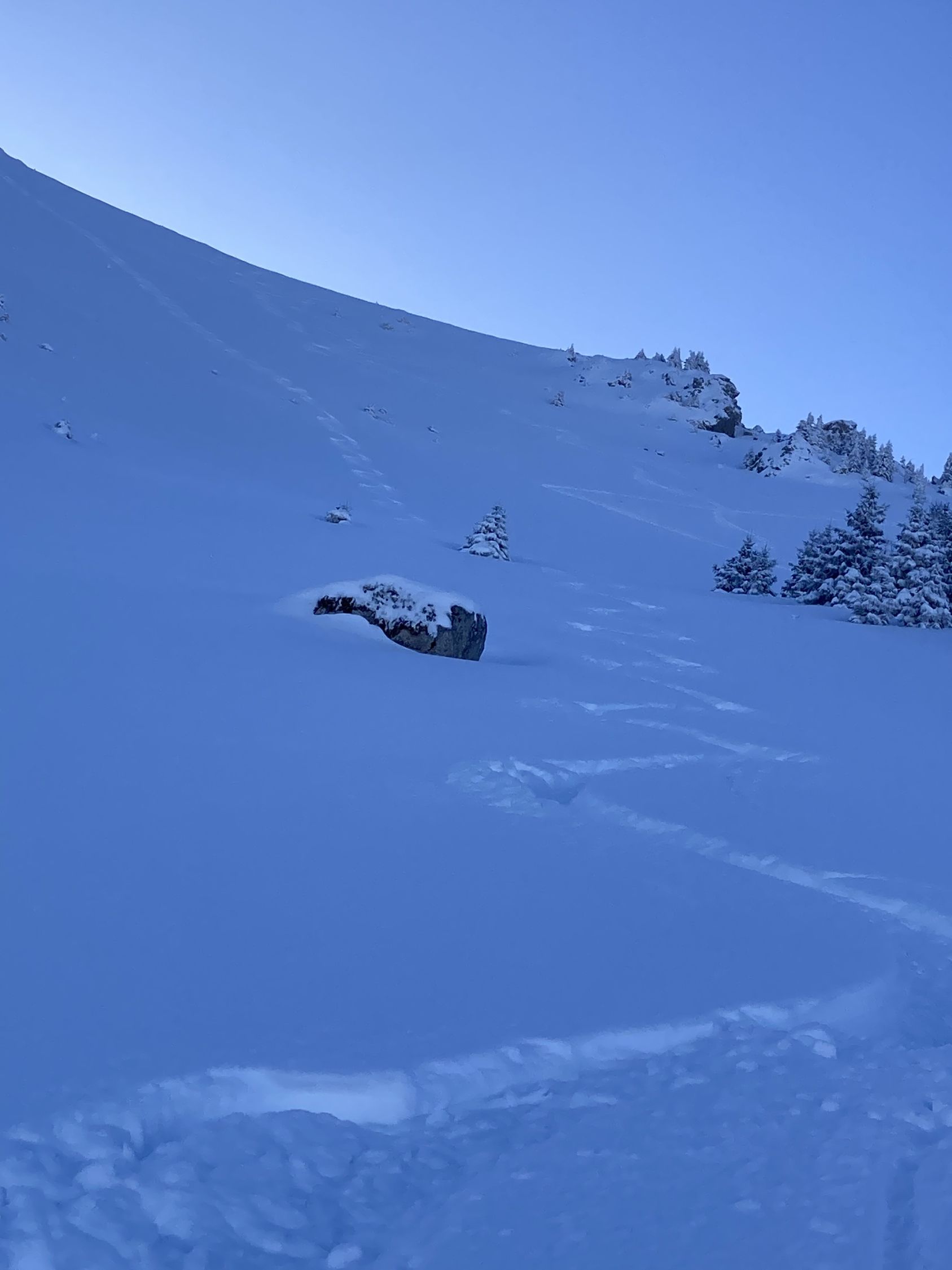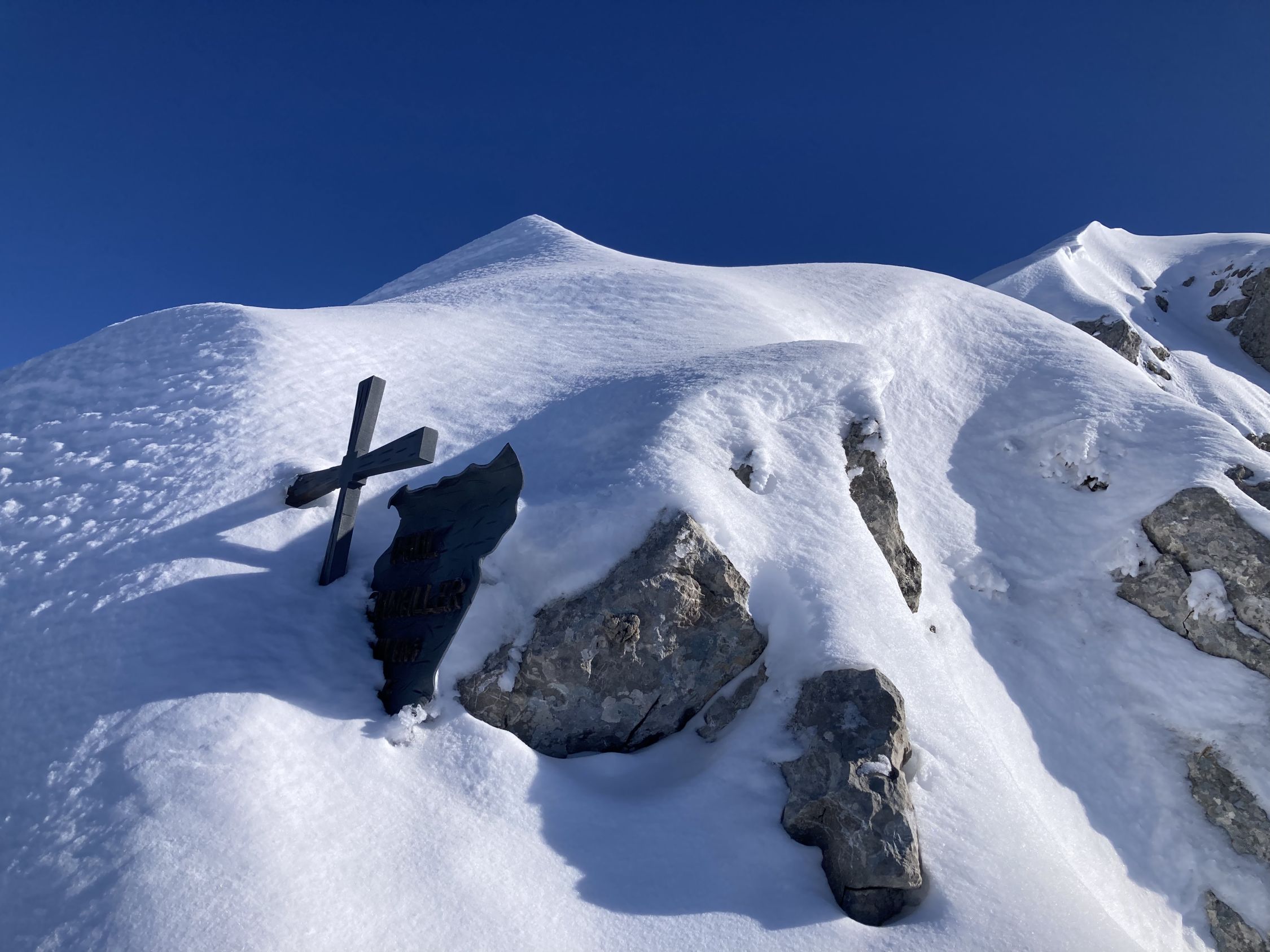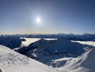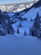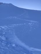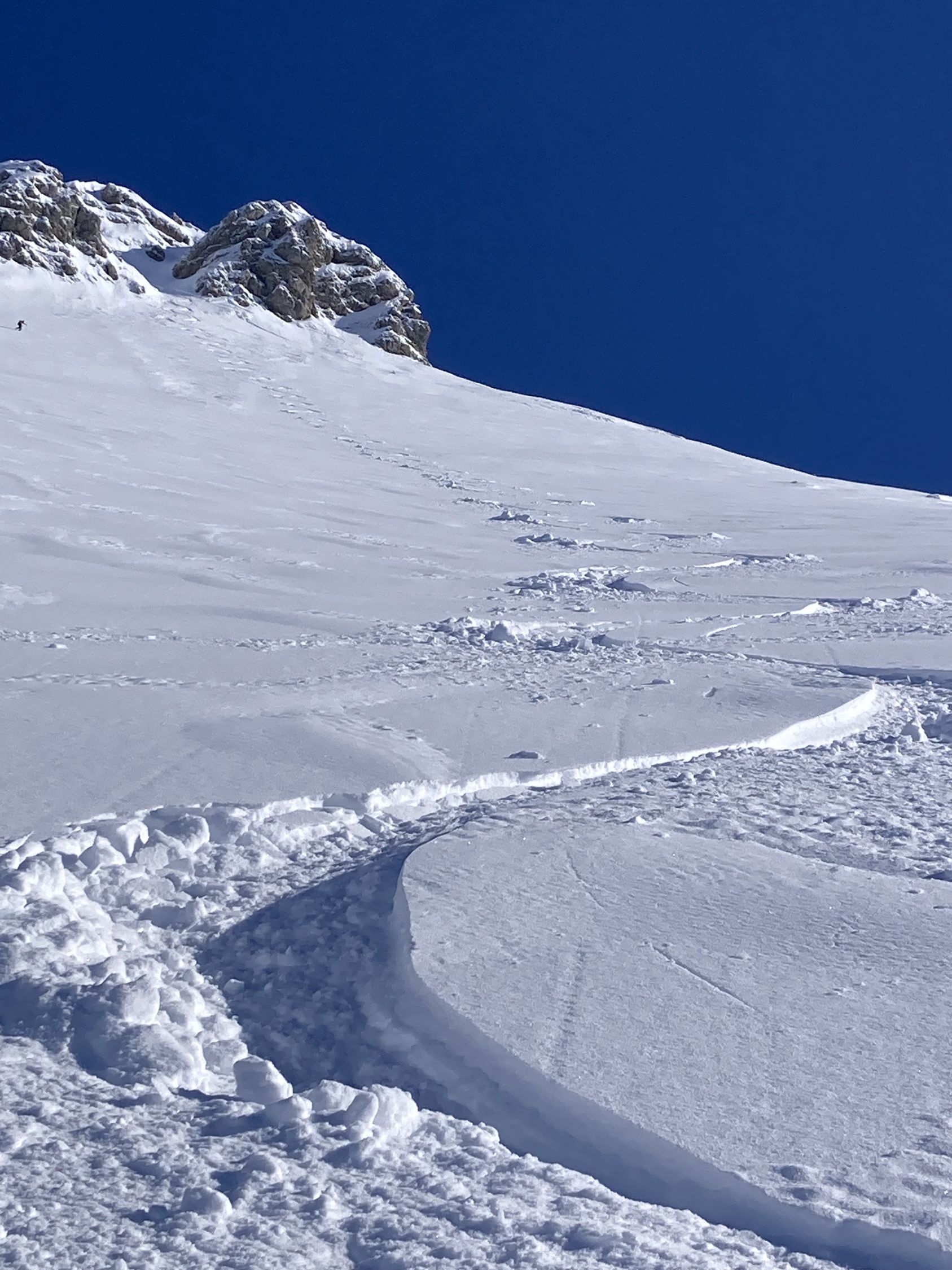 Ab Hengst fahrbar - Unterlage ab 1500m, darüber 30cm leicht gepresster Puder. Über 1900m schon Windeinfluss aber nirgends kritisch. Vom Skidepot bis Gipfel teils hüfttief gespurt, dafür Firstline vom Feinsten. Zum Einwärmen vorher noch Alpiglenmäre gemacht - auch top!