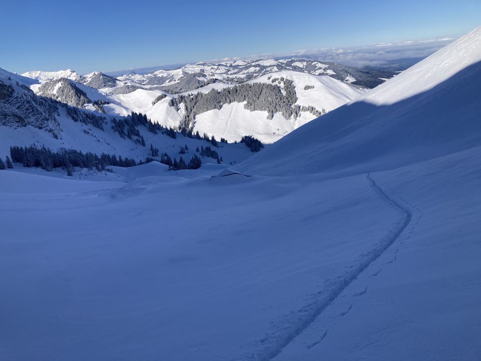 Ab Hengst fahrbar - Unterlage ab 1500m, darüber 30cm leicht gepresster Puder. Über 1900m schon Windeinfluss aber nirgends kritisch. Vom Skidepot bis Gipfel teils hüfttief gespurt, dafür Firstline vom Feinsten. Zum Einwärmen vorher noch Alpiglenmäre gemacht - auch top!