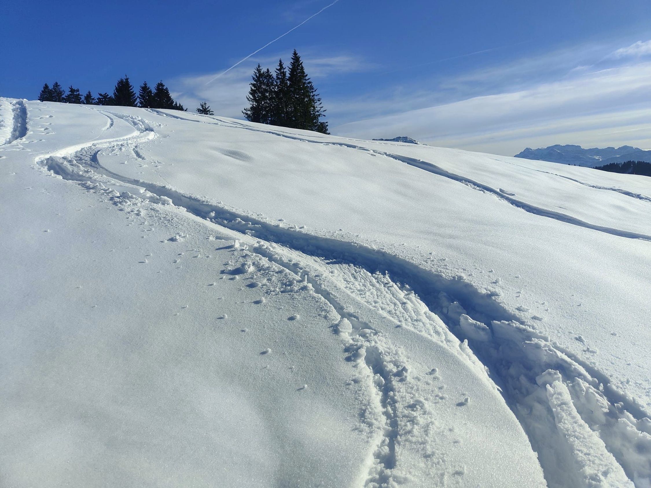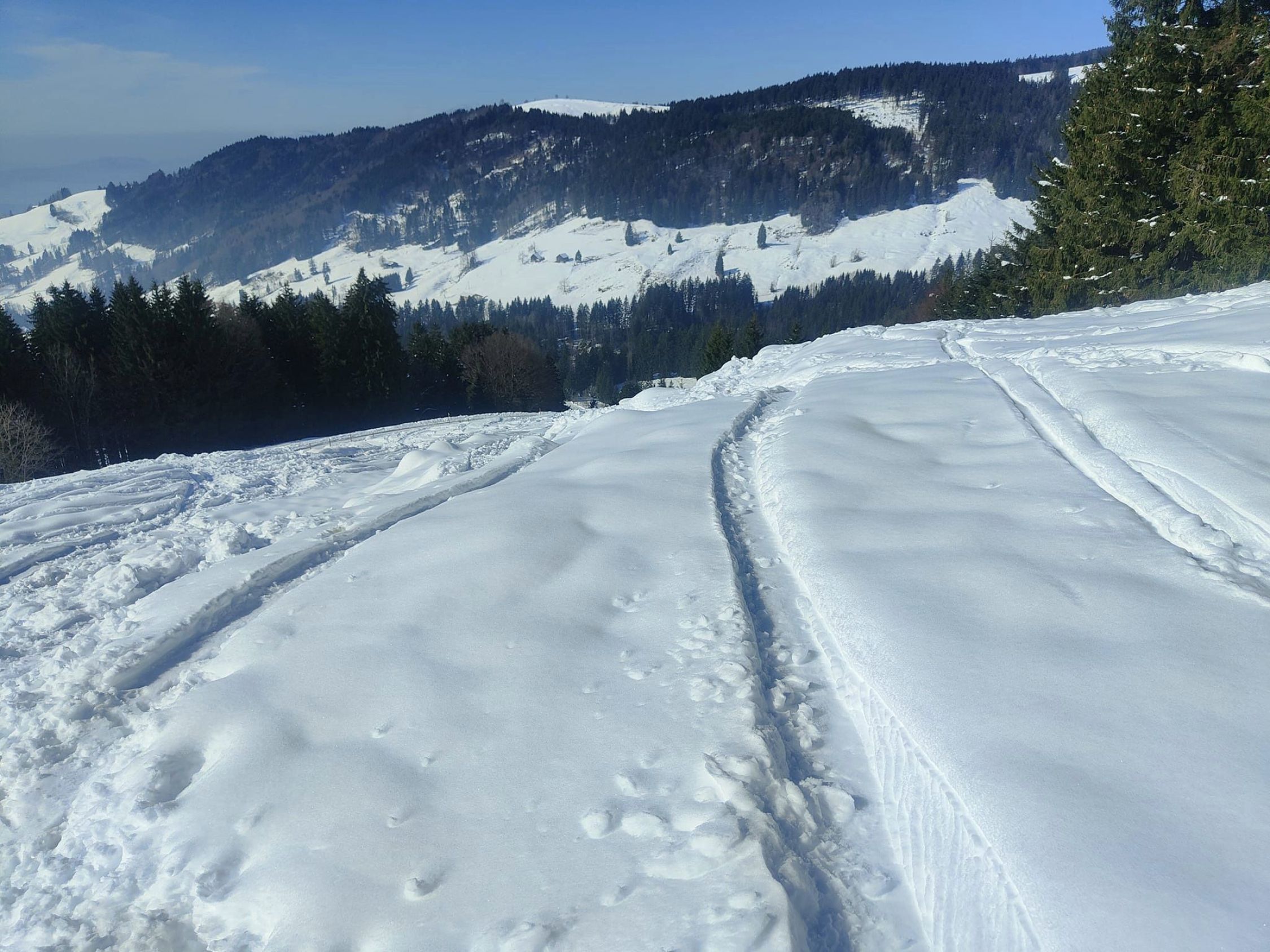 Es hat reichlich Schnee gegeben, bis zu 30cm. Dieser fiel aber auf einen viel zu warmen Boden und die Temperatur beim Parkplatz 11Grad! Dank des vielen Schnees, geht es einigermassen ohne Steinkontakt trotz fehlender Unterlage. Die Abfahrt war mehr mühsam, als Genuss und nur wenige schöne Schwünge möglich.