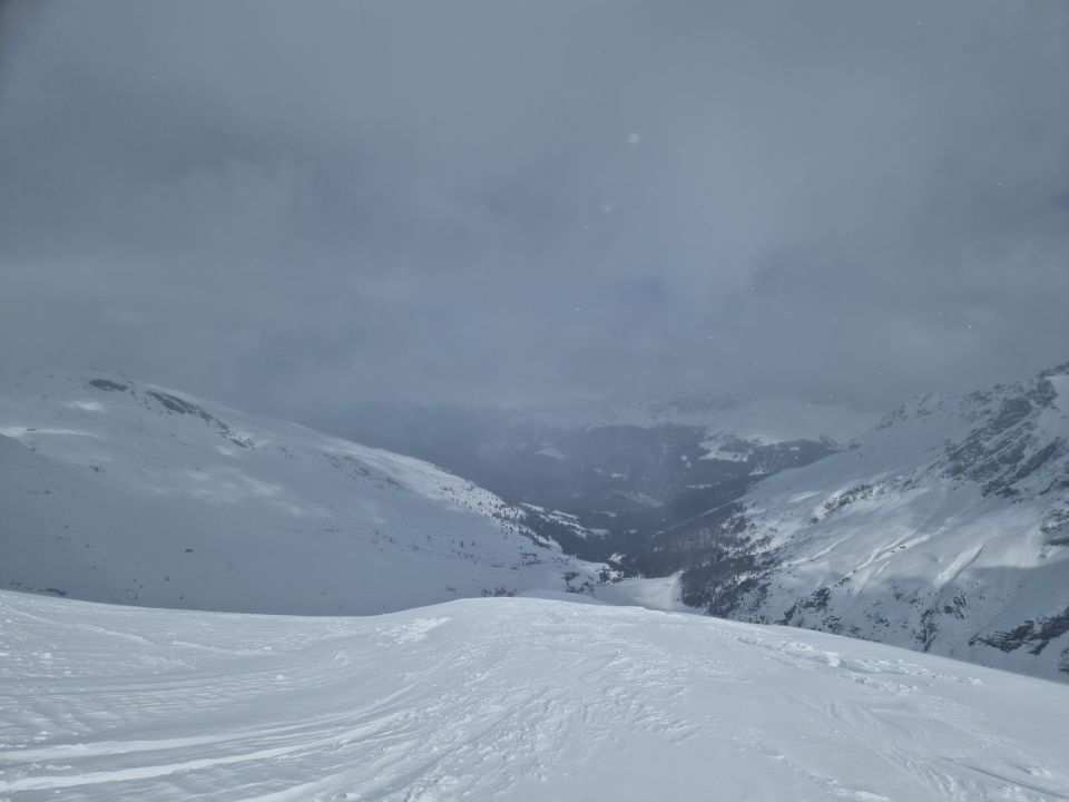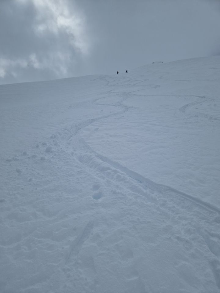 Wir sind mit der Bahn die ersten 2 Sektionen rauf und dann dem Vierbeiner zu Liebe (3. Sektion = Sessellift) via Winterwanderg/ Schlittelpiste/ Abfahrt nach Radons. Von dort bei starkem Wind und teils diffuser Sicht auf den Piz Mez, vom gestrigen Betrieb waren - dem Wind und Triebschnee sei Dank - nur noch im untersten Bereich Abfahrtsspuren zu sehen. Im Aufstieg war dann die schon gezogene Aufstiegsspur teils auch schon wieder zugeweht. Wir haben auf 2650 abgefellt, andere sind aber noch ganz hinauf. Pünktlich zu unserer Abfahrt kam ein ausgiebiges Sonnenfenster über das Gebiet so dass wir die sanft abfallenden Hänge des Piz Mez von oben bis nach Radons geniessen konnten!