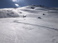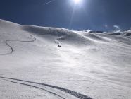 feinster Pulverschnee bei milden Temperaturen; dadurch beginnt langsam die Schneeumwandlung. Am Gipfel Föhnwind. Es gibt noch genügend freie Abfahrtsspuren.