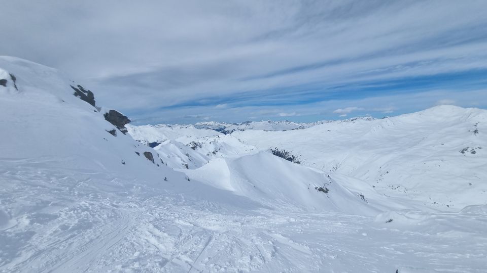 In der Abfahrt nord- und ostseitig noch perfekter Pulver, oben noch mit genügend Platz für eigene Spuren.