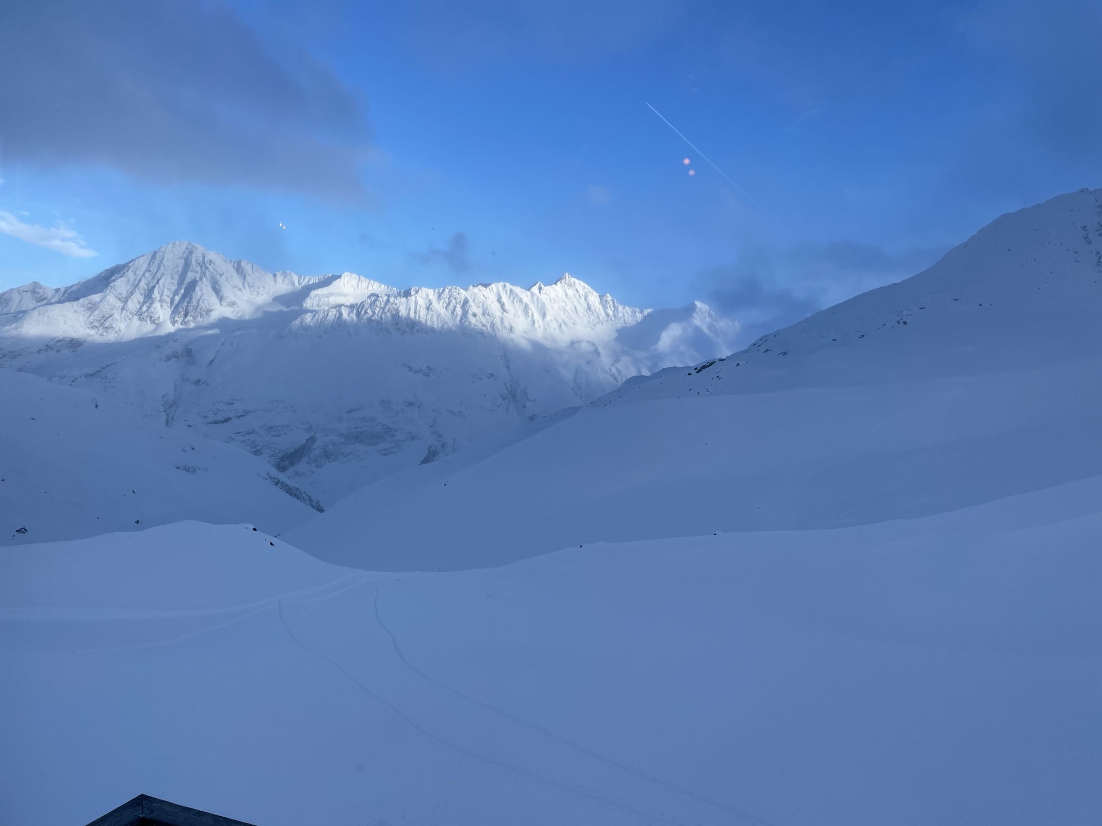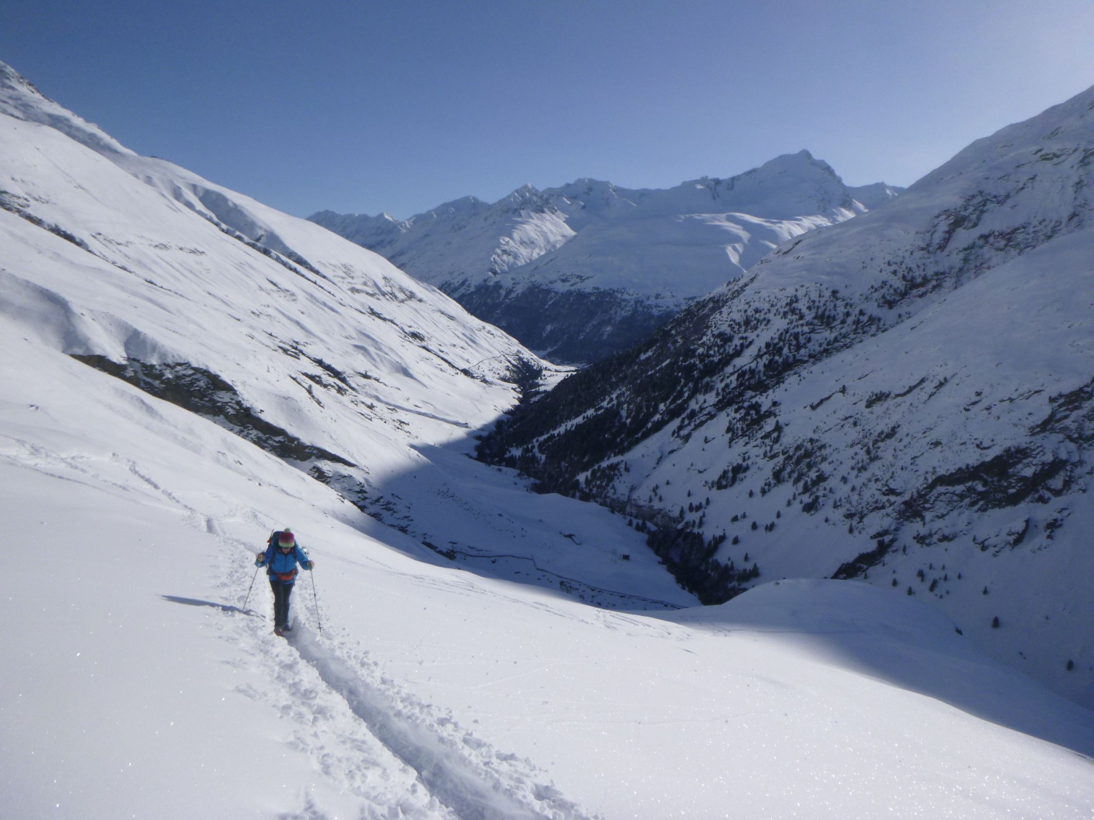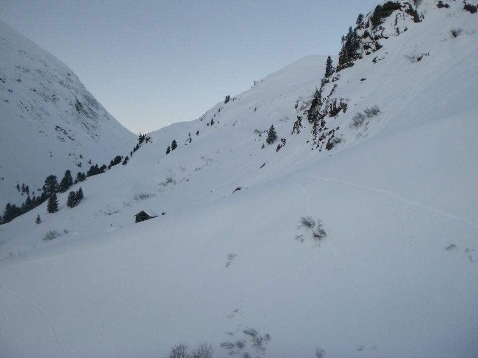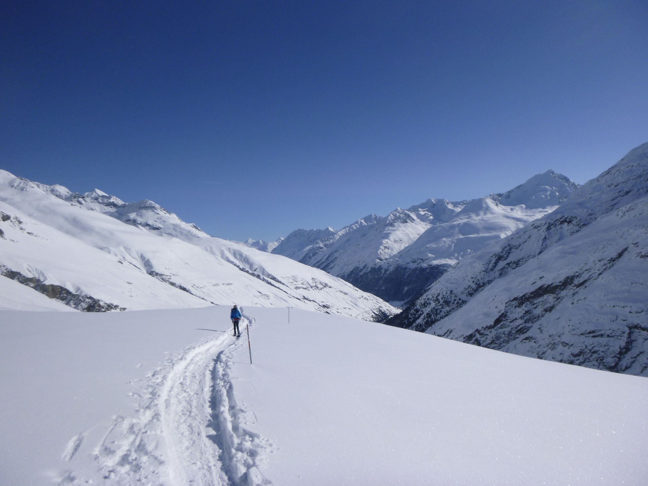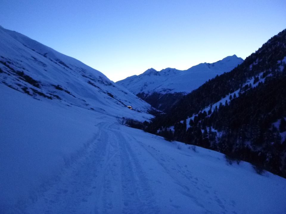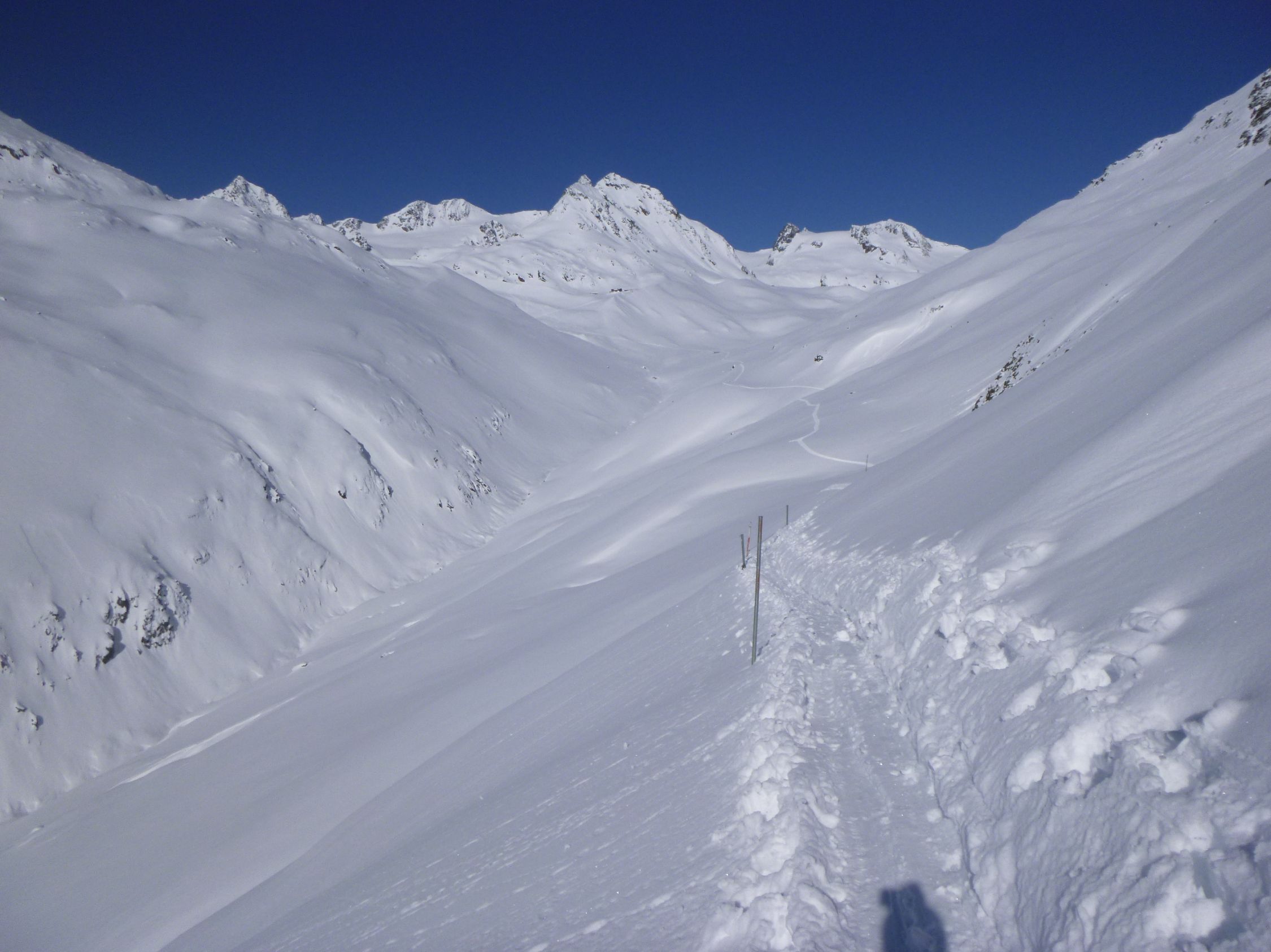 Tourenbeginn um 06:00 Uhr. Rofenstraße ist geräumt bis Rofenhöfe. Ab der Schranke dann auf einer frischen Schneemobil-Spur bis zur Rofenalm. Von dort durch 30 cm tiefen Pulverschnee. Eine frische Skispur war vorhanden von den Helfern, welche die Vernagthütte vom vielen Schnee freifrästen und seit Mittwoch begannen, für den Winterbetrieb ab morgen in Gang zu setzen.