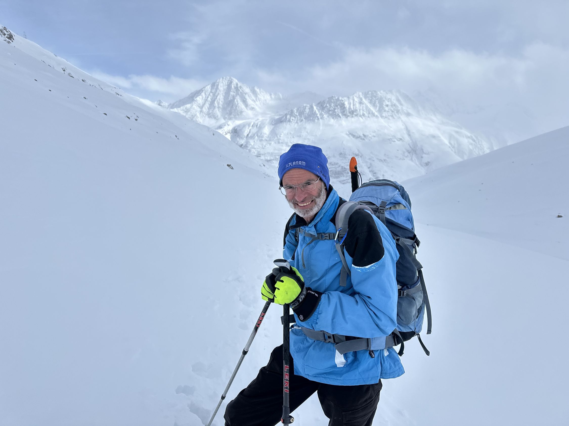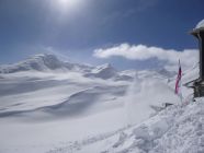 Ursprünglich wollten wir zum Hochjoch-Hospiz über die Skiroute durch die Schlucht der Rofen-Ache (Im Sommer Cyprian-Granbichler-Weg). Die Route war noch nicht gespurt. Jedoch nach der 4. Markierungsstange drehten wir an erster Engstelle am Felswandl um. Dort wollten wir nicht fast 40° steilen Hang traversieren, der windverfrachtet war und oberhalb einen Anriss hatte. War uns zu heikel. Insofern disponierten wir um und stiegen auf in Richtung Vernagthütte, in der Hoffnung auf der Winterroute über Mittlere Guslarspitze zum geöffneten Hochjoch-Hospiz zu gelangen. Schlimmstenfalls erst mal im Winterraum der Vernagthütte zu übernachten, falls der Aufstieg über den Weißkamm zu spuren wäre. Zu unserer angenehmen Überraschung liefen auf der Vernagthütte bereits schon alle Vorbereitungen. Die Hüttenwirtin war bereits mit den Helfern von der AV-Sektion und aus dem Tal seit 2 Tagen zugange zwecks Eröffnung der Wintersaison dort ab morgen. Freundlicherweise beherbergte engagierte Hütten-Chefin Sophie auch uns vorzüglich im großen Haus. Vielen Dank !