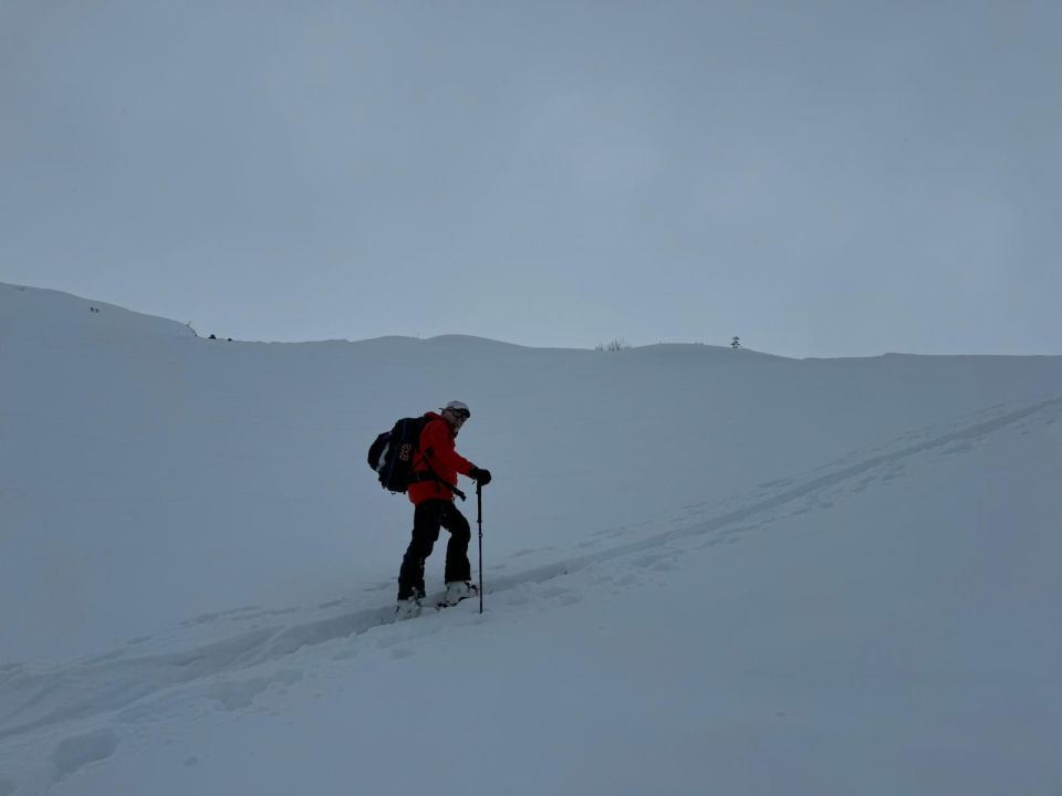 Als wir zum Wegweiser auf ca 2370 kamen, d.h. unter dem Gipfelhang, war die Sicht miserabel. Wir gingen nicht mehr weiter und machten uns bereit zum Abfahren. Plötzlich drückte die Sonne und wir beschlossen, zu warten (schlechter konnte es nicht werden) und siehe da, der Nebel verschwand und wir hatten herrliche Sicht und tollen Pulver, auf der gesamten Abfahrt.