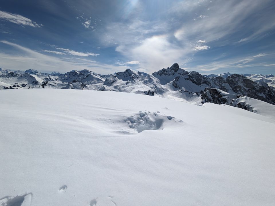 Abfahrt am Gipfelhang auf harter tragender Unterlage mit leichtem Sulz, der im Verlauf dann etwas schwerer wird.