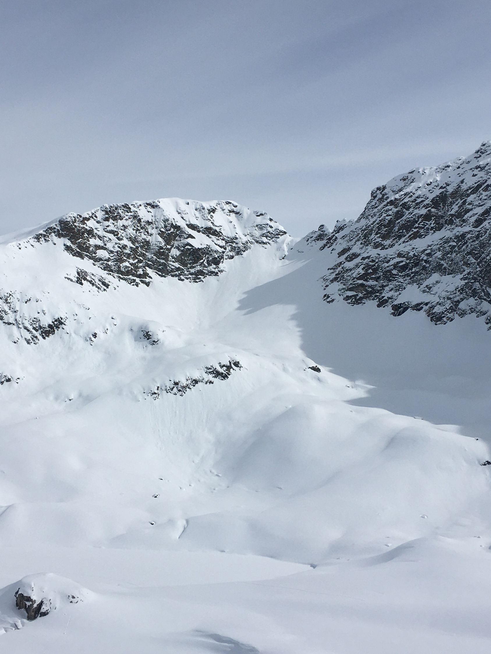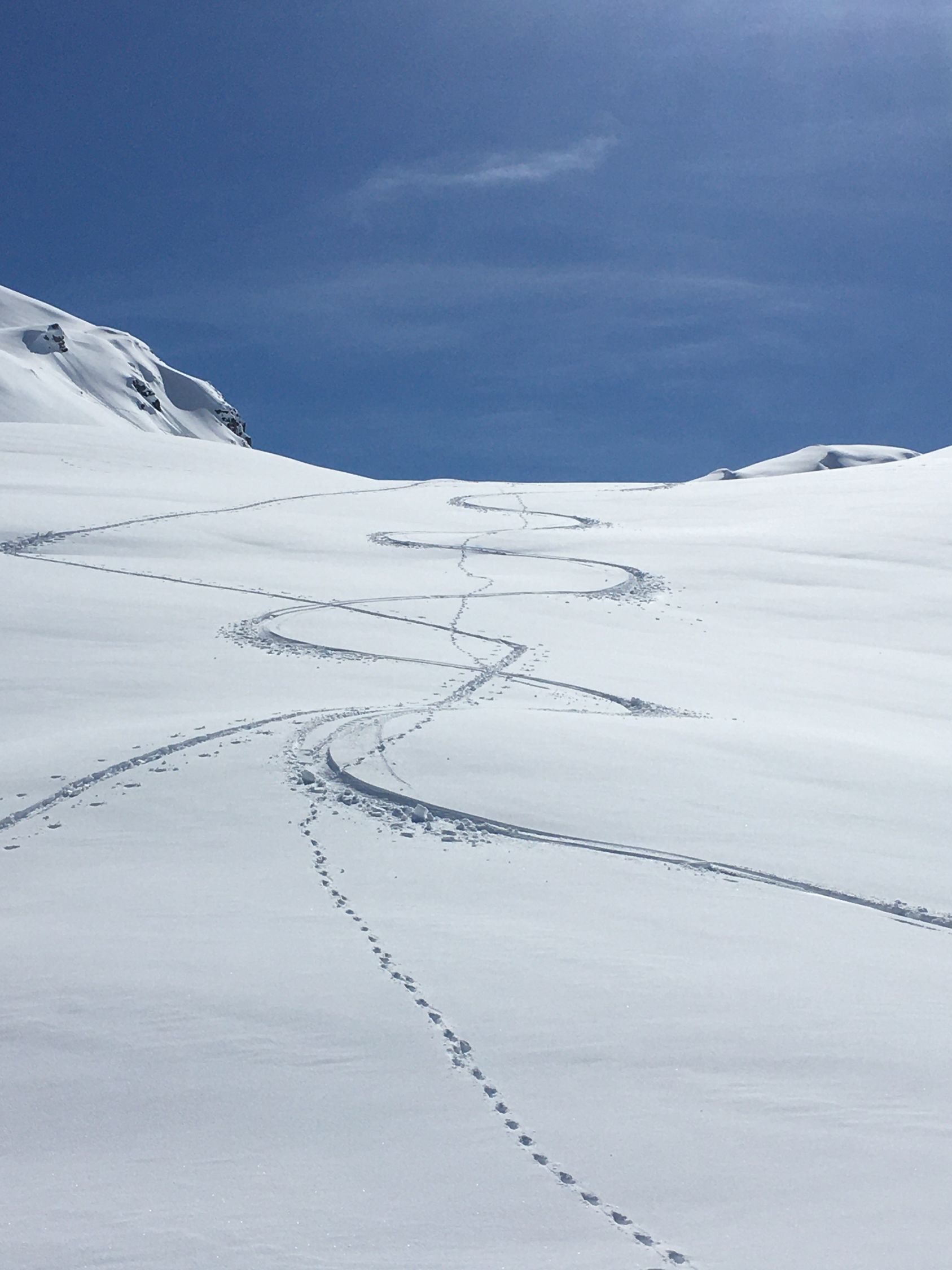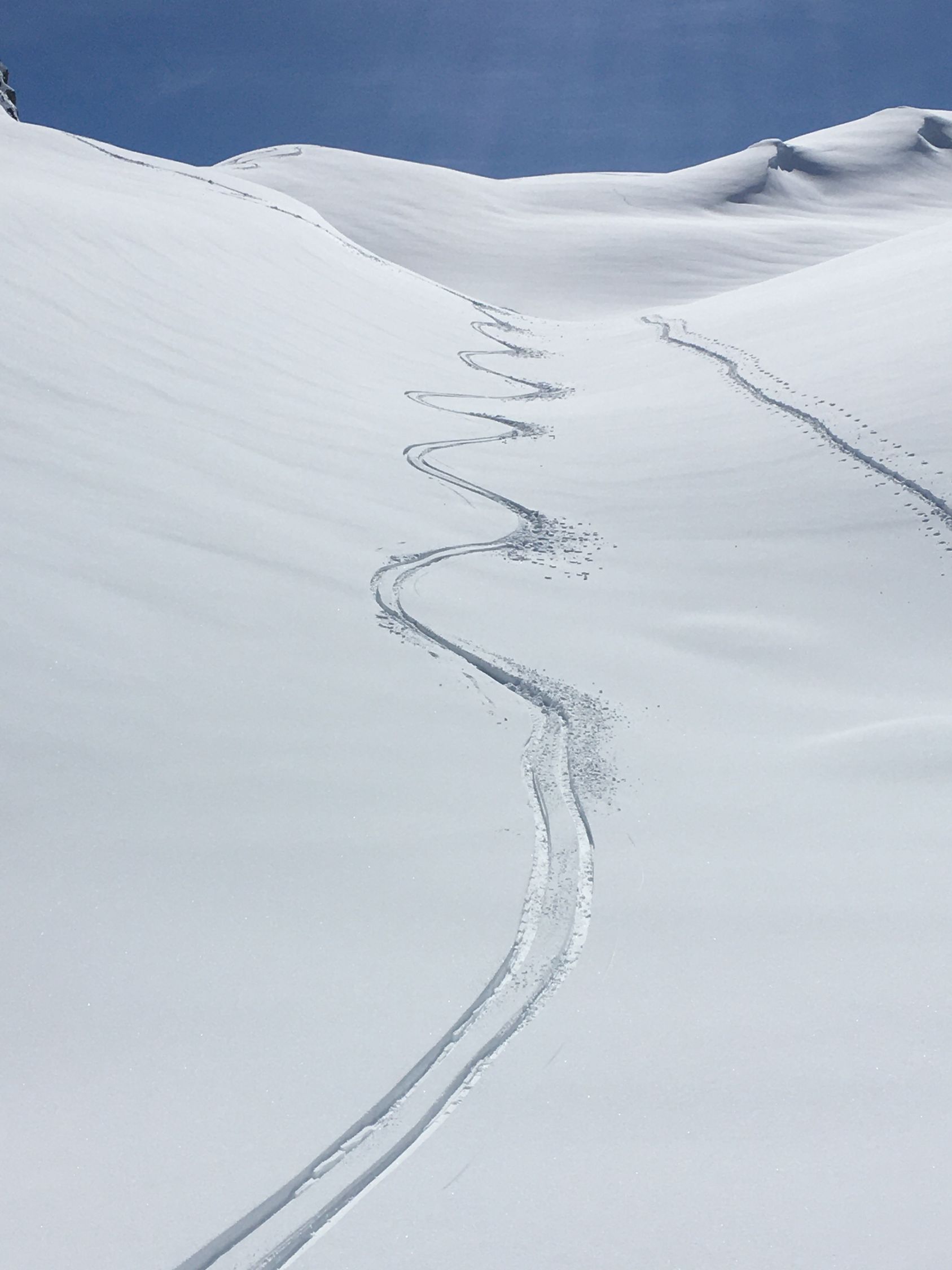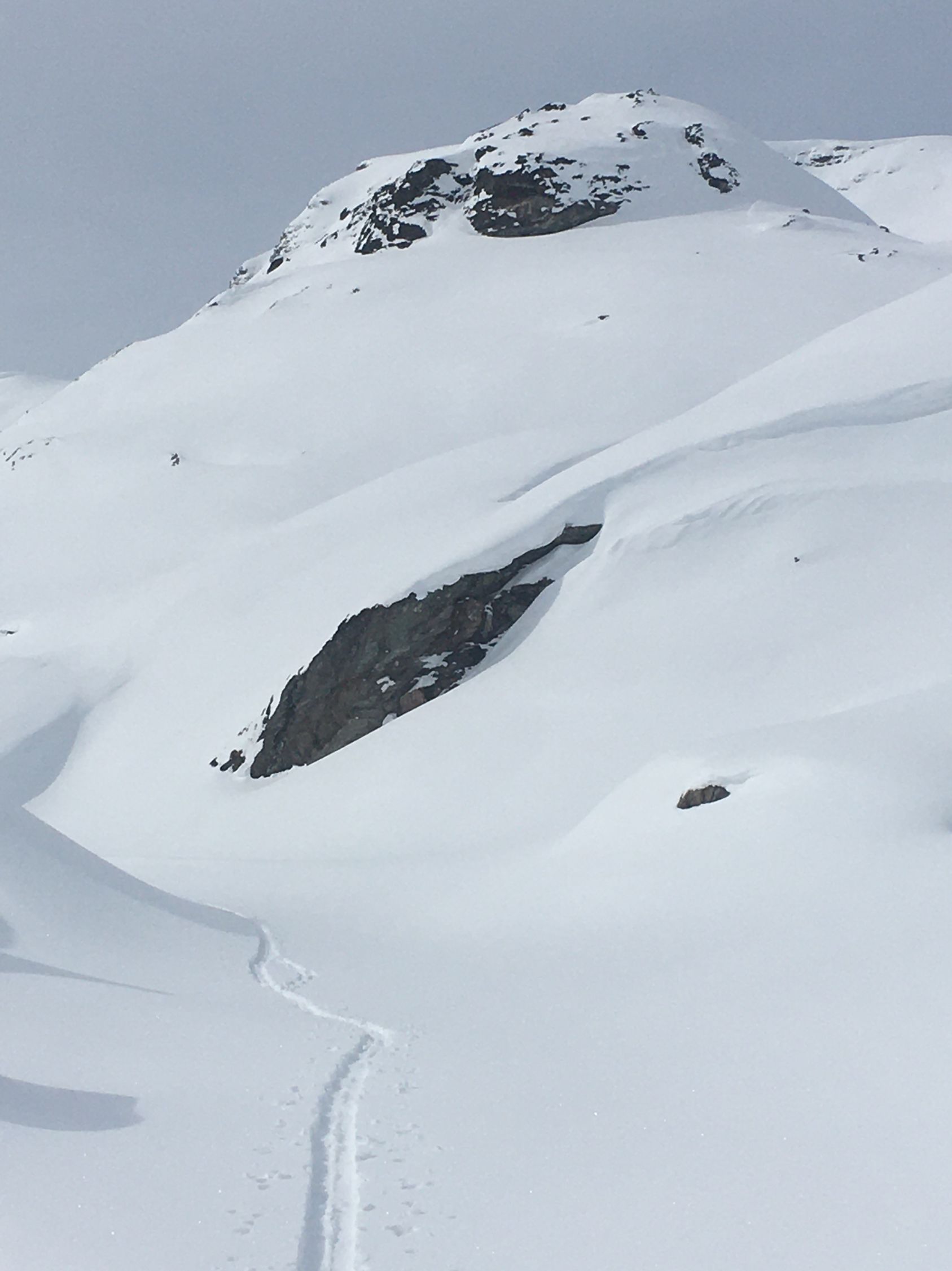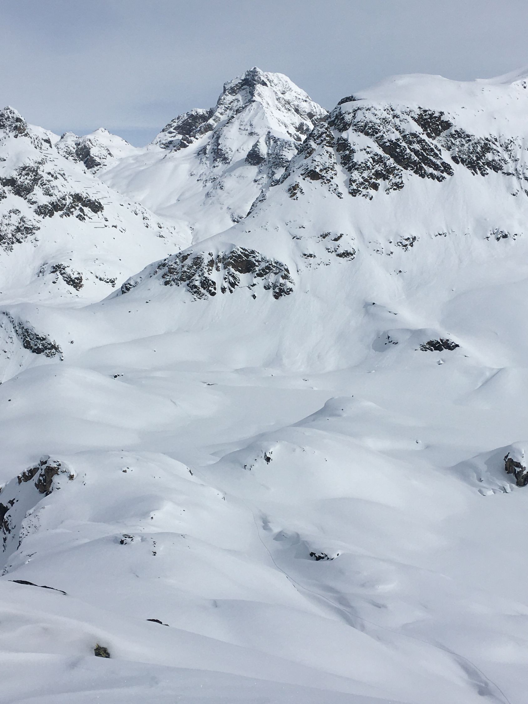 Kurze Tour auf den Felskopf P. 2581 nahe steile Ostflanke Piz Emmat Dadora. Start La Veduta 8.30 Uhr, minus 2 Grad, Schleierwolken, windstill. Wunderschöne unberührte Nordflanke Punkt 2549. Spuren wie auf weichem Teppich! Bei Leg Grevasalvas 2390 m überholten mich vier junge Tourengänger welche mir eine schöne Spur legten bis Abzweigung Emmat Dadora. Die vier hatten Ziel Fuorcla d‘Emmat 2755 m. Ich spurte noch das Steilstück um den Gipfelfelsen zu Punkt 2581. Zu meiner Überraschung spurte noch ein Einzelgänger die steile Ostflanke hoch auf den Rücken Piz Emmat Dadora. Er erreichte zu meiner Erleichterung den Rücken. Abfahrt auf Aufstiegsroute, etwas feuchter Pulverschnee aber schön zu fahren. Am schönsten war die Nordflanke ab P. 2549 zur Veduta, perfekte Verhältnisse und keine Spuren!