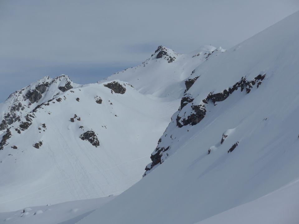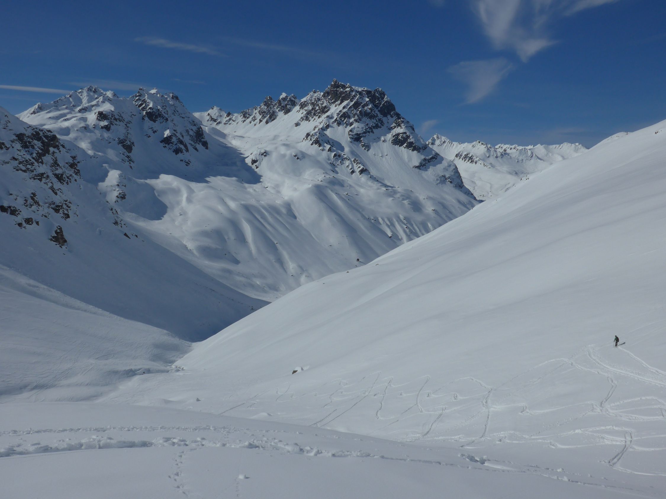 Eigentlich hatten wir nach dem Schneefall gestern auf Pulverschnee gehofft. Beim Aufstieg stellten wir dann aber enttäuscht fest, dass auch über 2000 m Höhe der Schnee einen Deckel hat und machten uns auf eine Abfahrt bei Bruchharsch gefasst. Die milden Temperaturen und die Märzsonne weichten dann aber den Harschdeckel auf, so dass die Abfahrt doch ein Genuß war. Zusammen mit der grandiosen Aussicht, dem sonnigen Wetter und den angenehmen Temperaturen eine sehr schöne Tour