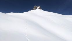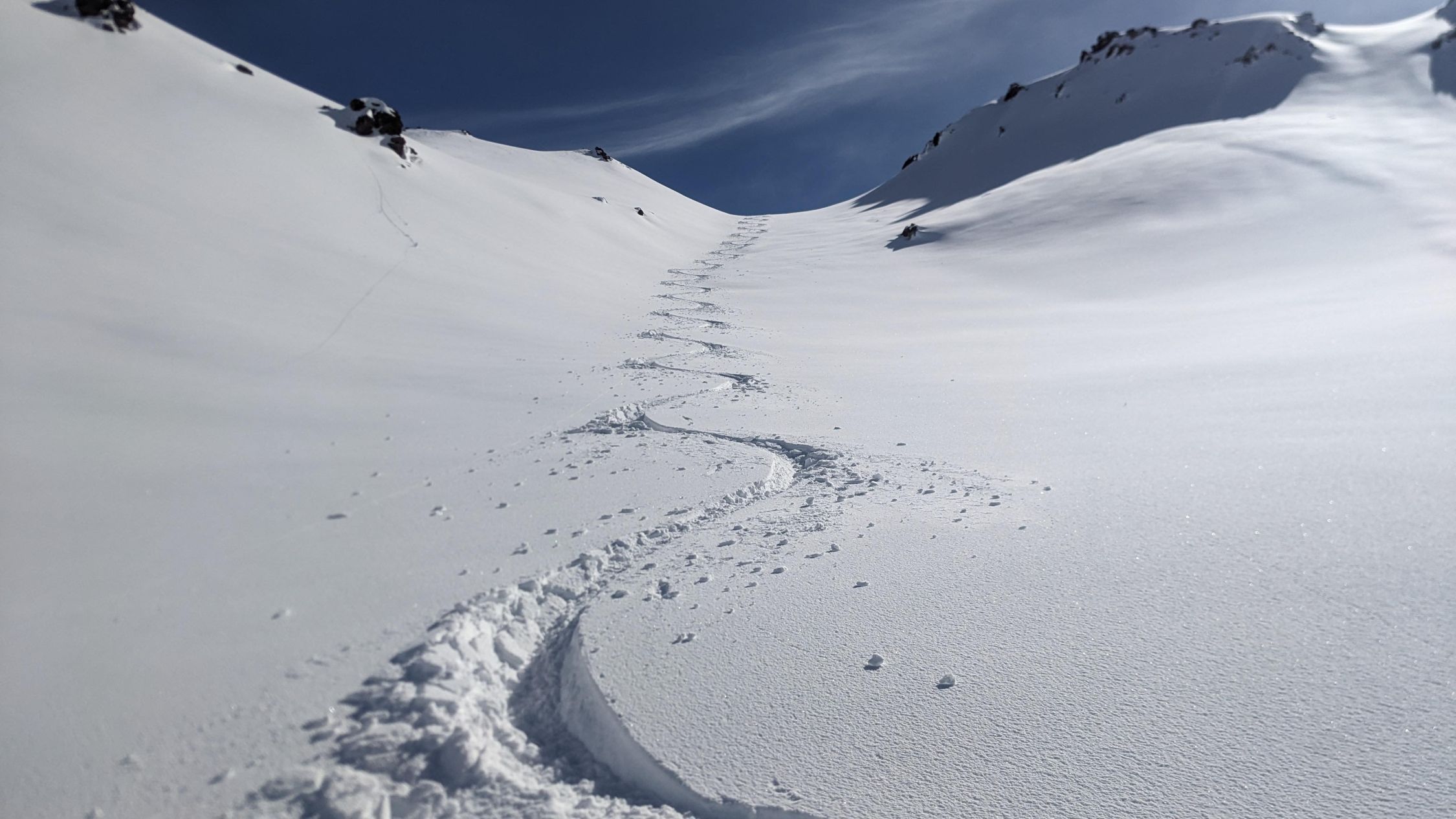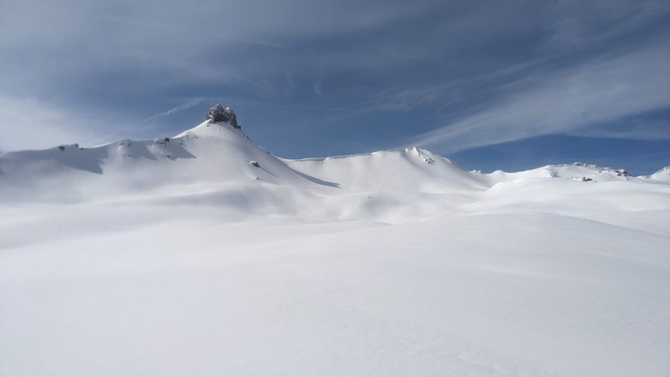 Abfahrt über den Osthang dann ein erstes Highlight. Kein Fluffy Powder, aber gut drehbarer, feuchter Schnee ohne Deckel. Dann sehr einsam und spurend von SE zum Wissmeilen. Abfahrt über die Nordflanke dann richtig genial, auch weiter unten war die krustige Schicht inzwischen durch Strahlung und Wärme aufgeweicht.