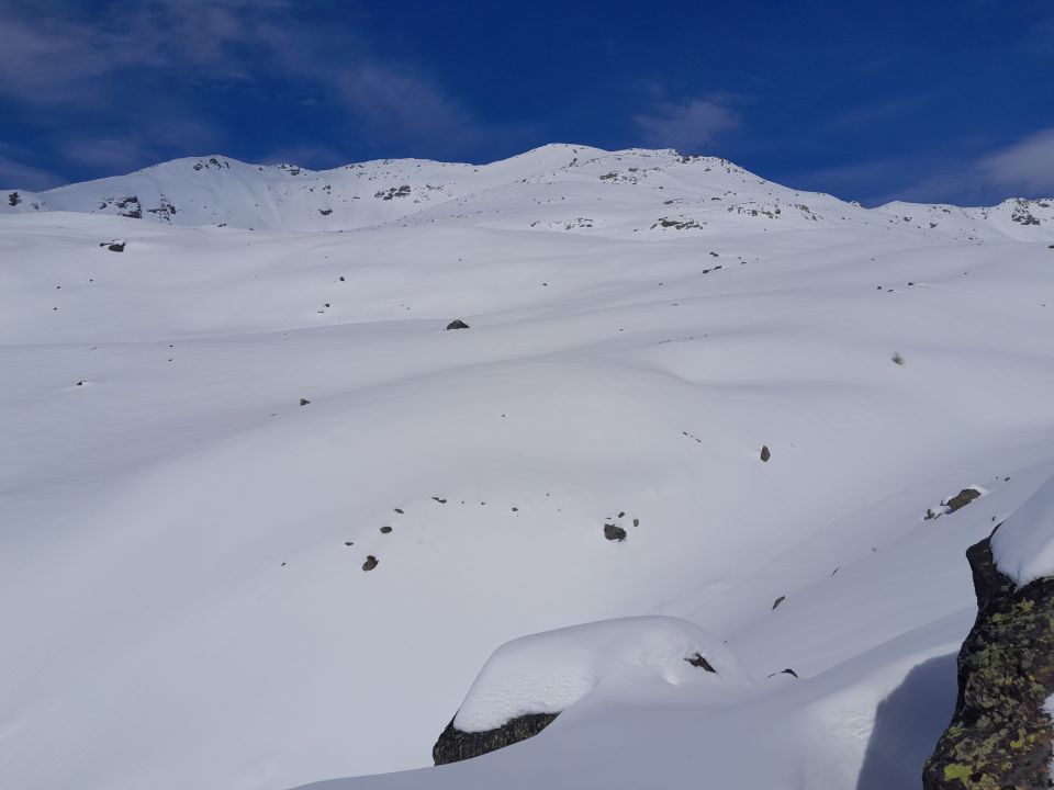 Heute noch Aufstieg im Schnee und Abfahrt möglich bis zur Bushaltestelle möglich. Das ist morgen wahrscheinlich nicht mehr machbar, da der Schnee über den Tag schnell geschmolzen ist. Die Hälfte der Forststraße war vom Pistenbulli gespurt, danach dann mühesames Spuren im tiefen Nassschnee. Entscheidung umzukehren, da zu langsam unterwegs. Der Gipfelhang des Mattwaldhorns sah gut machbar aus, auch wenn viele Felsen sichtbar waren.