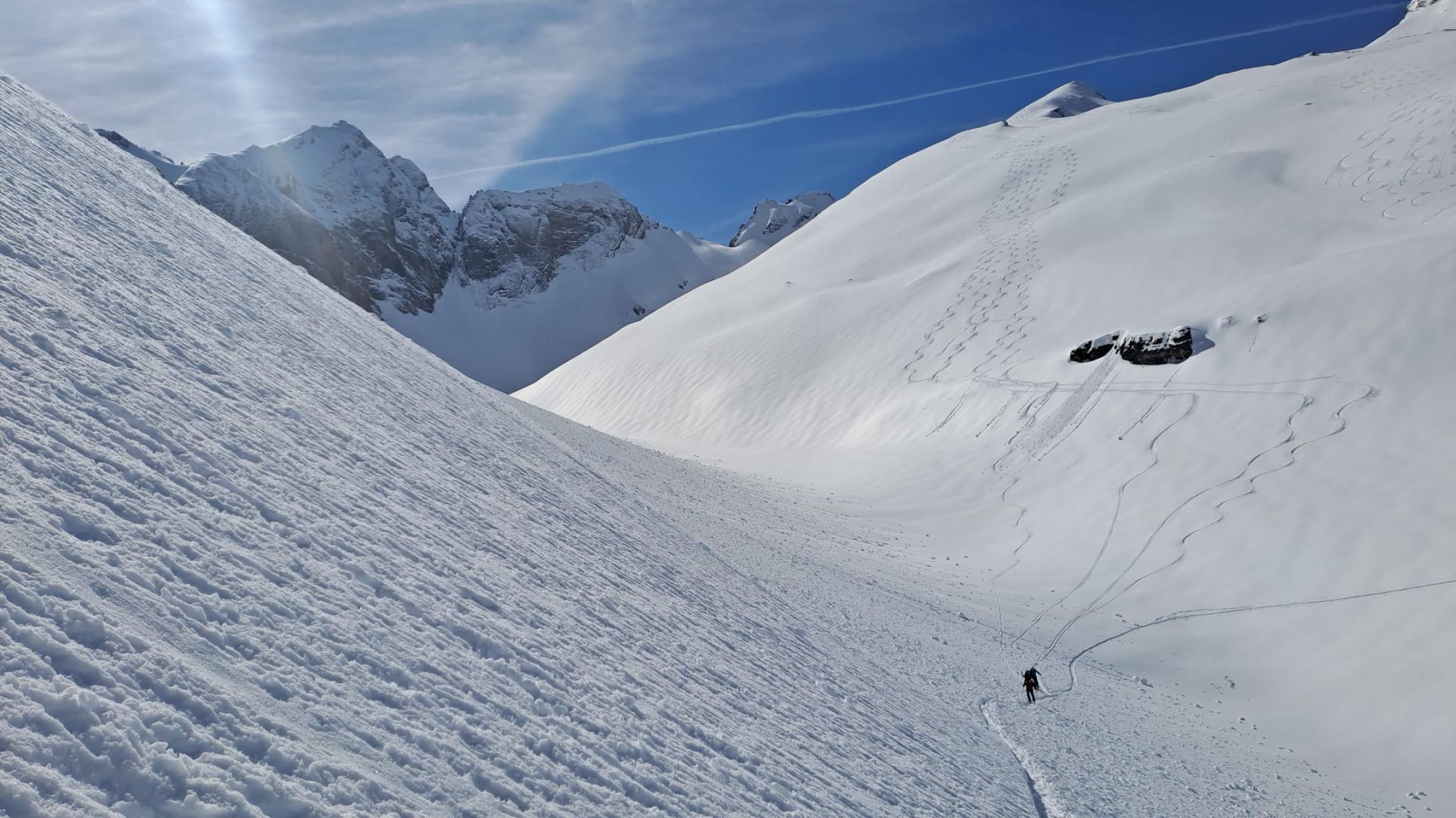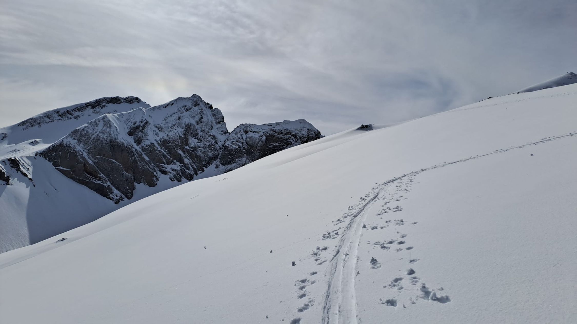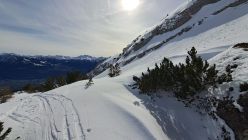 Der Neuschnee des Vortages hat gereicht, um direkt vom Parkplatz loszugehen. Ab 1500 m auch gute Unterlage. Isisizgrat gut abzufahren, nur ein paar Brocken von den Lockerschneerutschen des Vortages. Pulver hat es nicht, es war vermutl. schon am Vortag zu warm und somit über Nacht ein tlw. Deckel entstanden, der aber gut getragen hat. Bei der Abfahrt schon weich genug, um genussvoll abzufahren. Erst unterhalb ca. 1700 m dann sehr weich und schwerer zu fahren.