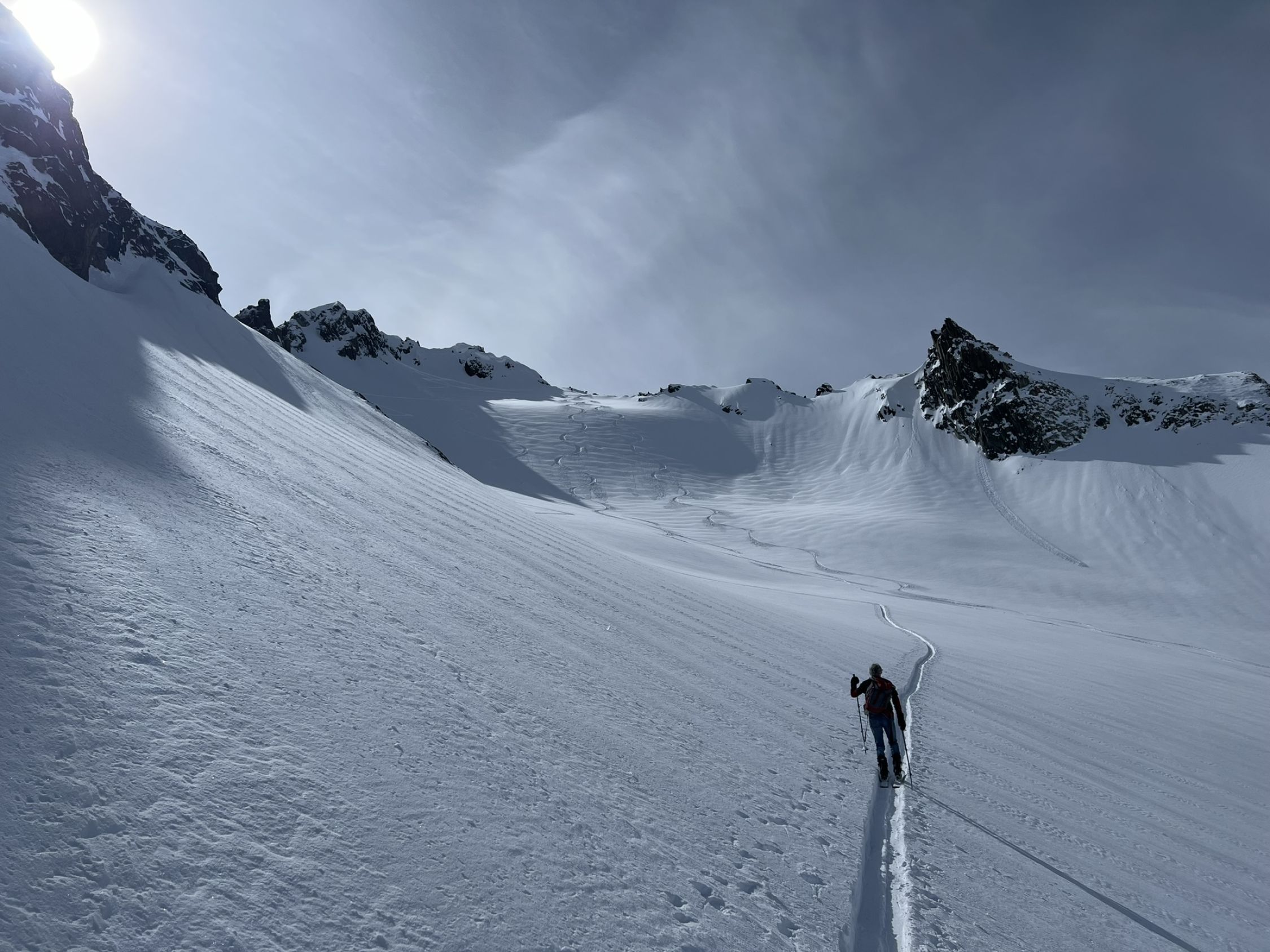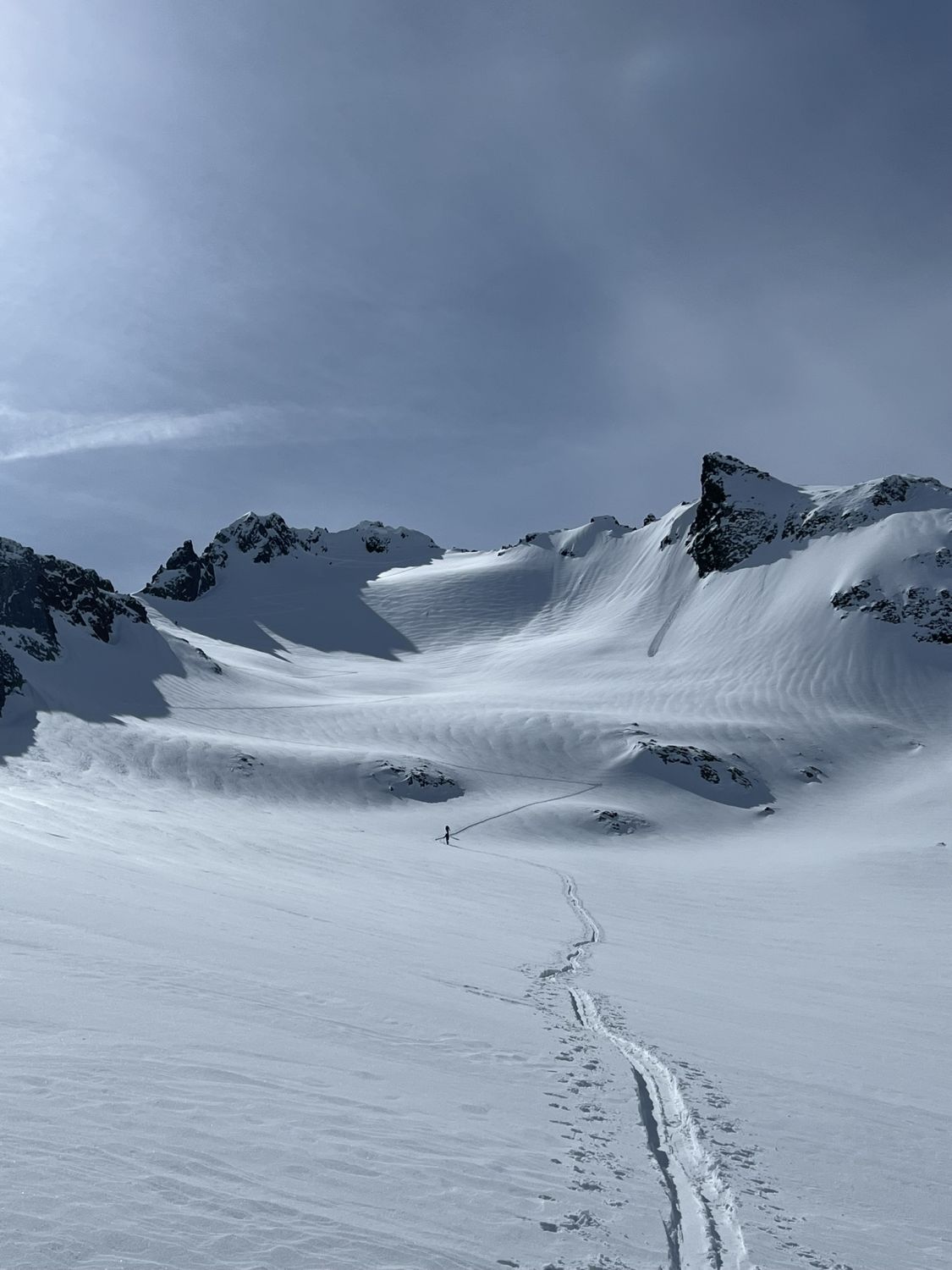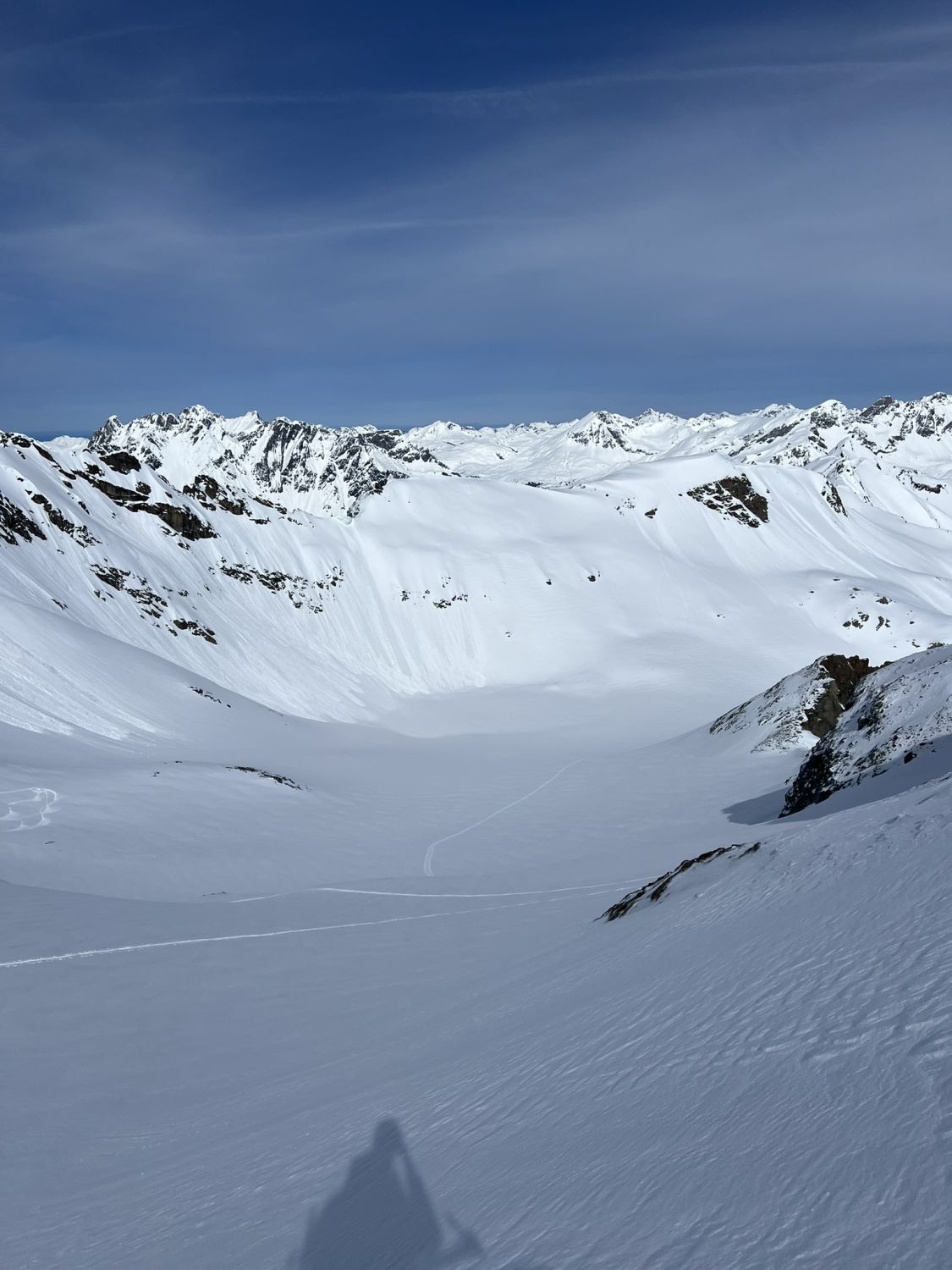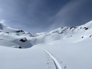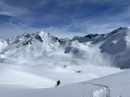 Start um 8.30 Uhr in Stuben über die Piste hinauf zum Albonagrat und weiter Richtung Marioköpfe. Abfahrt Richtung Kaltenbergalpe schon etwas "nass", aber noch gut fahrbar. Beim Aufstieg Richtung Kaltenbergsee war es teilweise windstill und dann schon sehr heiß in der Sonne. Hier ein Dankeschön an die Herren, die alles gespurt haben. Trotz etwas nassem Schnee war der Aufstieg ohne "Stollen" problemlos möglich. Im Gipfelhang ca. 20cm Neuschnee vom Vortag, schon etwas schwer aber noch sehr gut zu fahren. Aufstieg zum Gipfelkreuz nicht ganz einfach, da das Seil auf den letzten 3 Metern eingeschneit war. Abfahrt über die gleiche Route und dann wieder hinauf zum Maroikopf. Insgesamt waren 10 Tourengeher unterwegs. Das Wetter war noch besser als vorhergesagt, alles in allem ein super Tag.