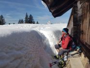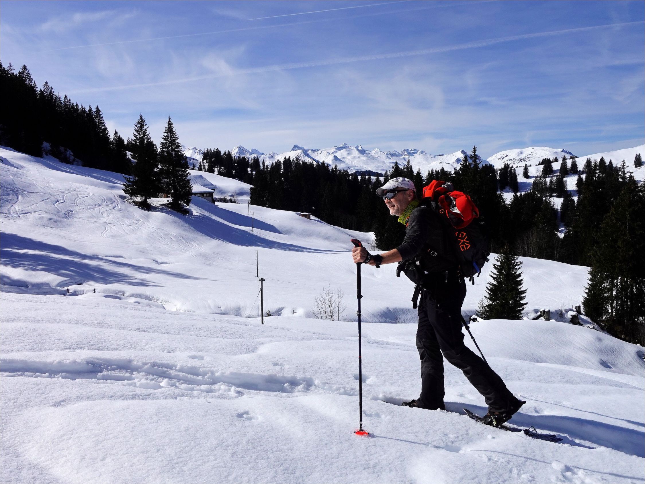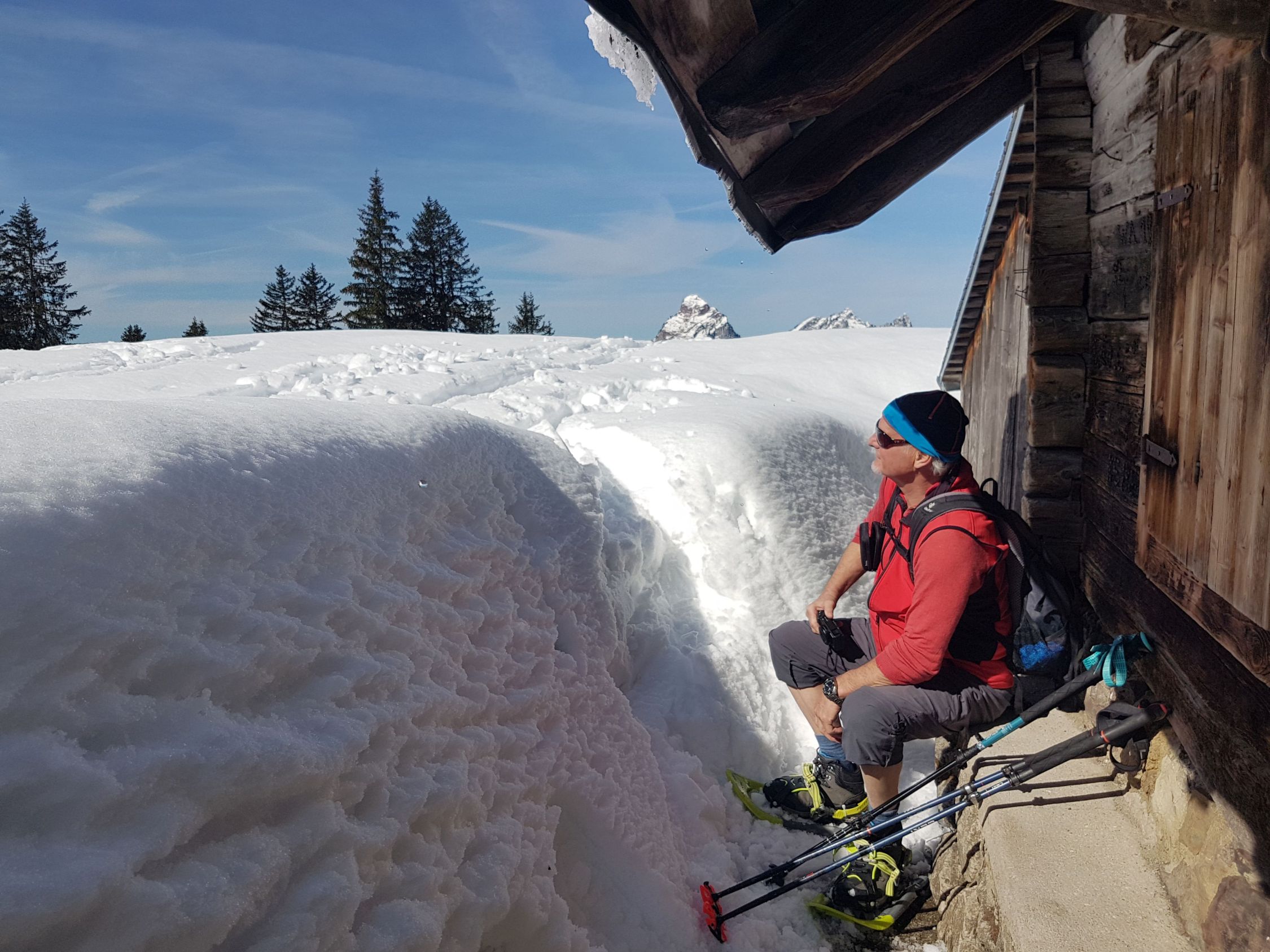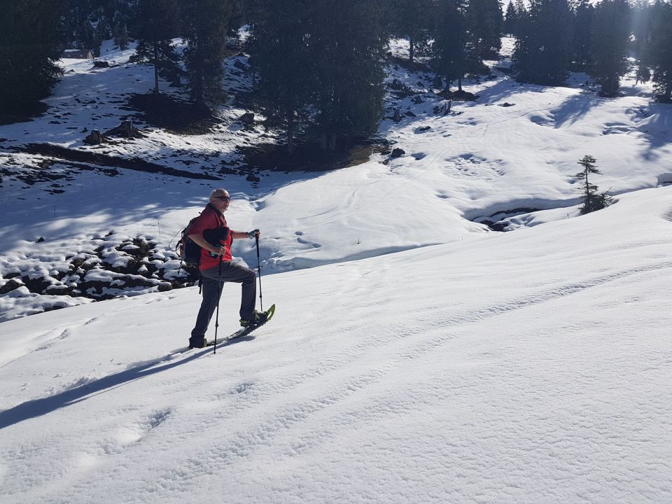 Die Wahl der Schneeschuhe war, denke ich, für diese Tour richtig. Was ich so an den vorhandenen Abfahrtsspuren erkannte oder am Fahrstil der Abfahrenden sah, hielt sich das Fahrvergnügen in Grenzen.