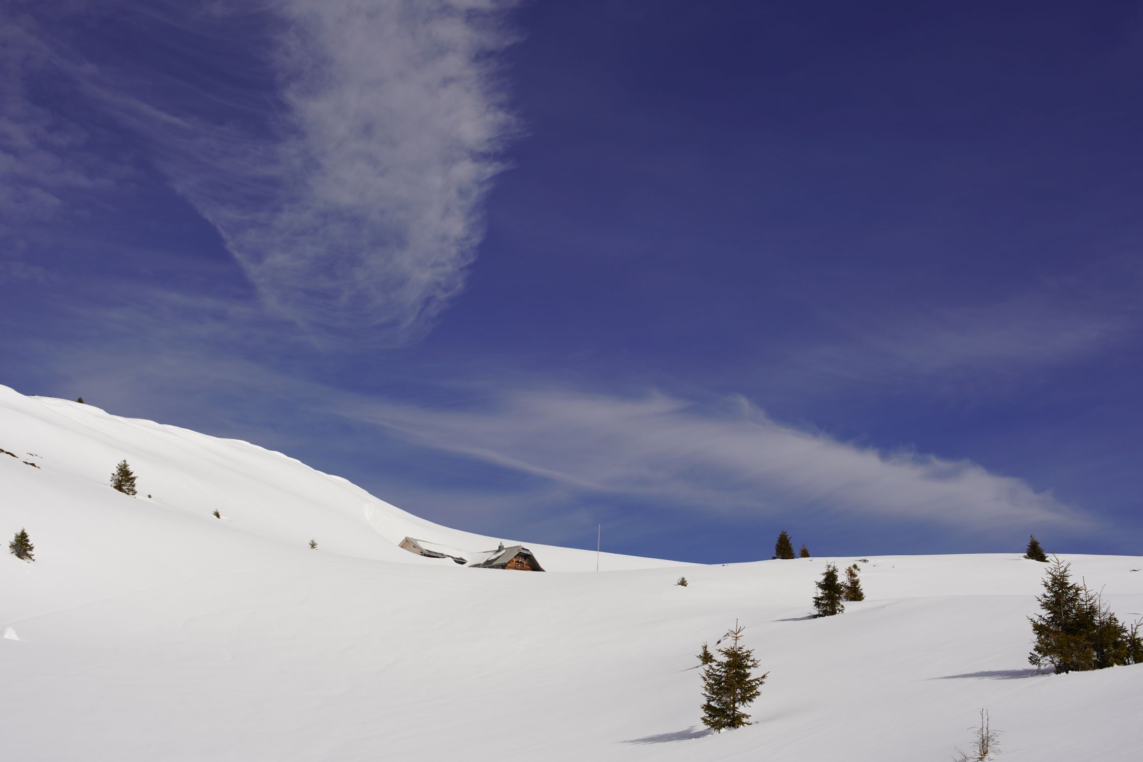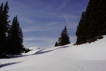 Start ab alter Kiesgrube bei 5°C um 8:15 und schönstem Wetter. Zuerst noch Schi tragen bis zur Einmündung Sommerweg. Ab Brätliplatz durchgehende Schneedecke bis zum Gipfel. Vom letzten Niederschlag Regen bis zum Gipfel. Im Aufstieg durchgehend eine leichte Kruste nicht überall tragend. Generell sehr milde Temperatur.