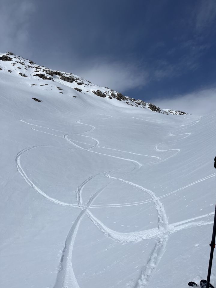 Südhänge unter 2500 könnten nach klarer Nacht tragfähig sein. Darüber bleibt der Deckel wohl erhalten. Abfahrt nach Norden bis ca. 2400 noch pulverig, ausser der Wind hatte Einfluss darauf. Schnee hat es viel, die Tour sollte somit noch länger machbar sein.