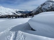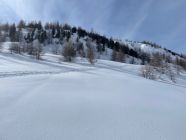 Sehr gut angelegte Aufstiegsspur durch den Wald (Achtung Wildschutzzone beachten) entlang des Sommerwegs bis zur Alp und weiter zum Gipfel. Schneeverhältnisse in der Abfahrt bis kurz vor der Alp Müsella hervorragend (Pulverschnee). Ab Alp bis Waldgrenze teilweise schon feucht und gedeckelt. Abfahrt durch die steile Lichtung: Sehr schwerer Schnee, fordernd zu fahren (ich habe in der Abfahrt stärker geschwitzt als im Aufstieg). Wenn diese Passage wieder von mehr Leuten befahren wird könnte es pistenähnliche Verhältnisse geben.