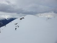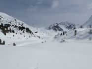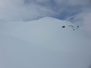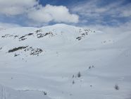 Somit ab Punt Teal (P1882) selber hoch gespurt via südlich von der Alp Prasüra hinein ins Val Costainas. Kurz nach P2304 ist ein älterer Lawinenabgang, der von der westlichen Flanke vom Fallaschkopf hinabging, unschwierig zu überqueren. Kurze Zeit später bei P2476 ging es dann auch schon in Richtung westen ausholend in eine Mulde etwas steiler hoch (bis 35° auf 100Hm) bis zum Südrücken des Piz Val Gronda. Ab da mit Skis über einen leichten Verbindungsgrat zum Hauptgipfel.