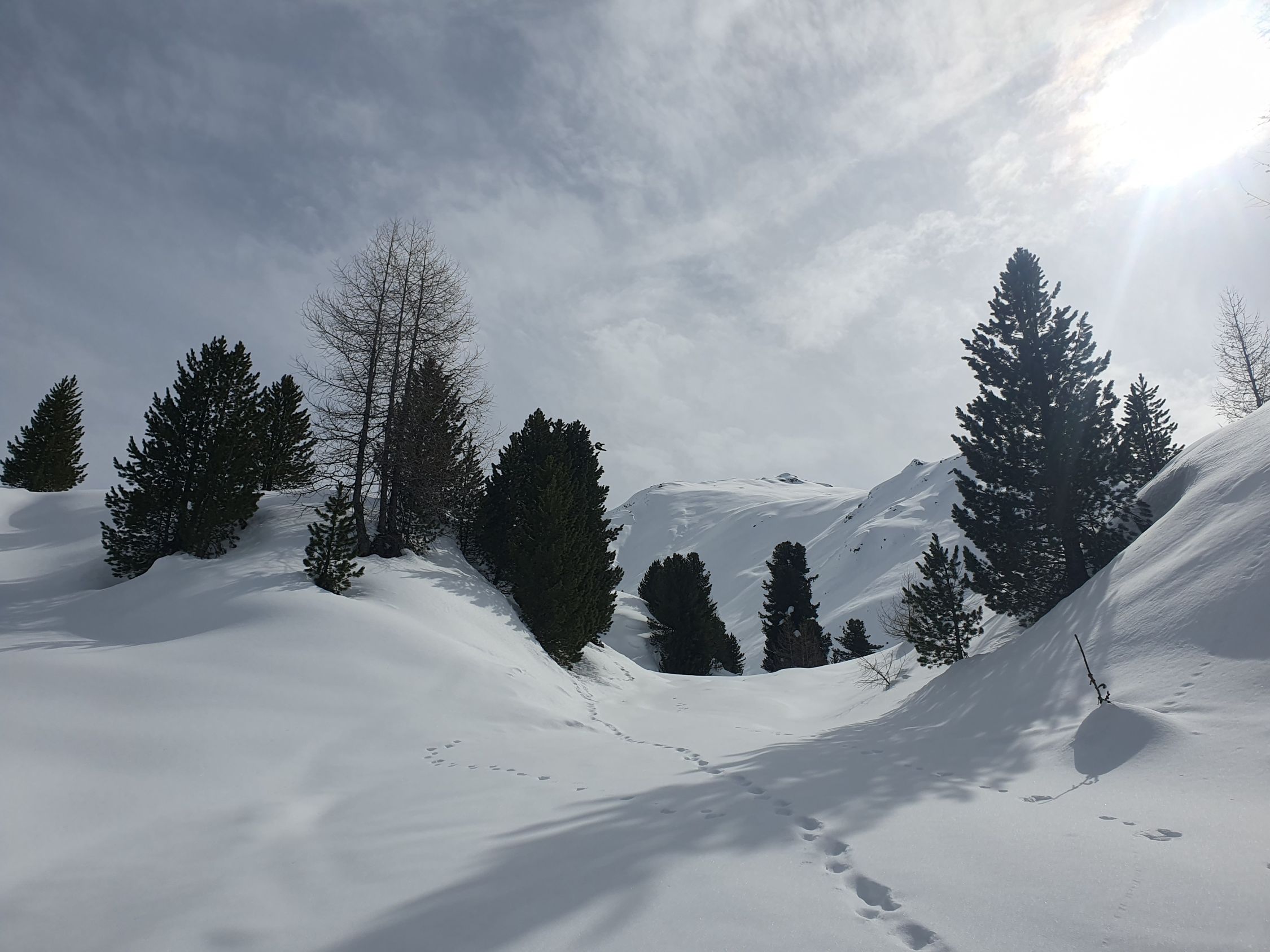 Es liegt hier oben noch ganz viel Schnee, so wie allgemeind im Val Müstair. Hier ist die Skitourensaison zum Glück noch lange nicht vorbei!
