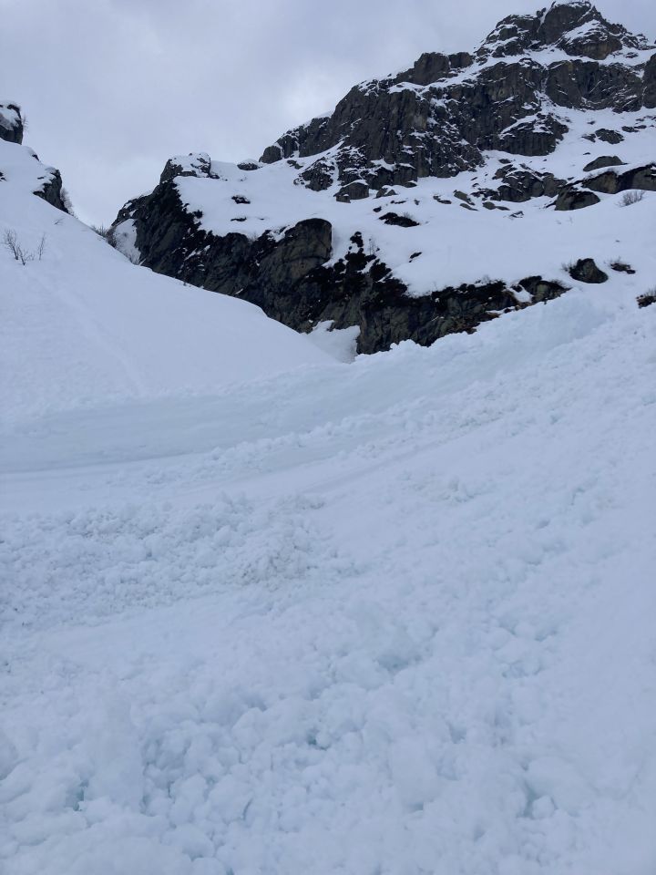 Strasse ist bis zur Brücke bei Gorezmettlen geräumt. Ab da hat es mehr als genug Schnee. Weil es jedoch nicht abstrahlen konnte, war der Schnee bereits um 07:00 weich. Ab Wissgand hat es viele sehr grosse Nassrutsch-Kegel. Das hintere Hobergtal ist im hinteren Bereich ein einziger grosser Lawinenkegel...