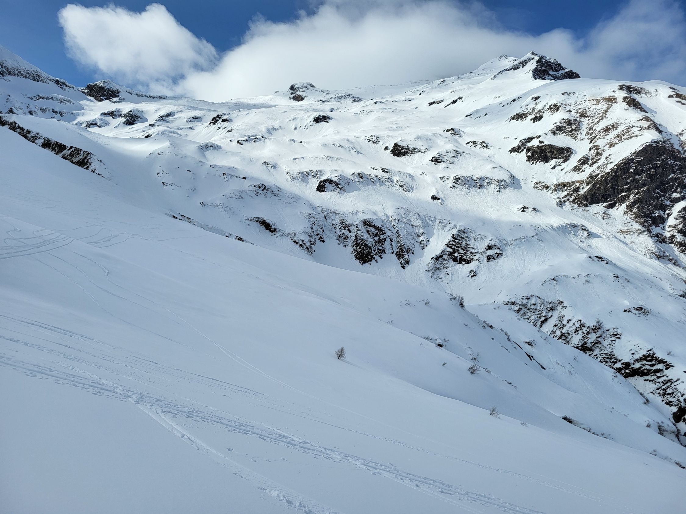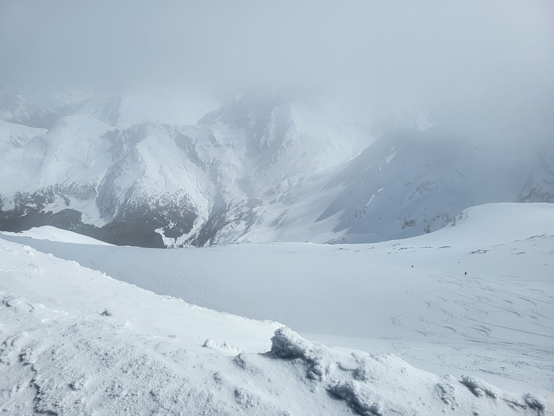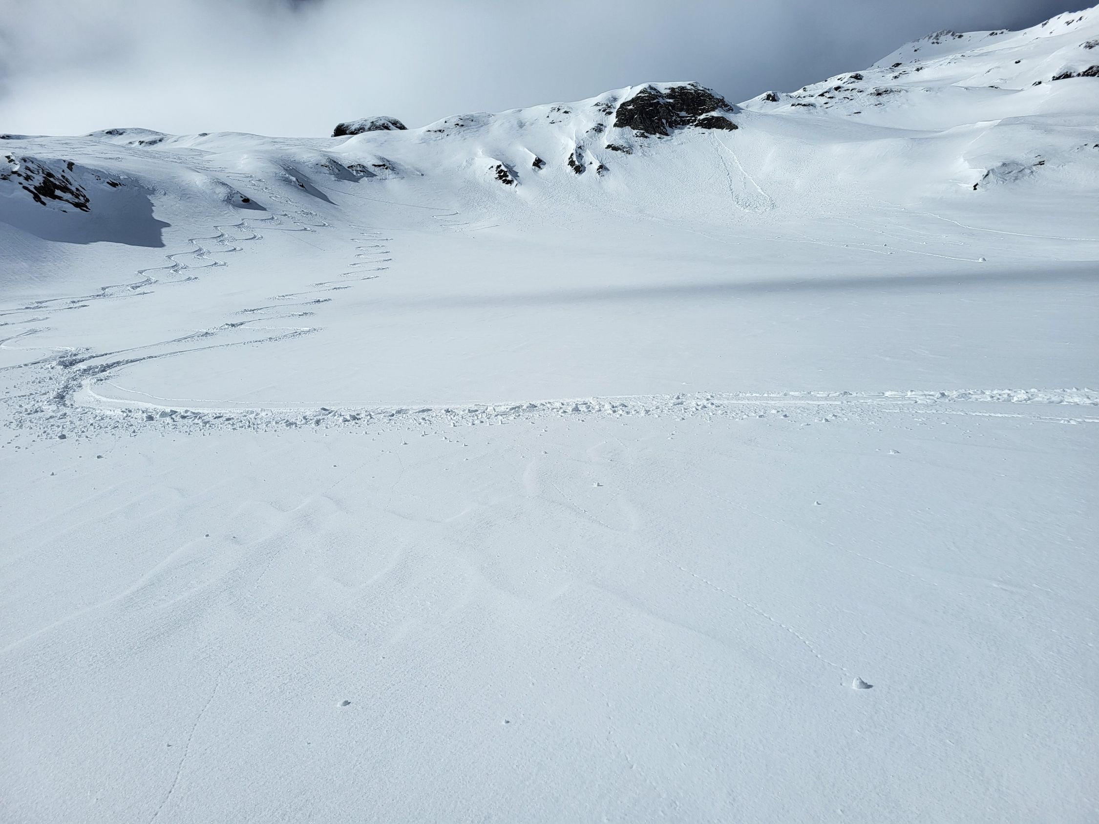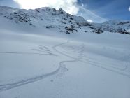 In der Flanke schnell warm. Weiter oben kalter Wind. Kurzer Aufstieg vom Skidepot zum Gipfel. Oben etwas neblig, ab 3100 gute Sicht bei der Abfahrt. Im Kees kurzes Stück mit Windgangeln. Weiter unten noch viele freie Flächen für Schwünge.