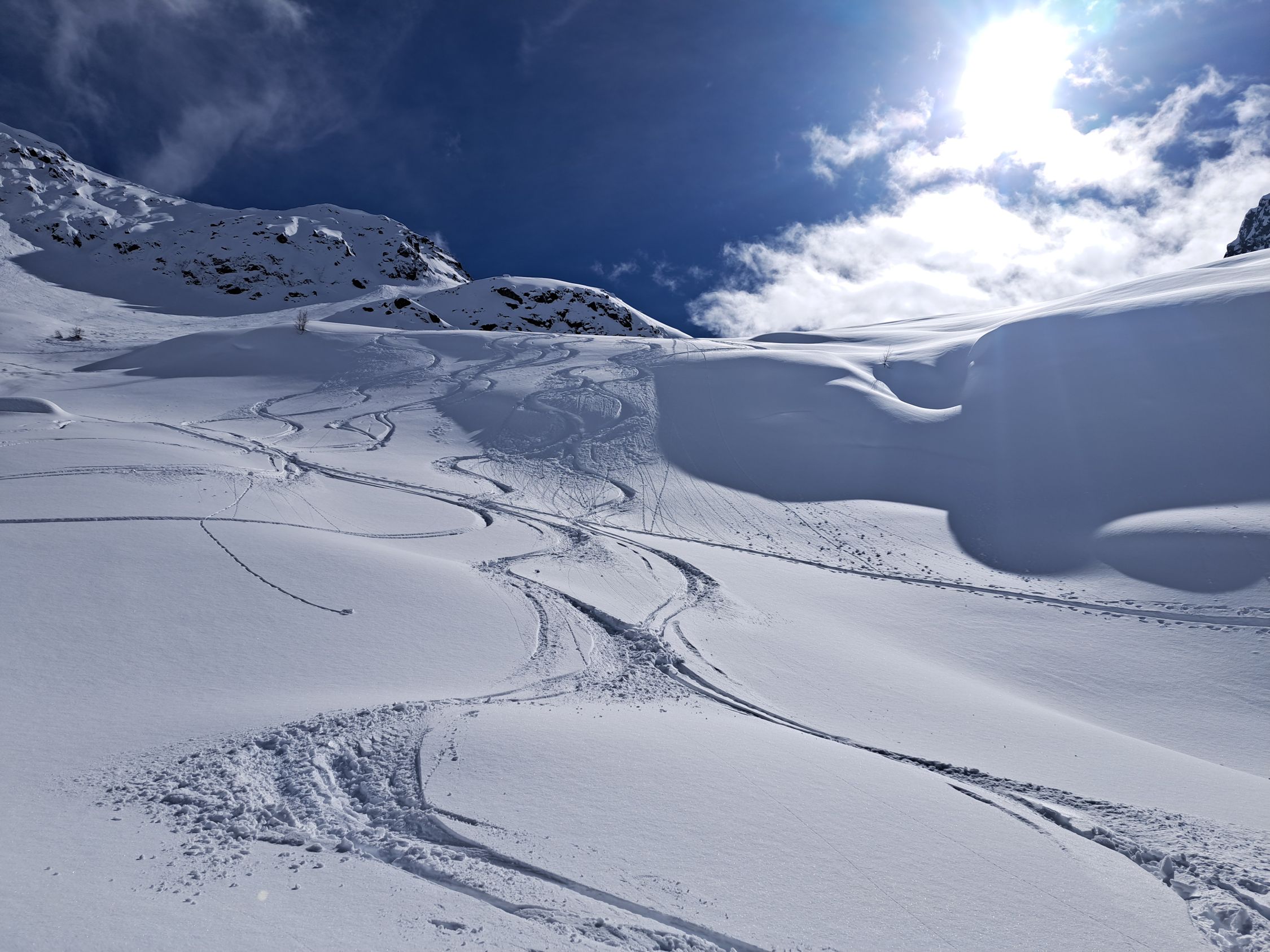 Die Skis dürfen die ersten 400 hm getragen werden. Dann weicher Schnee, danach Gedeckelt bis ca 2000m danach Pulver nach dem Pass bis zum Gipfel waren Südwesthängen sulzig. Gute Trainingstour für die nächsten Wochen.