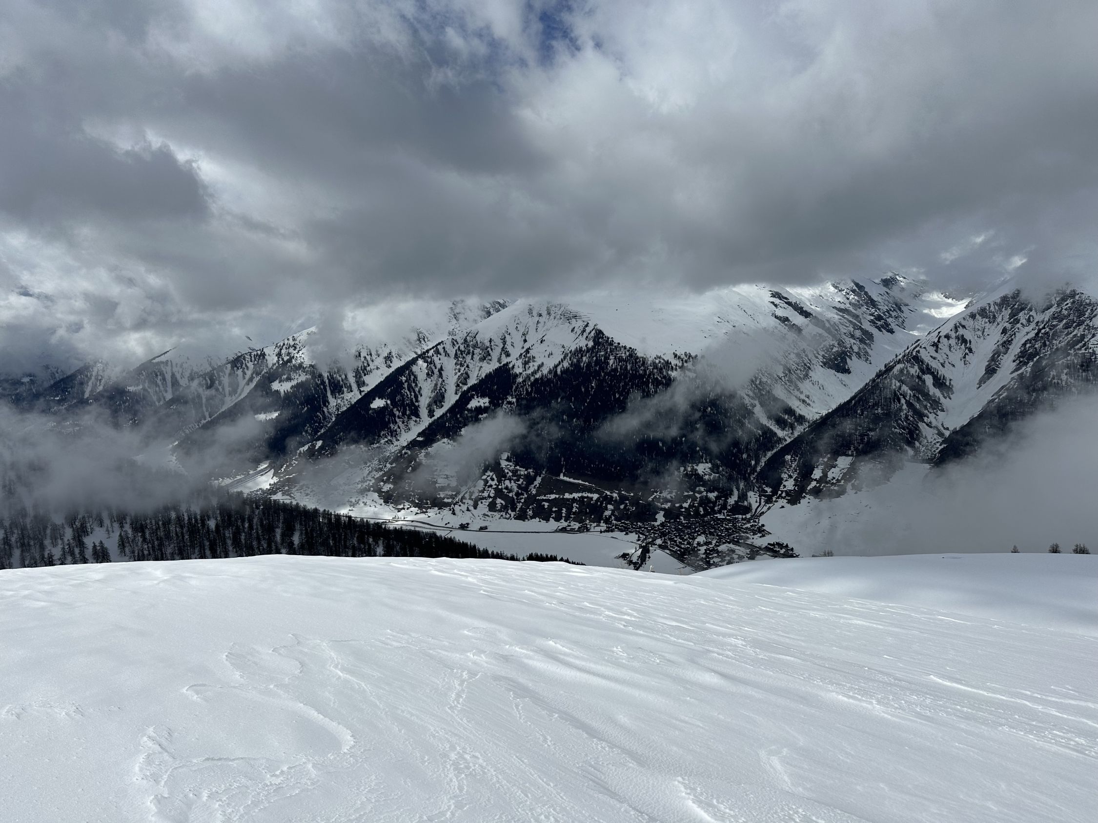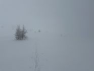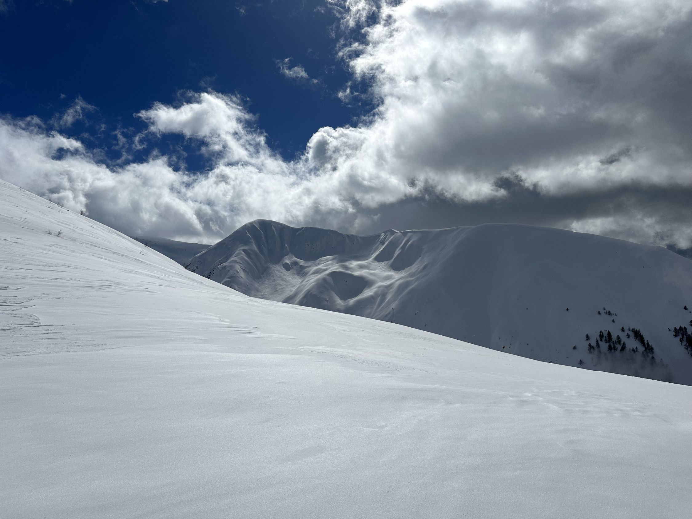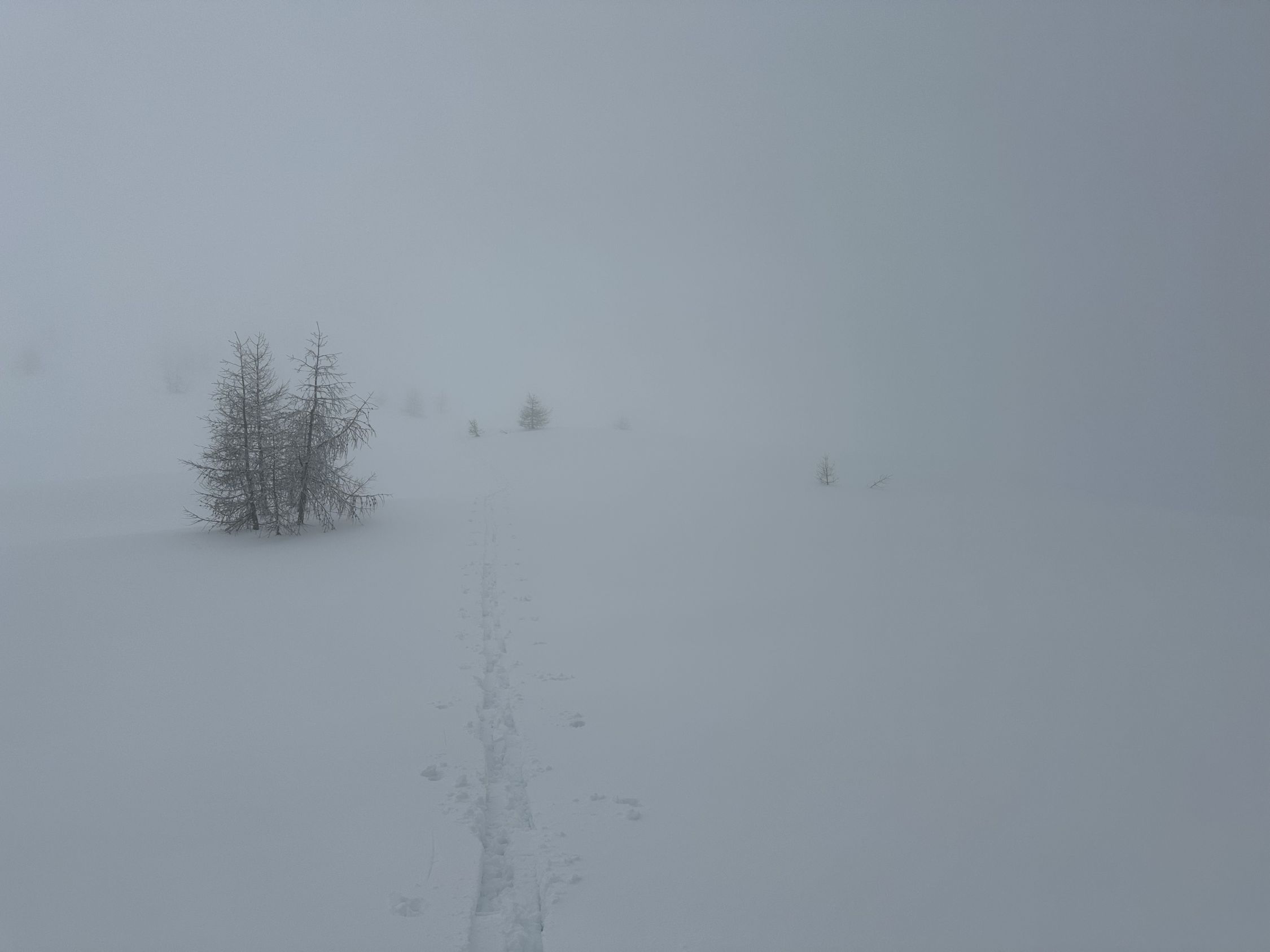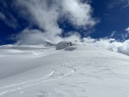 Schnee sehr nass, Wind, Neblig bis auf den Gipfel, danach Abfahrt im schweren Pulver und tiefen Nassschnee bei guter Sicht.