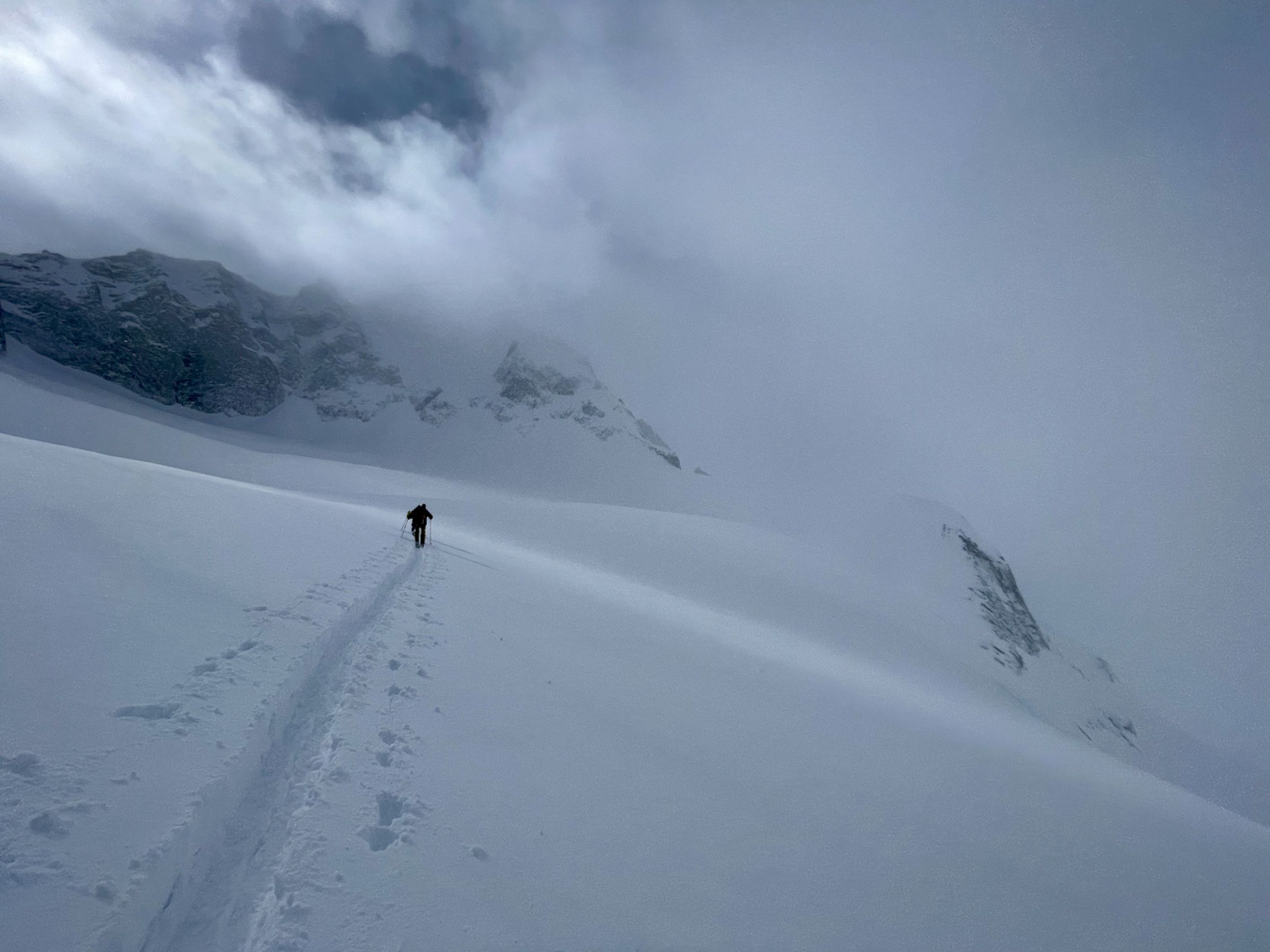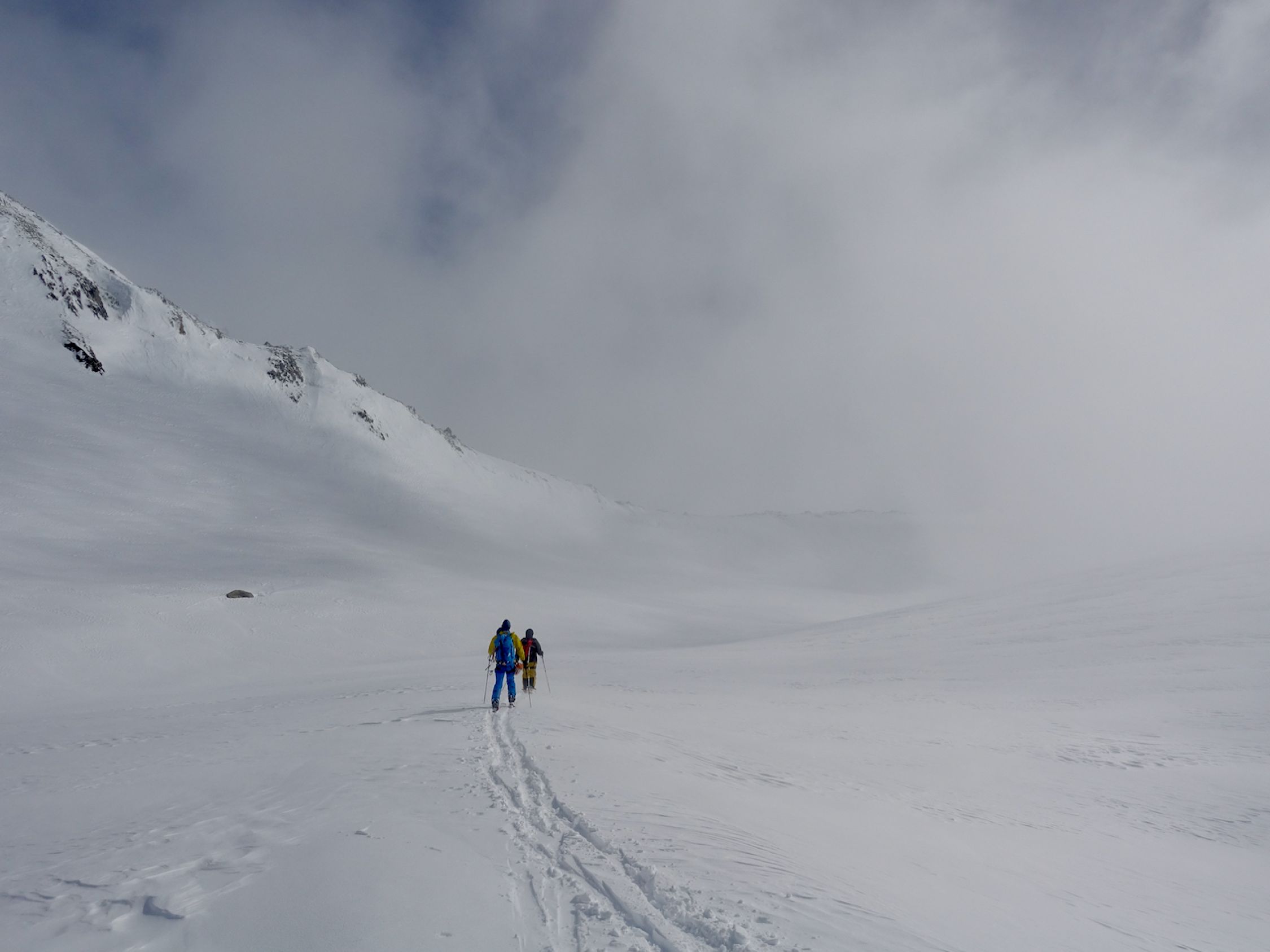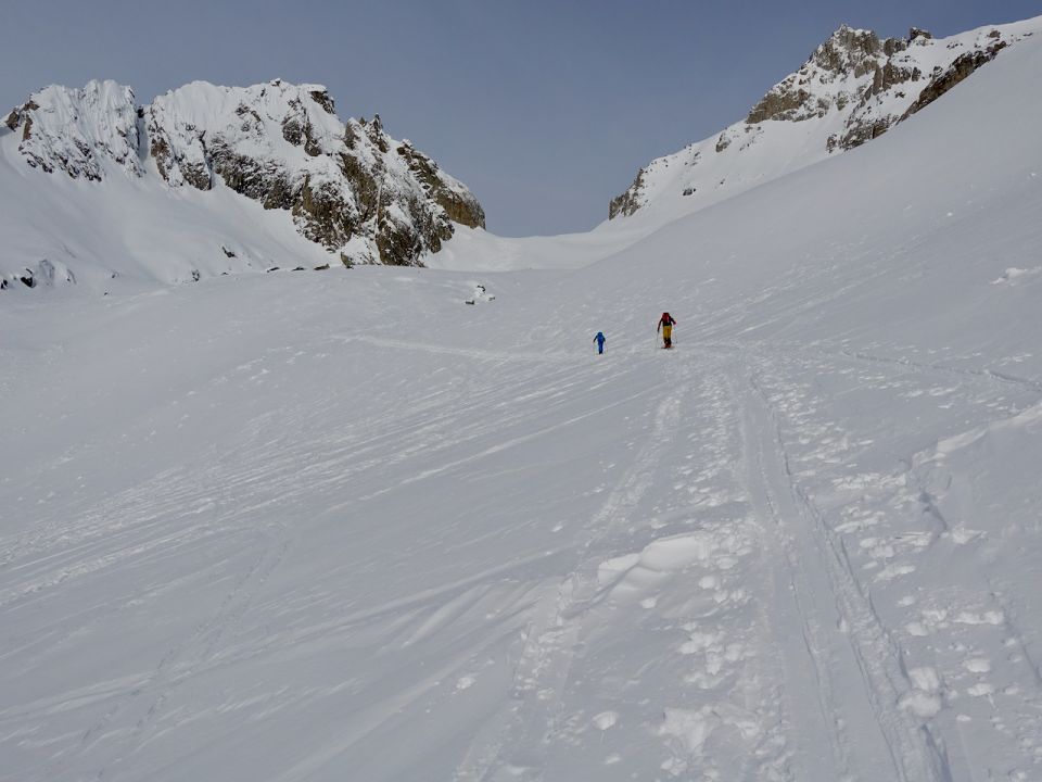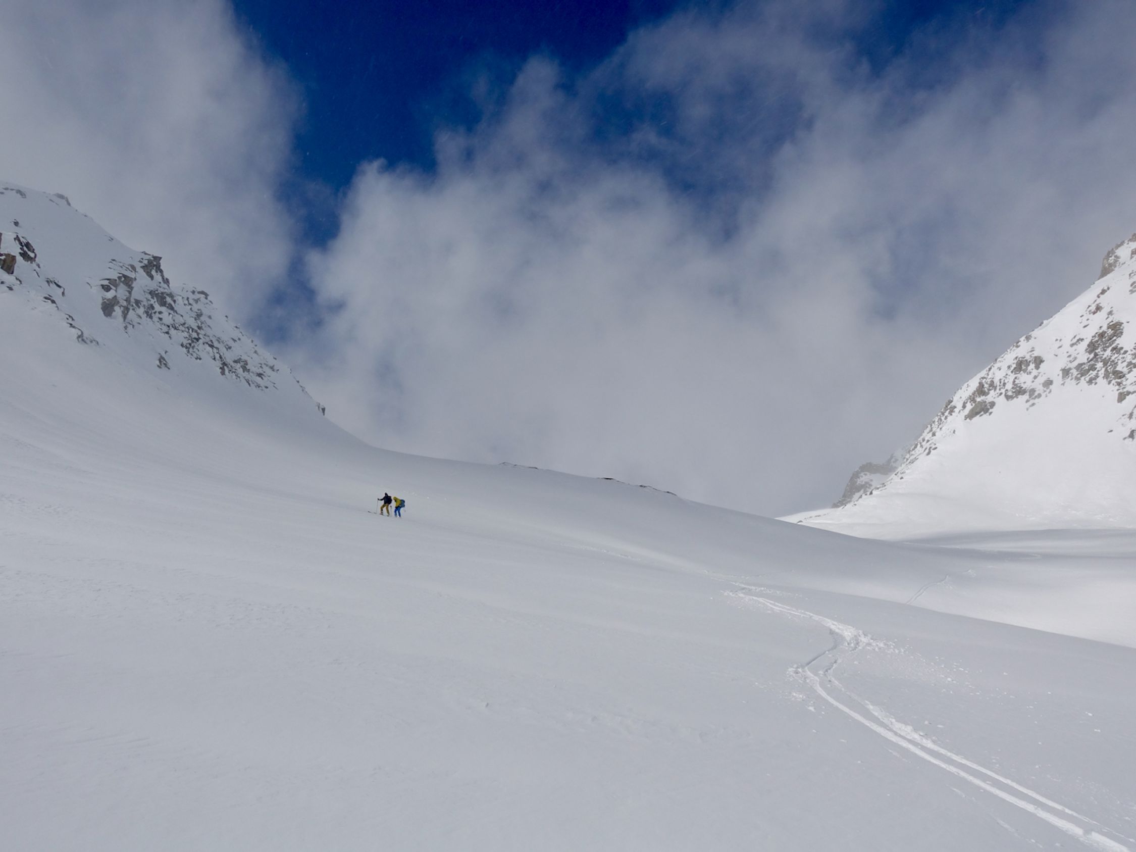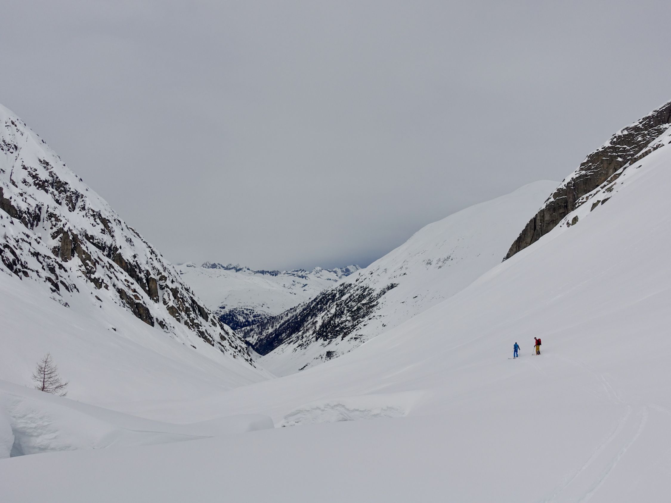 Die Querung direkt oberhalb der Capanna Piansecco geht wirklich nur bei guten Verhältnissen und das ist sowohl Lawinenlage, wie auch Schneeart. Das Absturzrisiko bei Hartschnee ist real. Bei uns war's am Nachmittag zum Glück weich, am Morgen bei harter Schneedecke trauten wir der Querung nicht. Bei der Querung von oben kommend ziemlich nah an dem Felsausläufer bleiben. Erst am tiefsten Punkt des Felsbands gerade nach Westen weiterfahren um die weniger steile Lücke im Hang zu treffen. Wir kamen erst ein paar Meter zu tief und durften noch mal für 20 m auffellen.