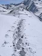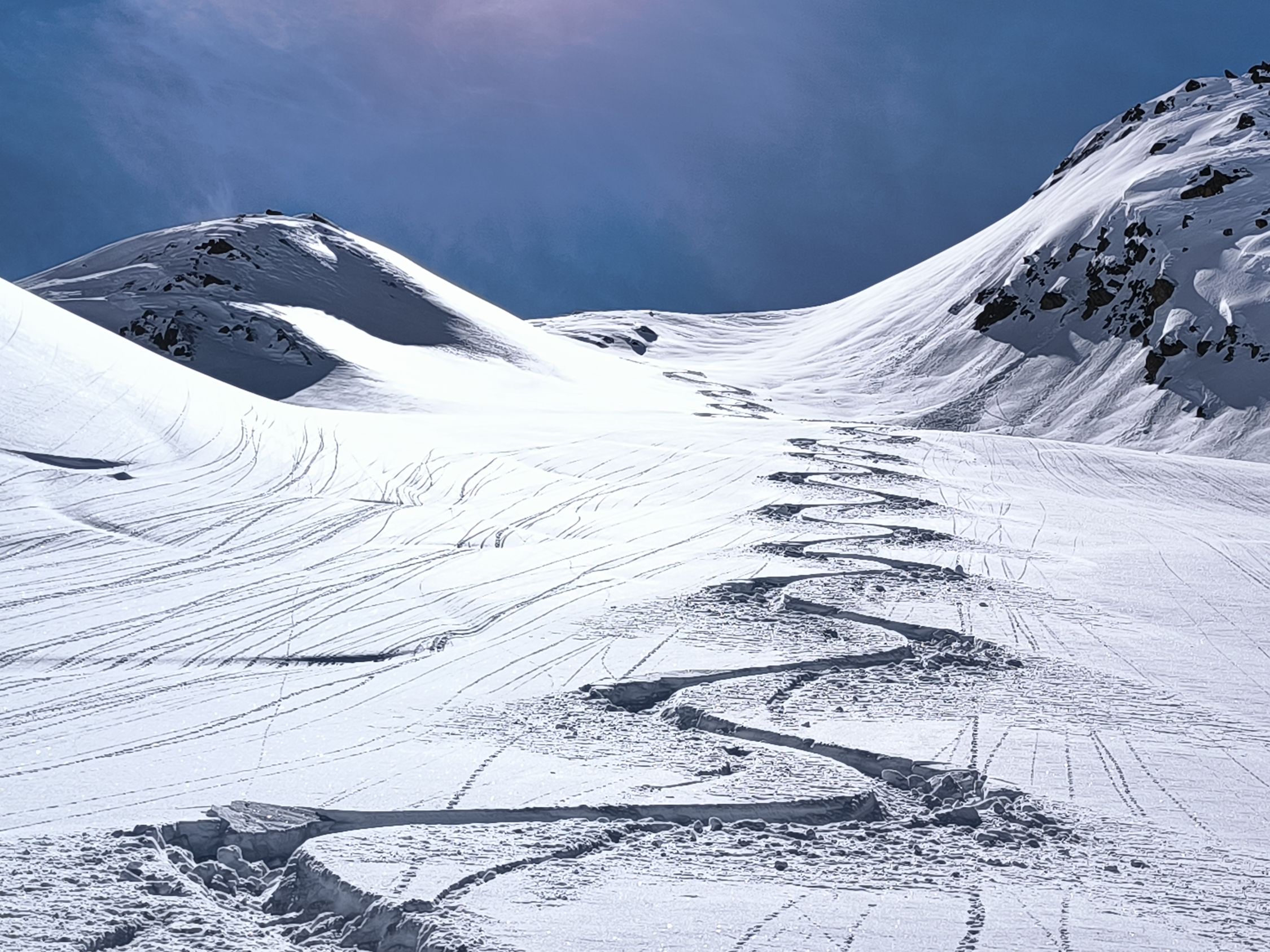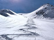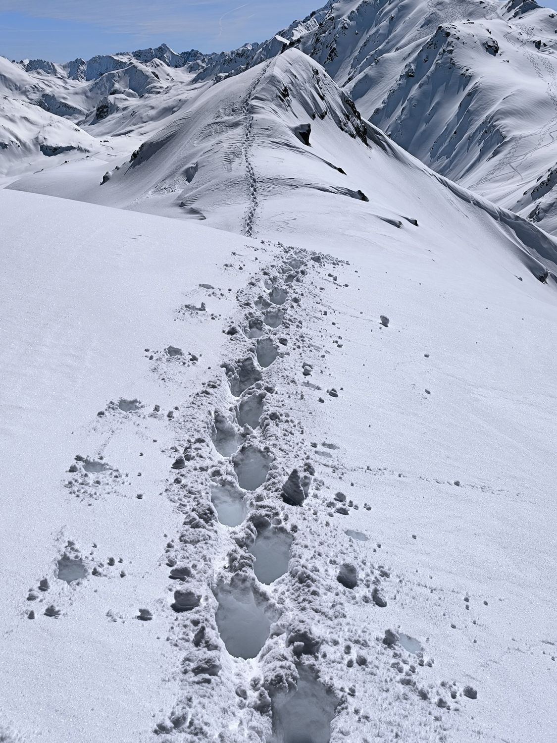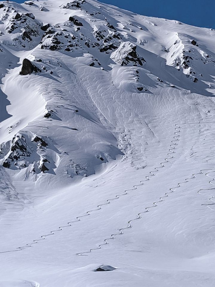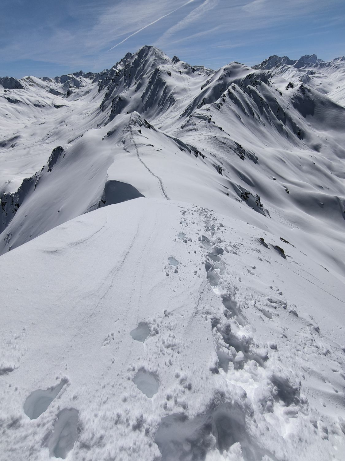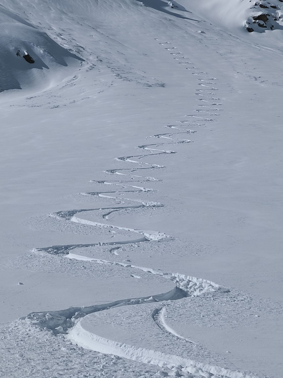 Nach dem gestrigen Dauerregen war das Kriterium hoch gelegener Startpunkt und mit der erwarteten Wärme und Sonneneinstrahlung kam für mich nur ein Nordhang in Frage. Also ging es von Tschuggen auf das Sentisch Horn. Abfahrt ging über die steilere Abkürzungsvariante im allerbesten Powder bis auf 2300m runter. Anschließend aufgefellt um den Baslersch Chopf zu machen. Die Abfahrt war dort südost exponiert. Dort war der Schnee schon schwer. Aber zum paar Bogen fahren noch gut genug. Ein namenloser Berg Pkt 2687 war komplett von Skitourengeher verwaist und lud ein nochmals die Mühe zu machen aufzusteigen. Die Belohnung am Pkt 2687 konnte ich bereits fühlen, allerbester Powder in einem unberührten Hang ohne Triebschnee.