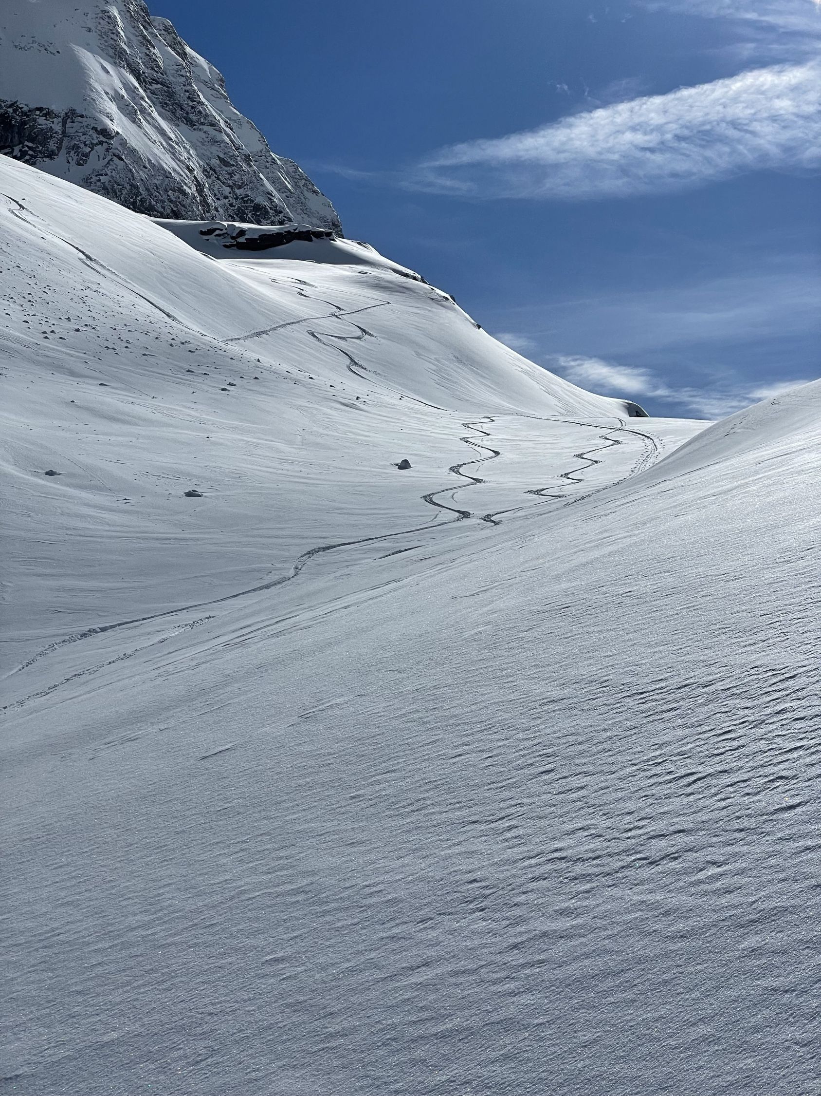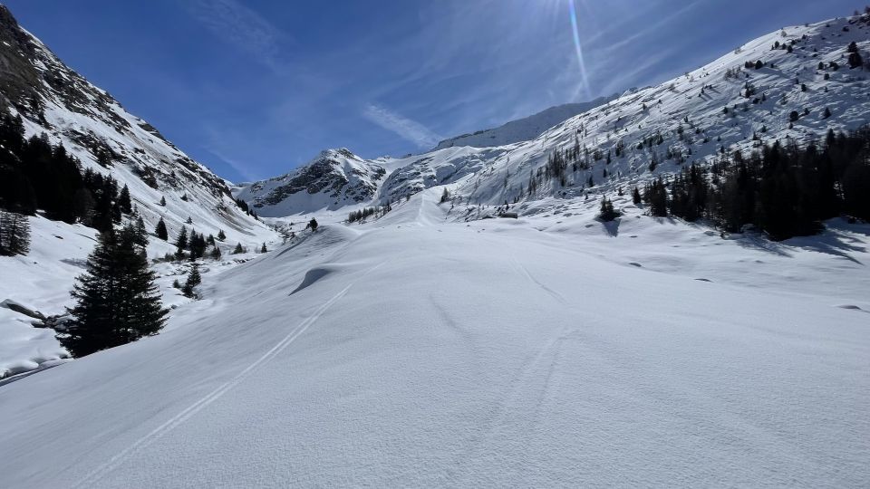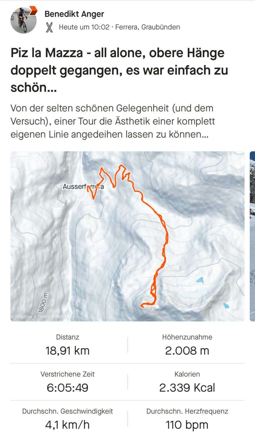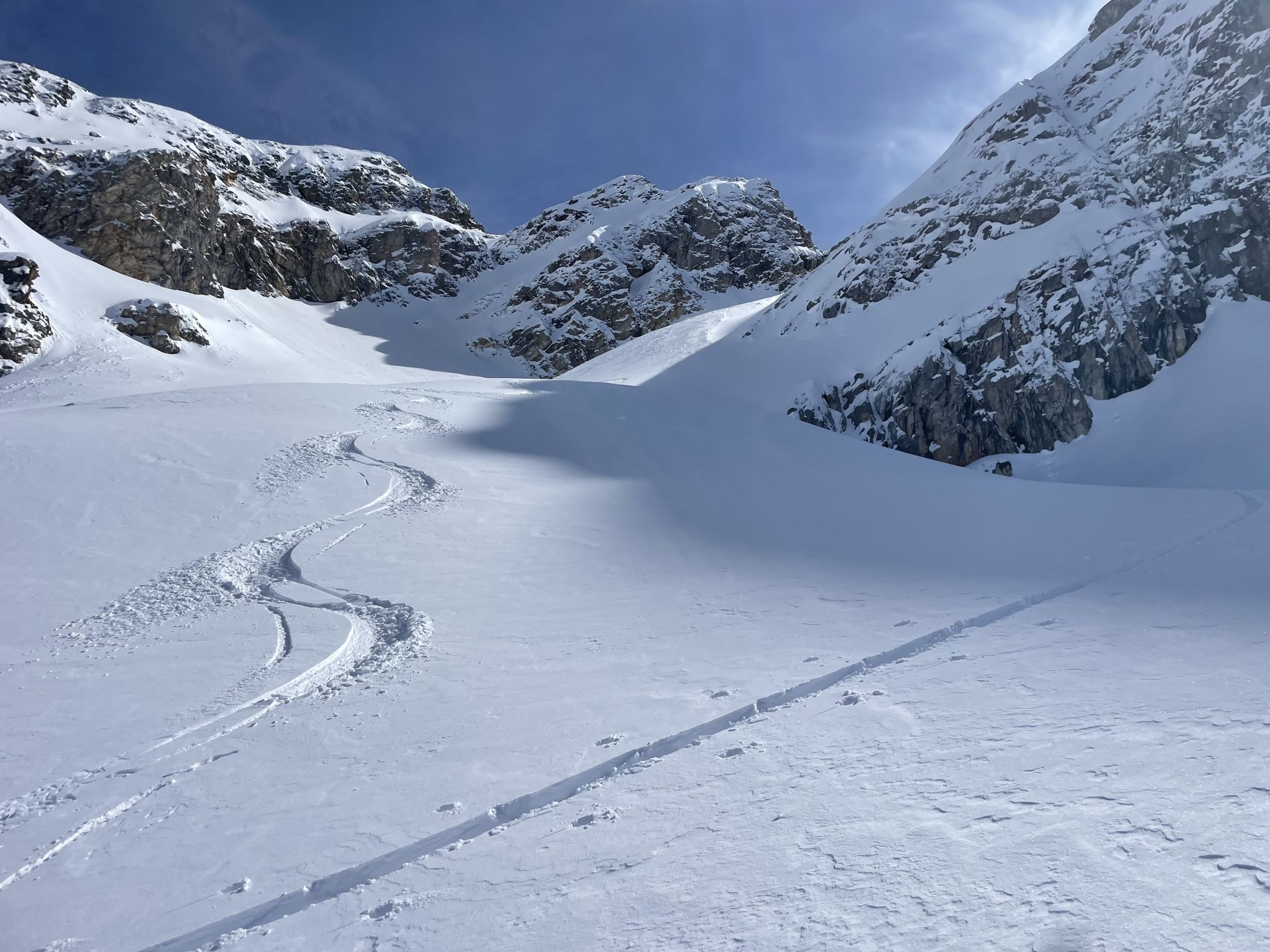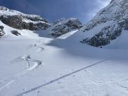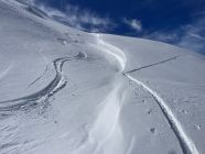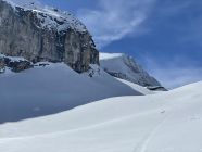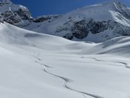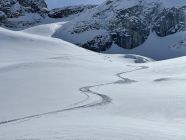 Exklusive Tour, Empfehlung für den morgigen schönen Tag! Auf den ersten 200hm kurze Tragepassagen, dann tolle Verhältnisse in wunderschöner Landschaft. Obere 500hm Traumpulver, dann wenig Pulver auf harter Unterlage/ teilweise schon aufgefirnt bis ca. 1900m, danach Waldweg. Die Hänge bieten noch viel Platz und man entgeht jeglichem Trubel an sonstigen Modegipfeln. Dem Waldweg bis Cresta folgen, der direkte Hang, der in der SAC-Karte eingezeichnet ist, hat schon zu viel Substanzverlust erlitten.