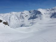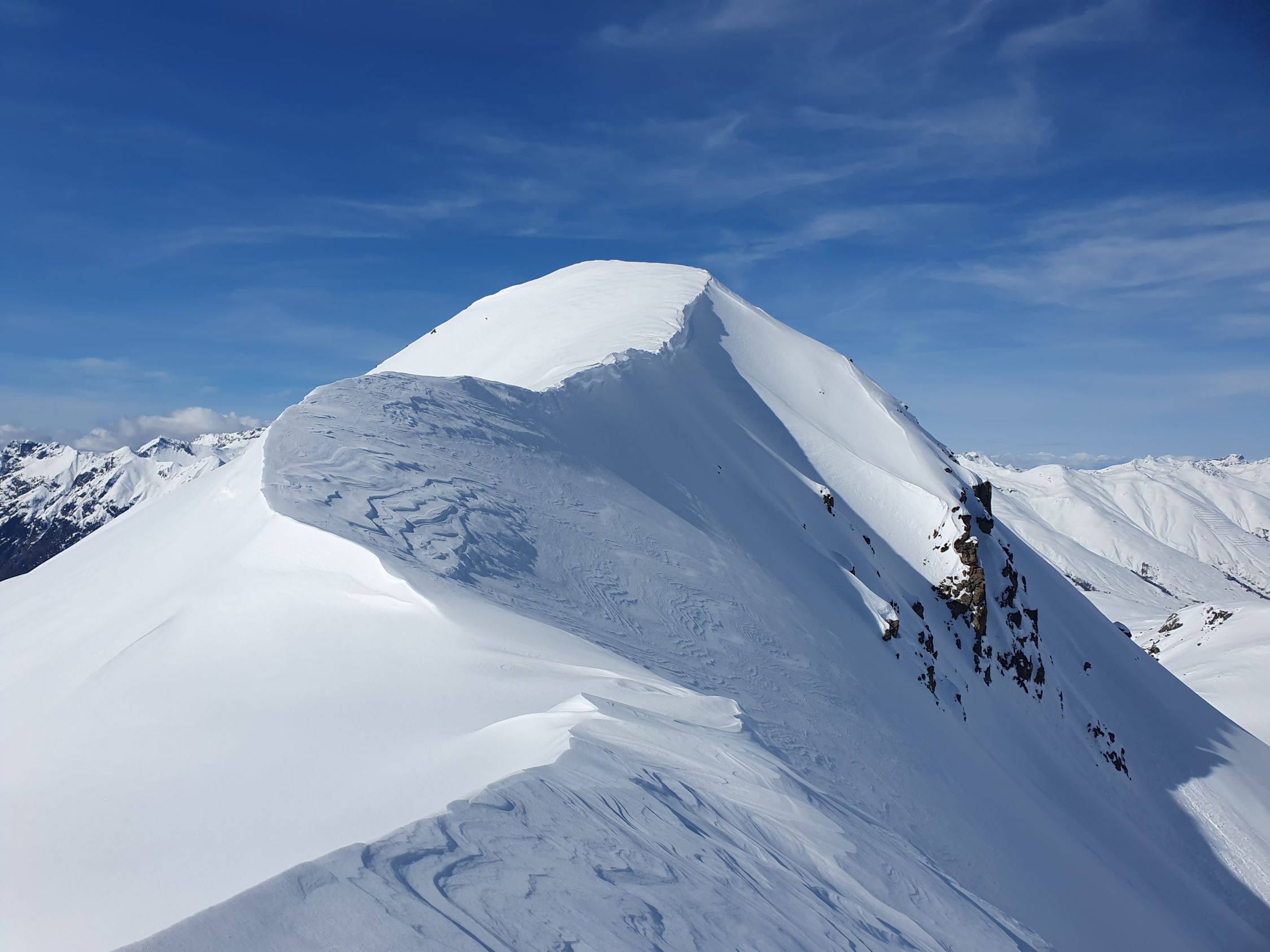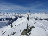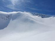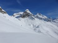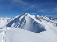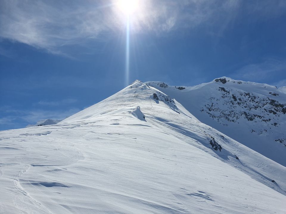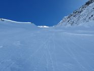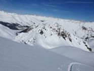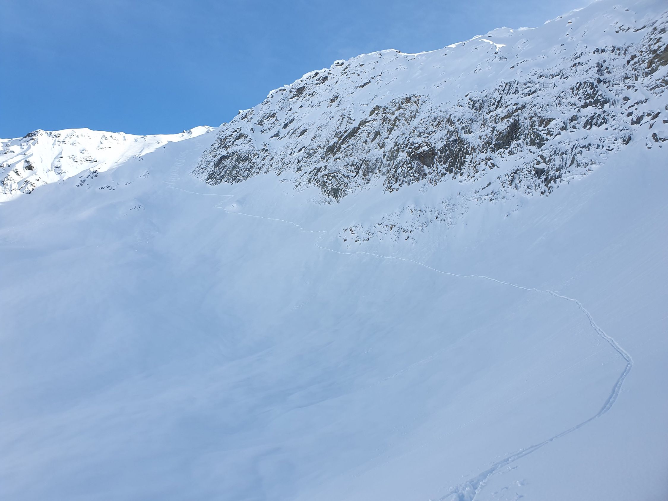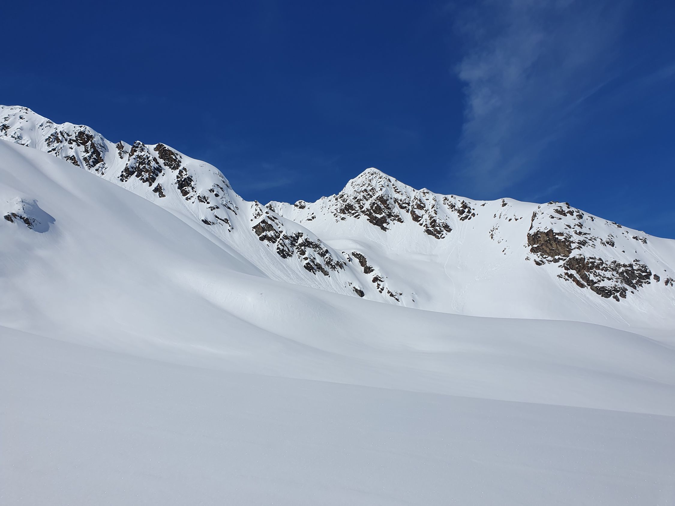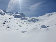 Das Gelände bis im hinteren Talkessel ist nicht steil, aber mit diesen Schneemengen doch mühsam forwärts zu kommen. Kurz nach P2702 beim zweiten Seelein unterhalb vom Piz Malat geht's steil hoch nach westen. Hier sind einige eher neuere Rutschabgänge zu beobachten. In südwestlicher Richtung geht's steil hoch bis ca. 50 Hm unterhalb des Hauptgipfels. Der Schnee war ab da etwas härter, ging aber, trotz Steine und Felsen, mit Skis noch immer gut. Kurz vor dem Sattel (evt. Skidepot) habe ich die Steilstufe westlich im Nordcouloir umgangen. Mit etwas Vorsicht konnte ich heute vom sog. Skidepot mit den Skis nördlich bis zum Hauptgipfel hochkomen. Bei weniger guten Verhältnisse wären hier Steigeisen und Pickel sicher nötig gewesen.