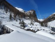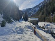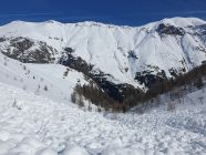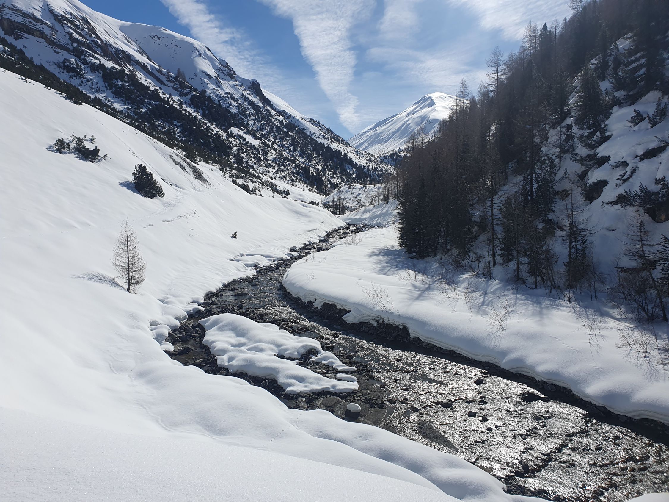 In La Punt Chamues-ch können die Skis bereits rechts nach der Brücke bei der Hauptstrasse angeschnallt werden. Nach einer kurzen Tragestelle geht's auf dem Alpweg auf zwei vorhandenen Skispuren hinein in das Val Chamuera bis Stevel da la Bes-cha (P1955). Bis hierhin ist die Route sehr flach und hat sogar noch einen kurzen Gegenanstieg. Hier habe ich Spuren ins Val Chamuera und im Val Burdun, wobei letzteres nur via P2182 zur Alp Burdun (P2174) gingen. Somit hiess es für mich ab P2182 bis zu den nächsten zwei Gipfeln selber zu Spuren, was aufgrund der hohen Schneemengen anspruchsvoll war. Ein älterer Lawinenkegel, kommend vom P2538, kann unschwierig überquert werden.