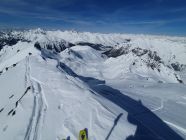 Nach einem kurzen, aber doch noch anstrengenden Wiederaufstieg zur Fuorcla Malat, ging es danach gemütlicher auf dem Südostgrat zum Piz Utèr. Auch hier waren nirgends Spuren vorhanden. Ich sah Spuren von der Fuorcla Val Champagna hinab ins Val Champagna bis Samedan. Nach einer sichereren Pulverabfahrt zu P2606 ging's ohne viele Kurvenmöglichkeiten hinab in das Val Champagna, wobei der Schnee, je tiefer man fuhr, schwerer wurde. Das letzte Stück ab P1987 war nicht nur stark verfahren, sondern war aufgrund des Hartschnees mühsam abzufahren.