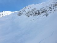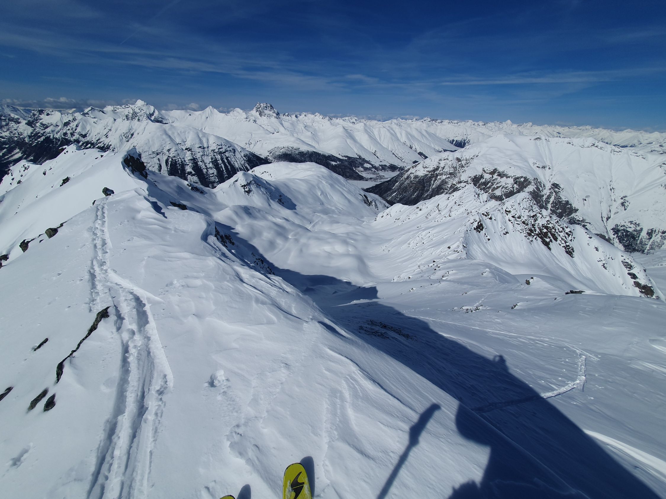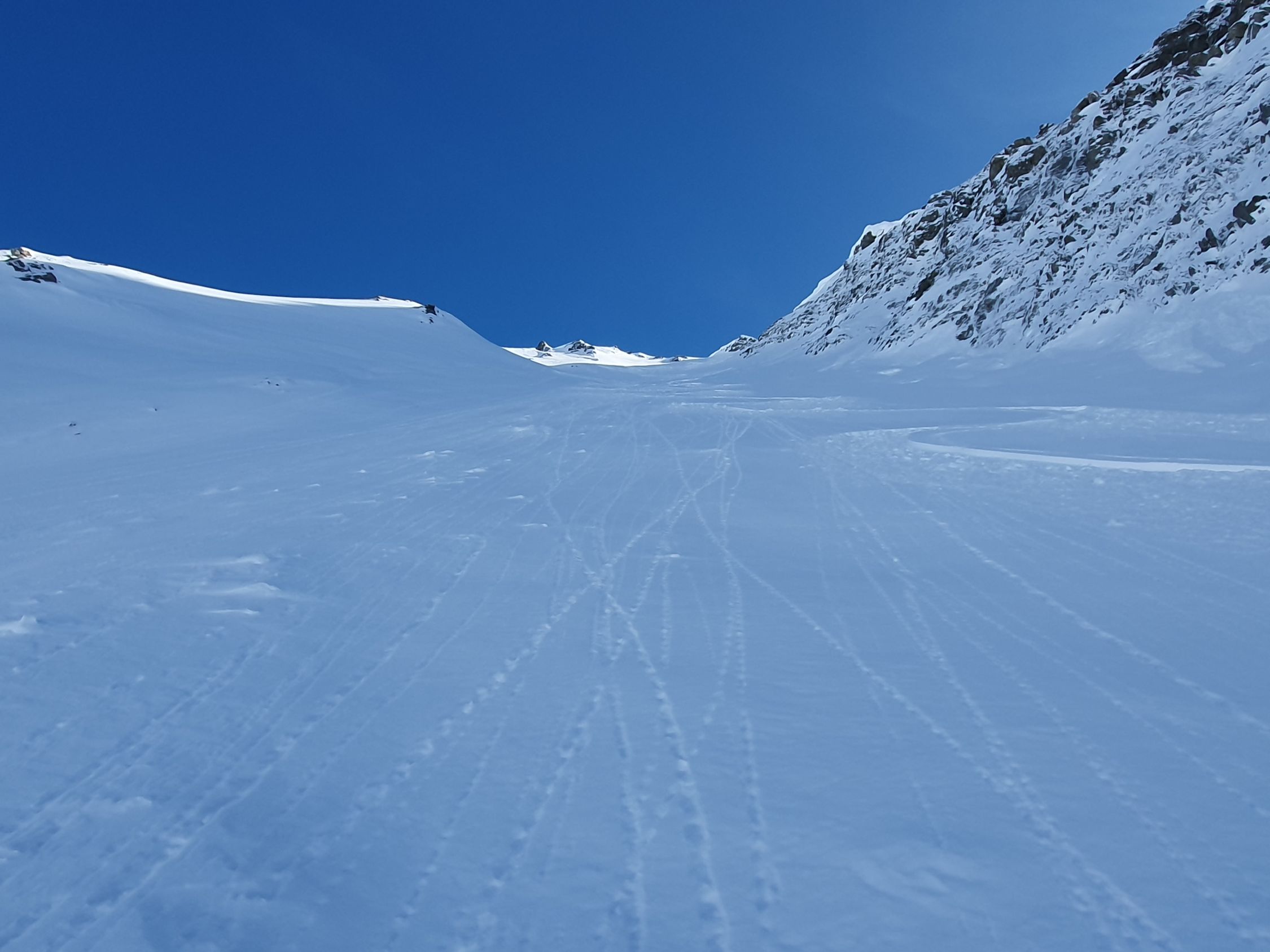 Das Nordcouloir vom Crasta Burdun sah für mich heute top aus. Trotzdem wusste ich, dass da viel Schnee drinnen haben muss. Somit vom Gipfel mit Skis zuerst extrem steil seitlich hinab bis zum Skidepot gerutscht und ab da hinab durch das Nordcouloir bis zur Höhenlinie 2800Hm. Auch im Nordcouloir hatte es Pulver vom feinsten.