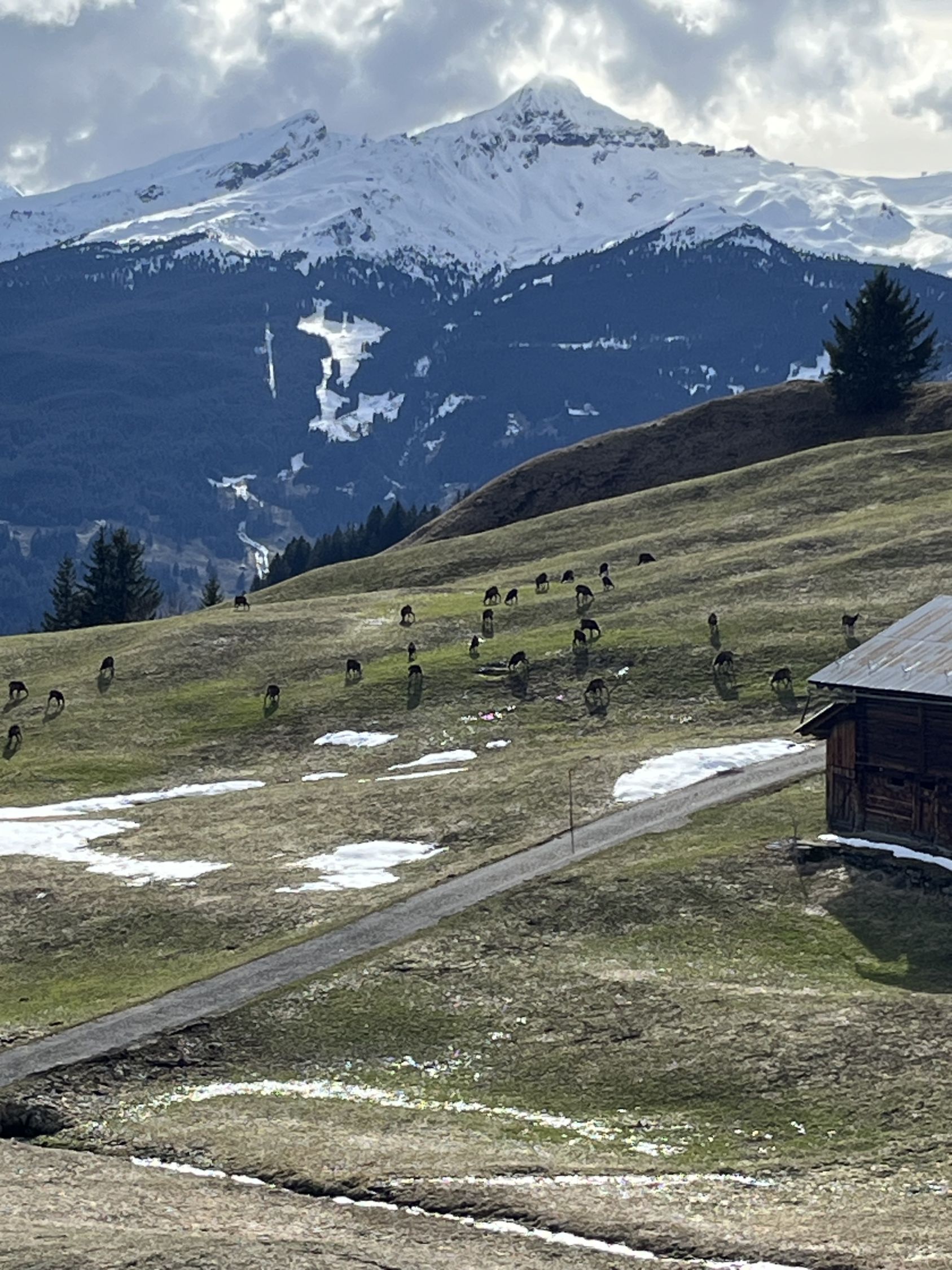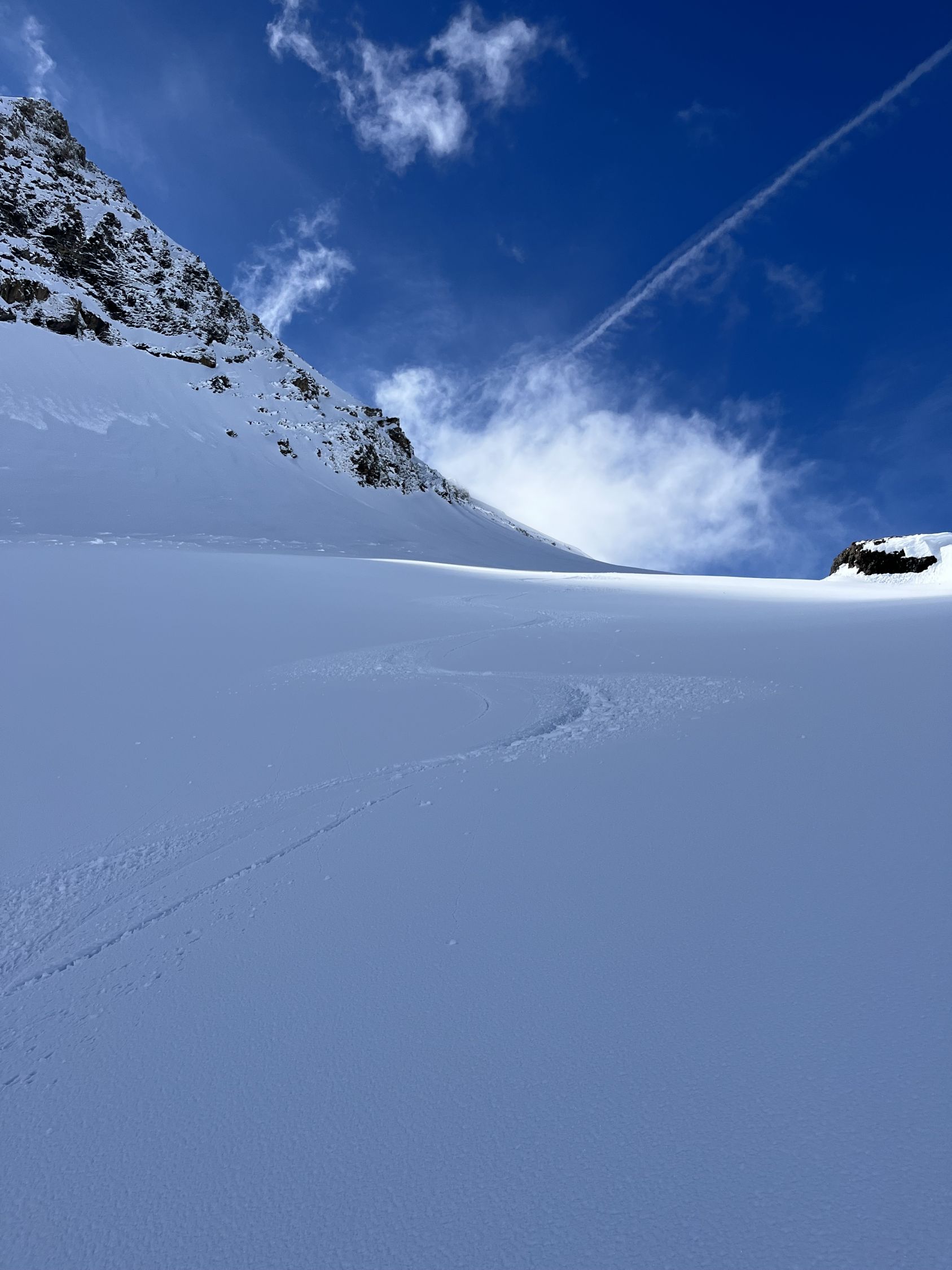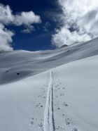 Abfahrt vom Gipfel im nicht mehr pulvrigen aber gut fahrbaren Neuschnee über den Sattel in den Schatten des Simelihorns. Pulvrige Schwünge bis zum See welcher ich rechts in den wenigen Spuren passierte. Unter dem Reeti durch und kurzer Wiederaufstieg auf Uf Spitzen. Abfahrt via Waldspitz nach Bort: Alles was ganz nordseitig fahrbar war noch schön pulvrig sonst schwerer Nassschnee. Strässchen bis Bort mit wenigen Ausnahmen alles fahrbar mit gelegentlichem Bremsschnee.