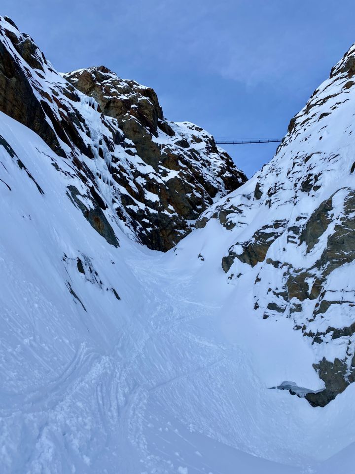 Gute Bedingungen in der Schlucht der Gurgler Ache. Am Gipfelaufbau sind die Seile großteils frei. Dort, wo sie eingeschneit sind, ist eine gute Spur vorhanden.