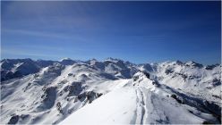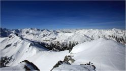 Perfekte Bedingungen bei der Abfahrt durch die Nordrinne, danach noch etwas rauh, aber tragend, anschließend Firn bisn zum Abwinken.