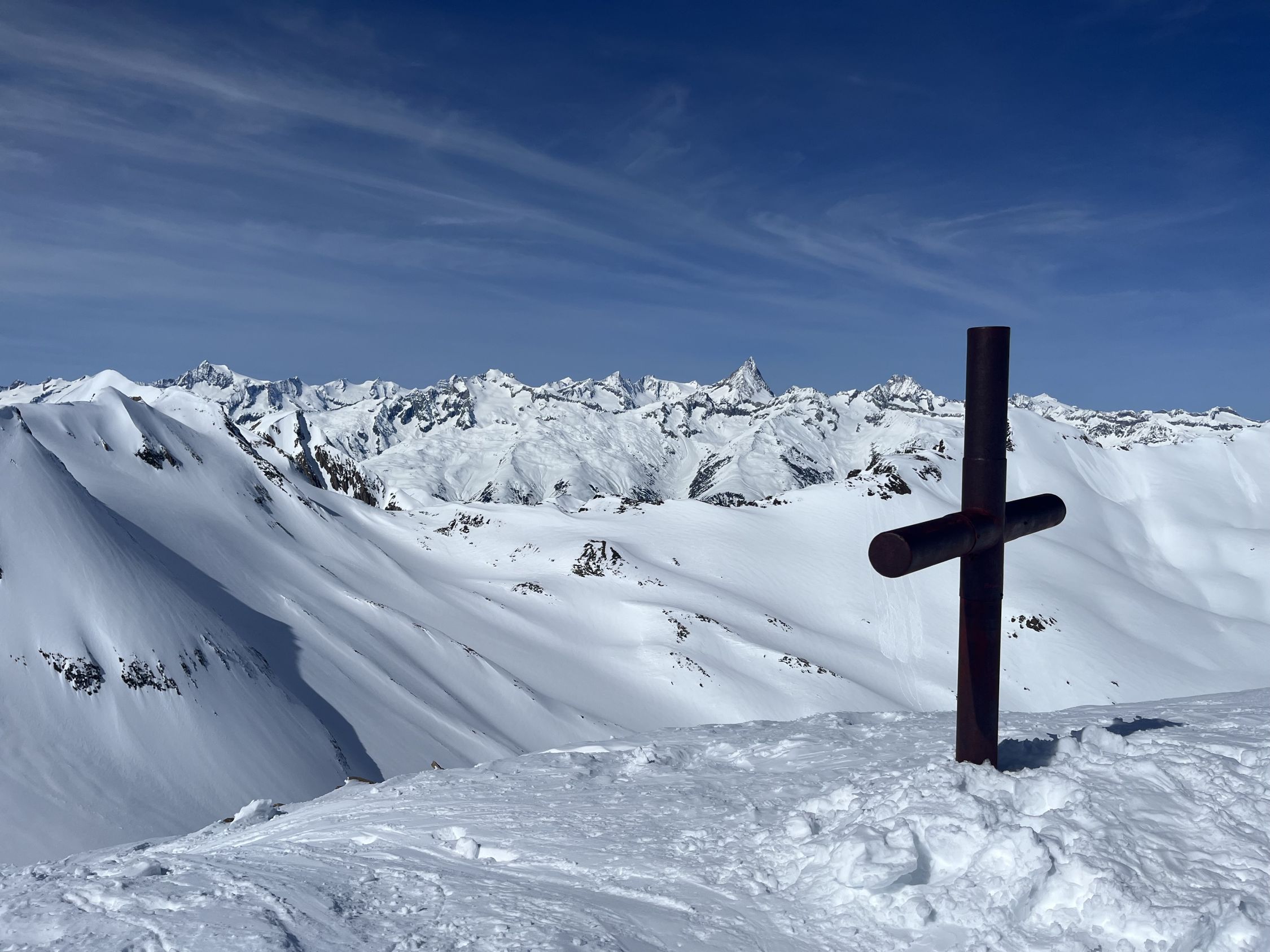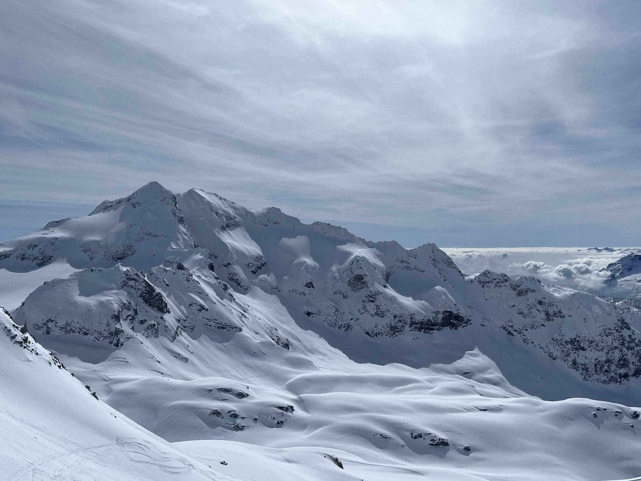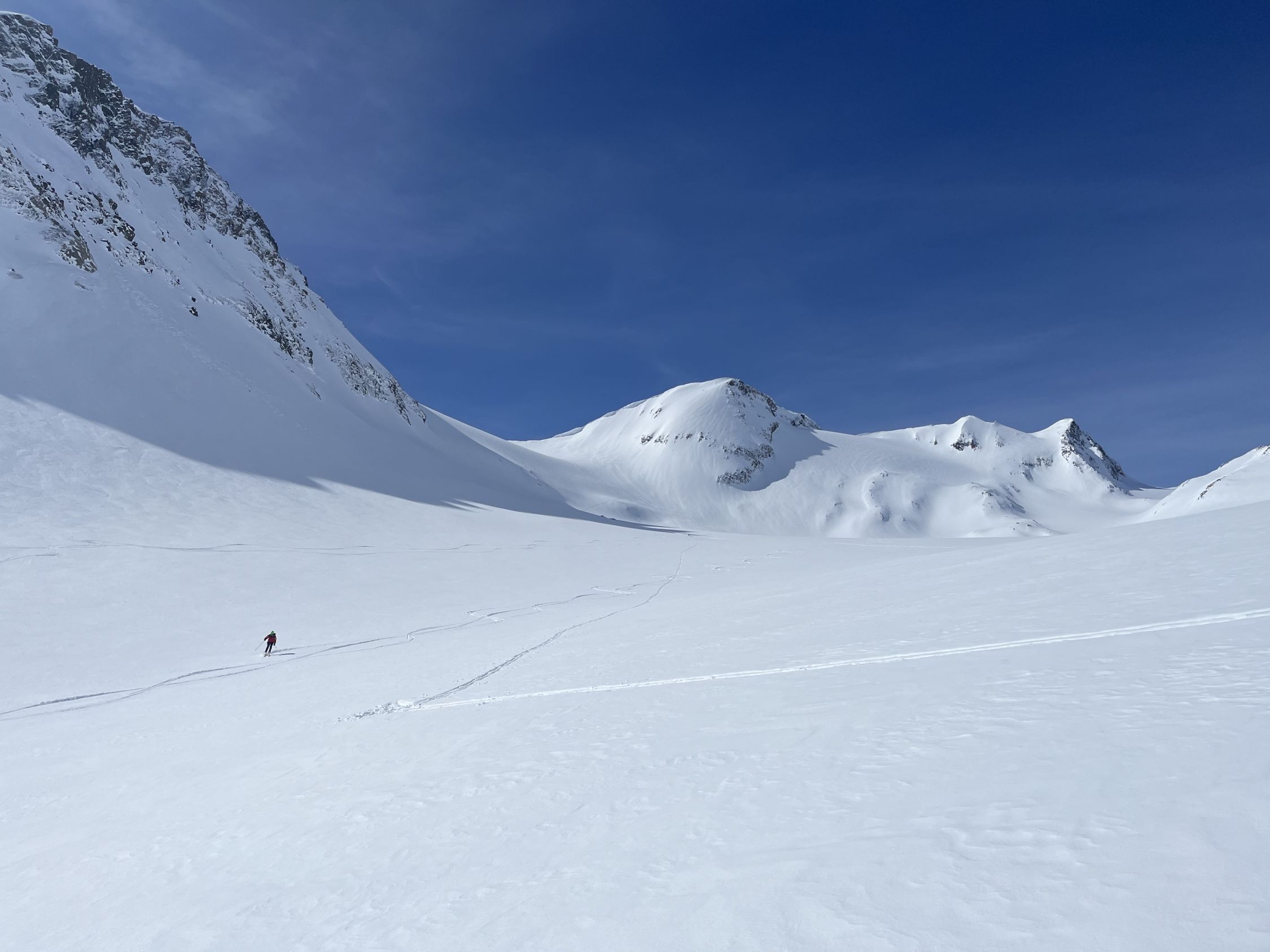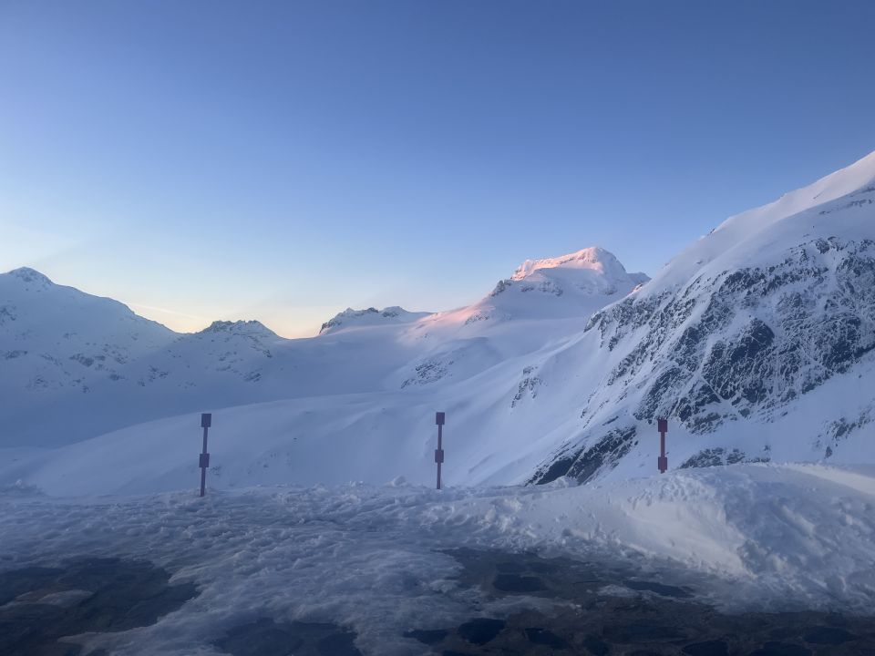 Anschlusstour nach Corno Rosso, um ca 10:30 im Tal vom Hohsandgletscher gestartet. Schnee im Aufstieg noch immer guter Presspulver und angenehm kühl. Um ca. 12:30 am Gipfel. Abfahrt durch die Südflanke noch nicht zu weich nur die obersten 5 cm, unterer Teil perfekter Presspulver.