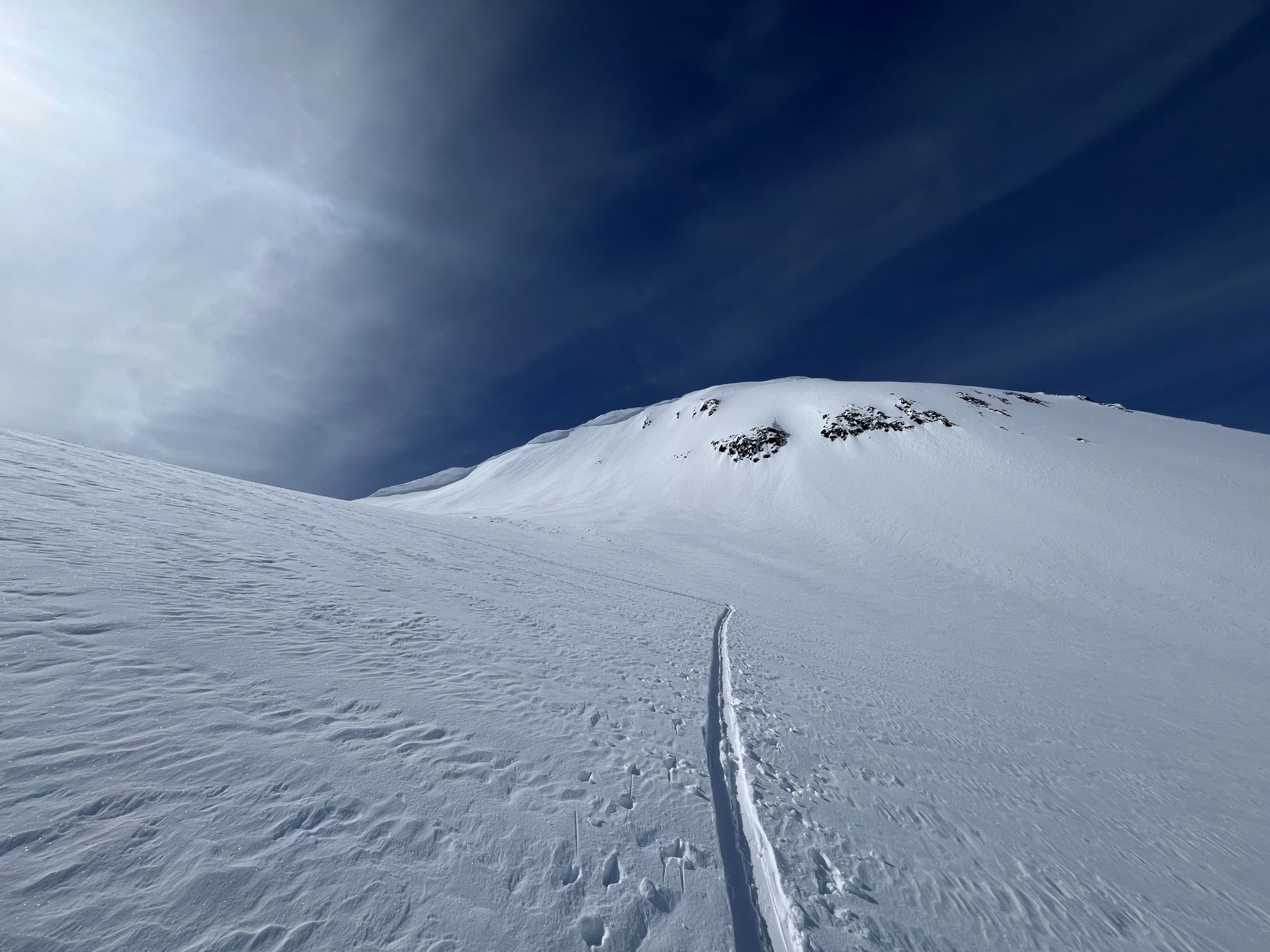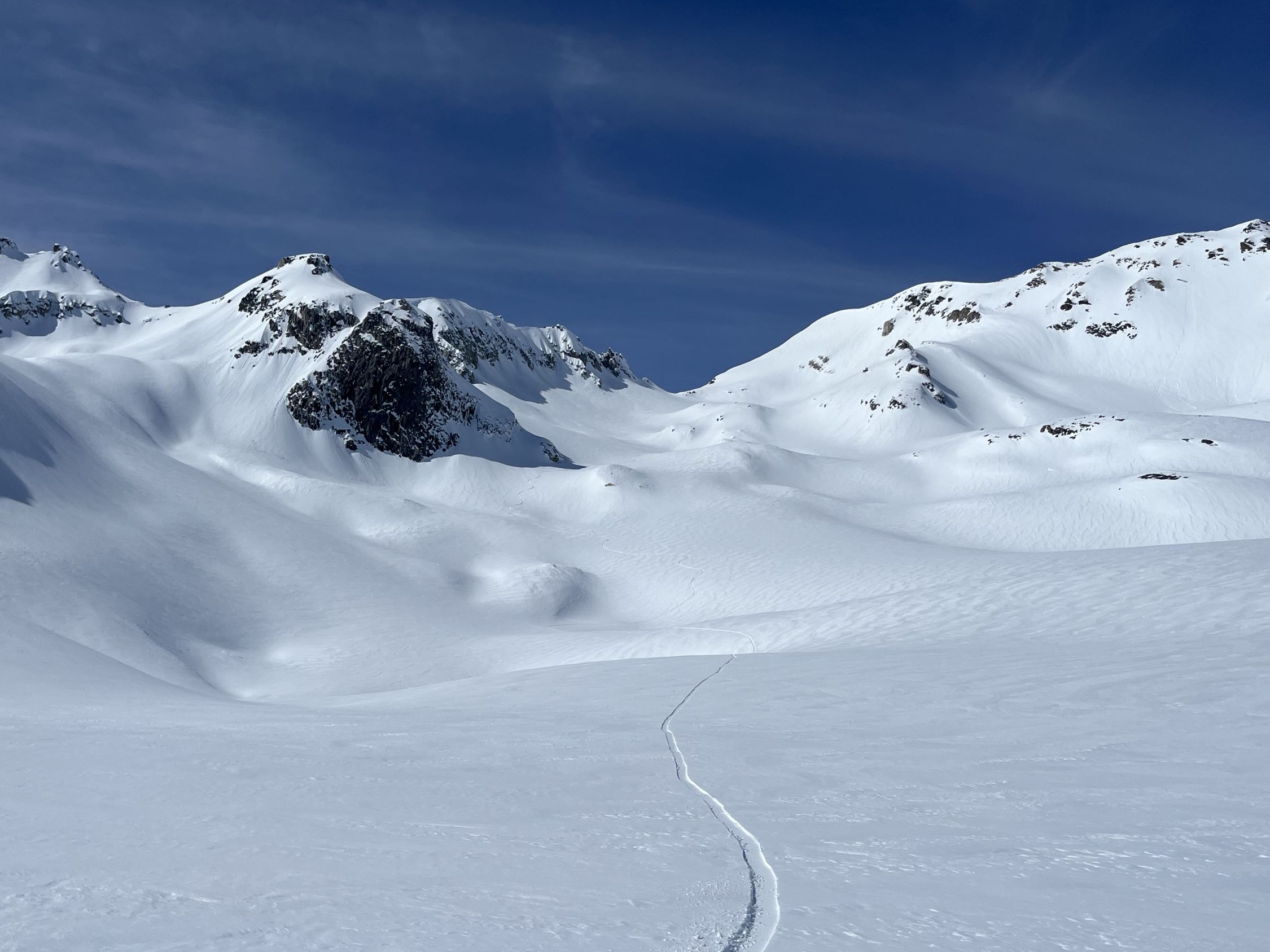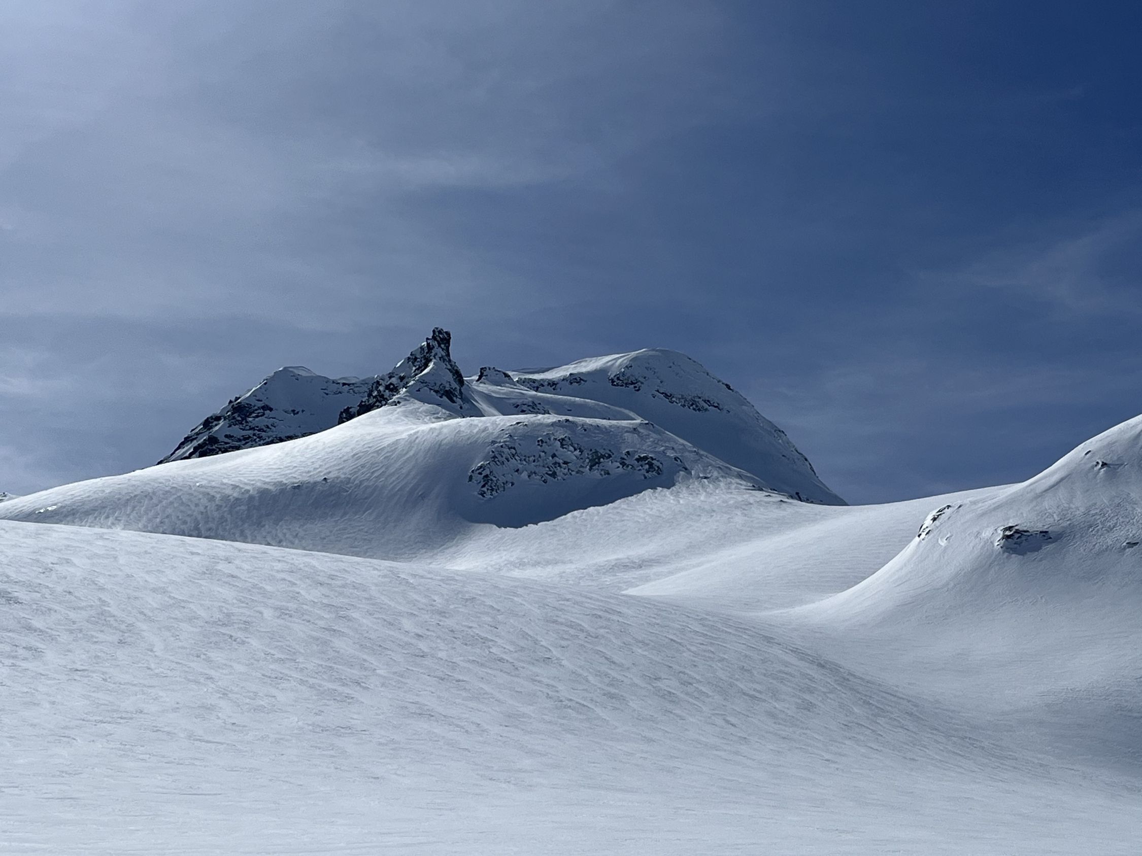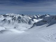 Anschlusstour nach Corno Rosso, um ca 10:30 im Tal vom Hohsandgletscher gestartet. Schnee im Aufstieg noch immer guter Presspulver und angenehm kühl. Um ca. 12:30 am Gipfel. Abfahrt durch die Südflanke noch nicht zu weich nur die obersten 5 cm, unterer Teil perfekter Presspulver.