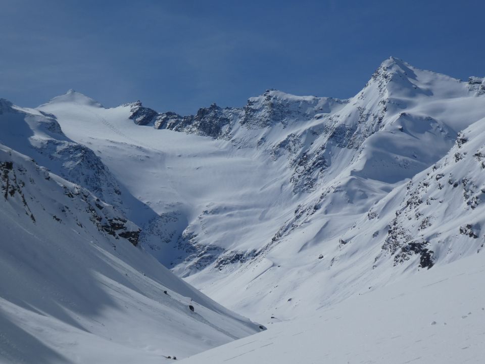 Von der Gletscherzunge bis zum Gipfel trockener Schnee mit etwas verfestigtem Powder. Im Läntatal leichter Harschdeckel, der ab den Mittagsstunden ansulzte. Nur auf den obersten 150 Höhenmetern am Gipfel ist der Schnee durch Wind leicht gepresst aber sehr gut fahrbar. Gute Aufstiegsspur von den zahlreichen Vorgängern. Auch die Zapportseite ist gut gespurt.