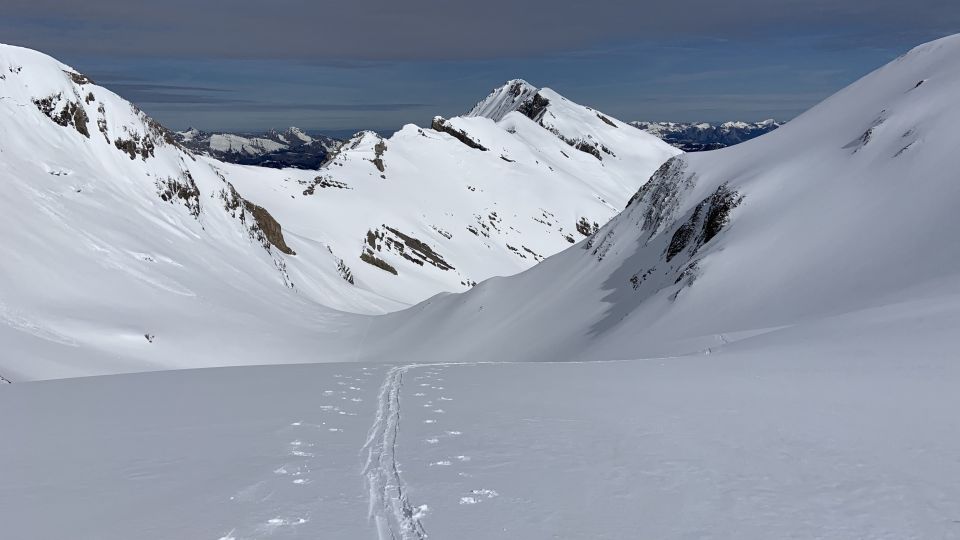 Ab Legerlibrügg ca 200 Hm Skitragen, dann durchgehend viel Schnee. Beim Geltenschuss am Morgen wenige Meter mit Steigeisen , weil Wassereis, bei der Abfahrt dann nur noch kurz Skitragen.