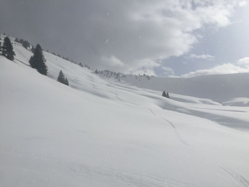 Mit Bike bis ca 1400. Warm beim Start um 14.00 Uhr. Dank ca 10 cm Neuschnee Forstweg imAufstieg durchgehend mit Ski befahrbar. Sehr wechselhafte Wetterverhältnisse. Ab Engelalp ca 1700 aufziehende Schauer und Wind. Immer wieder Aufhellungen und gute Sichtverhältnisse. Abfahrt gut bis sehr gut. Schwerer Pulver auf Hartschnee. Sehr gut zum fahren. Forstweg bis 1600 gut zum abfahren. Unterhalb 2 mal Ski tragen ganz kurz.
