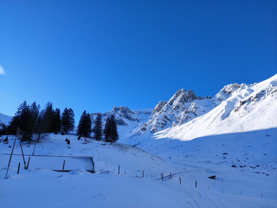 Aufstieg: Vom Hindere Fildrich über Steibode Pt. 1558, dann zur Alphütte Pt. 1722 und weiter Richtung Oberberg und Obertal zum Gipfel. Der Schnee ist überall gefroren mit einer Pulverauflage von 10 – 30cm. Harscheisen waren manchmal sehr hilfreich.