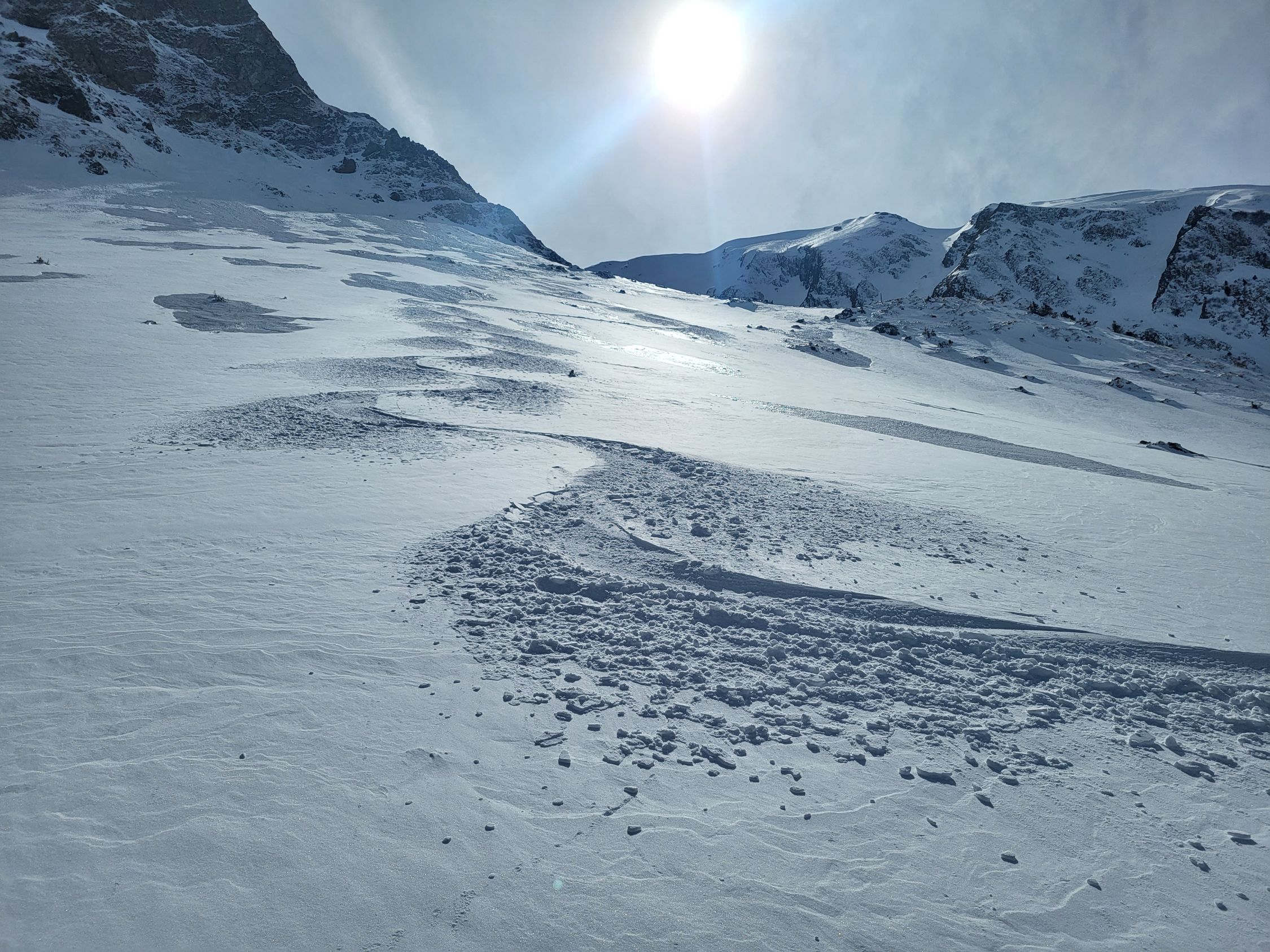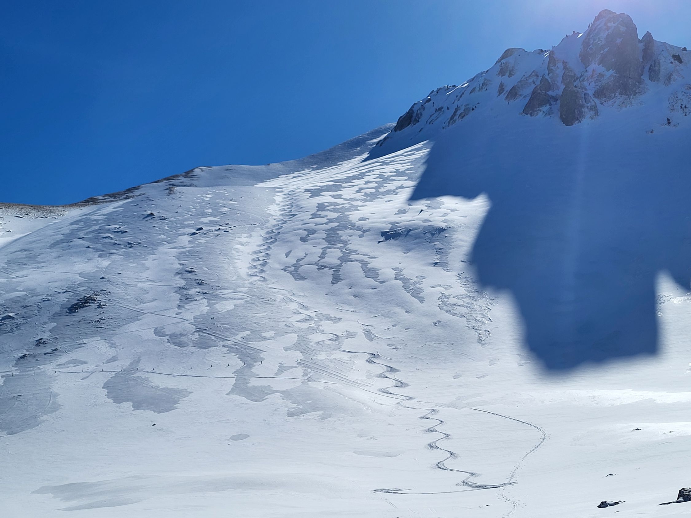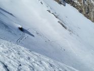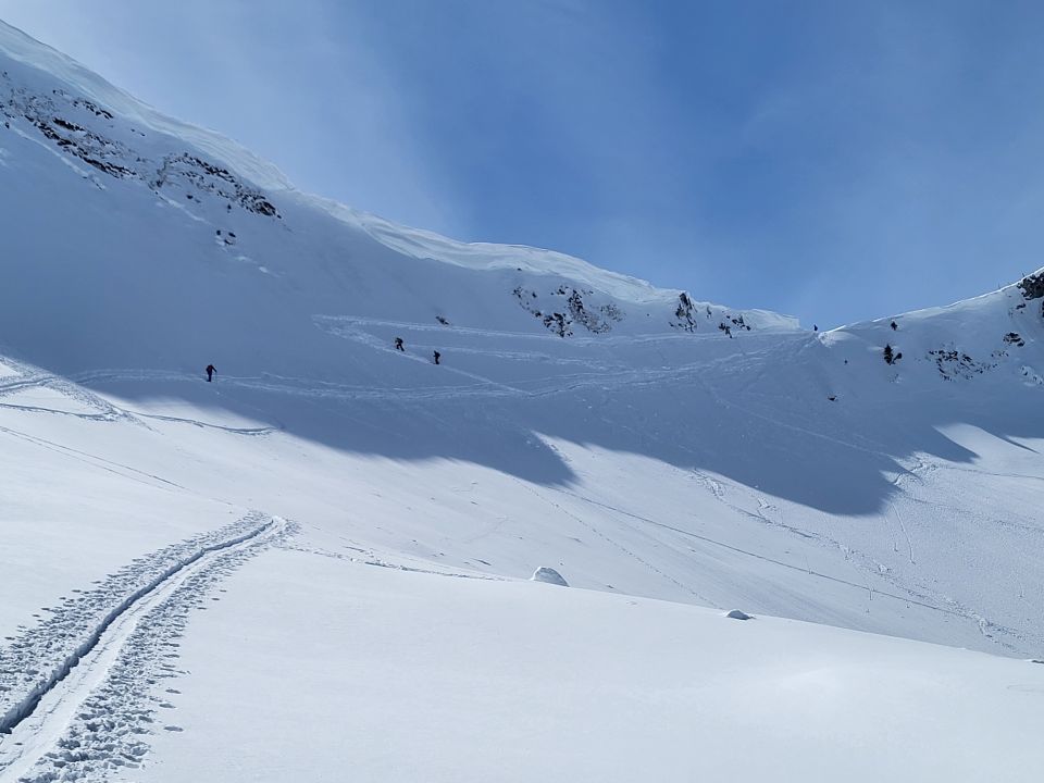 Aufstiegsspur zum Morgetepass für meinen Geschmack zu nahe an den Felsen, darum bin ich den letzten Teil kurz zu Fuss aufgestiegen. Während ich dort war ist einer Person von der oberen Spur runtergefallen.