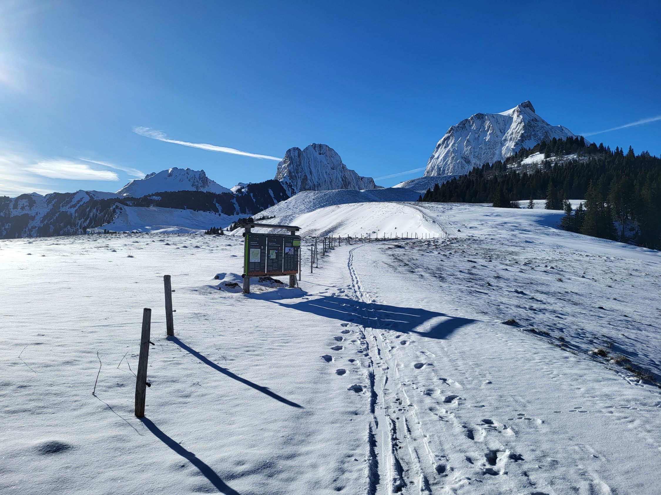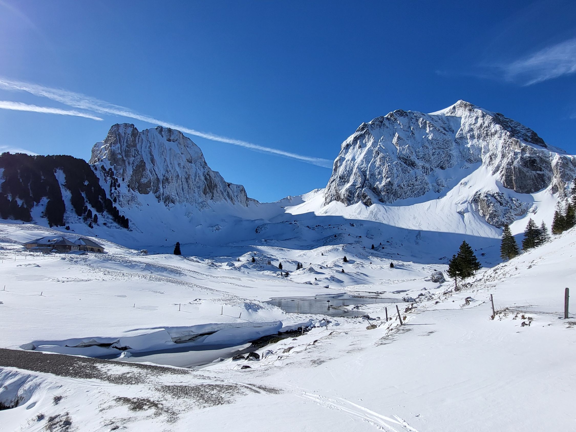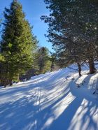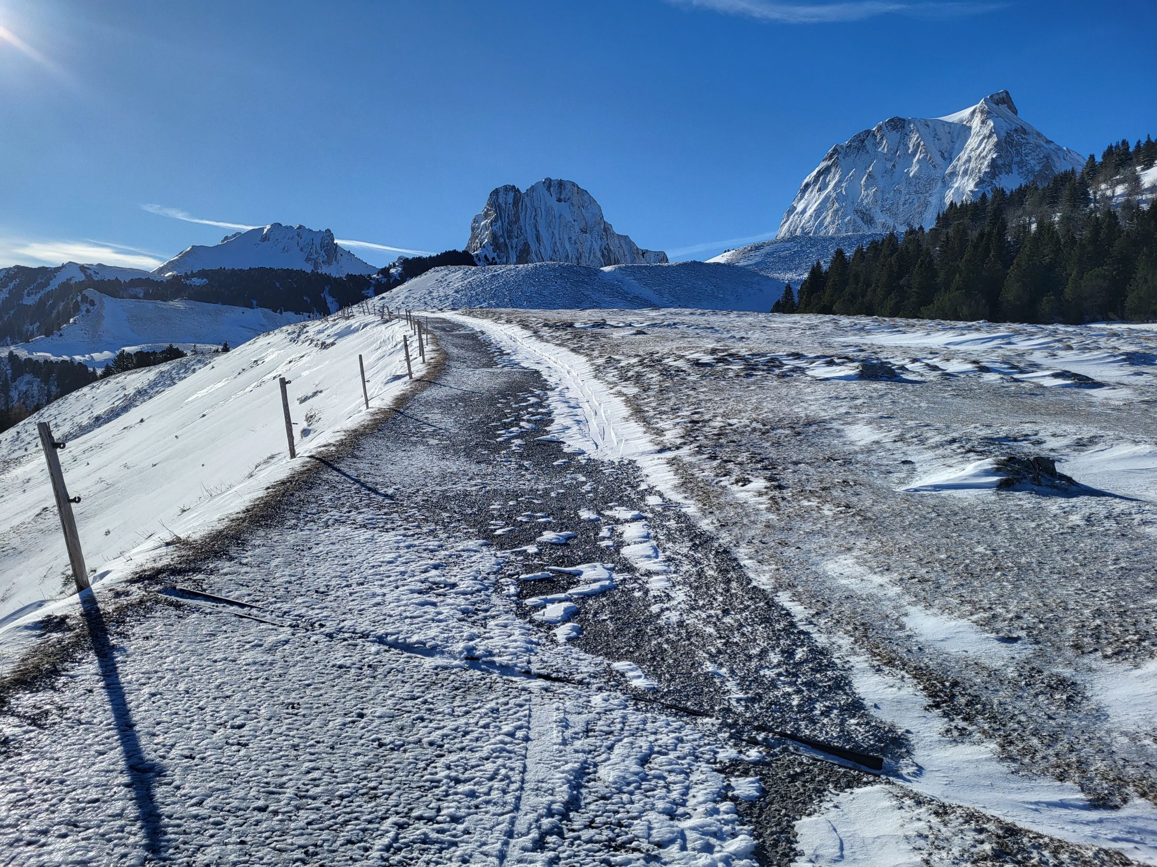 Leider hat der Wind den Neuschnee schon ziemlich verblasen und darunter ist eine vom Regen geprägte harte Eisschicht. Ich gebe trotzdem ein gut, weil man der Eisschicht ausweichen und auf den Neuschneeflecken/-feldern bleiben kann.
