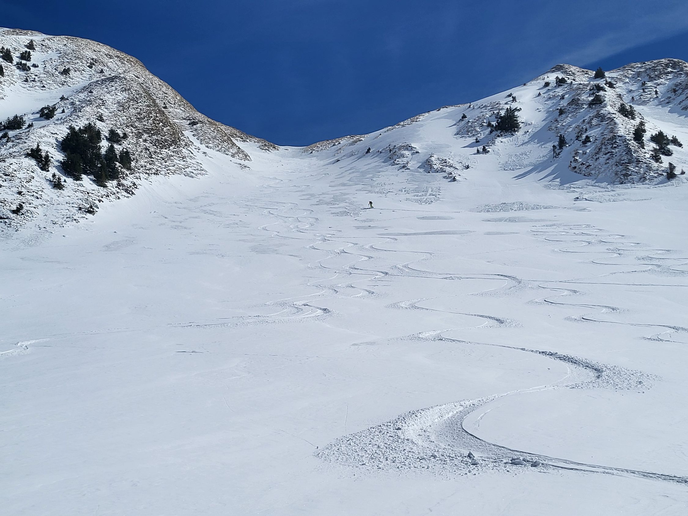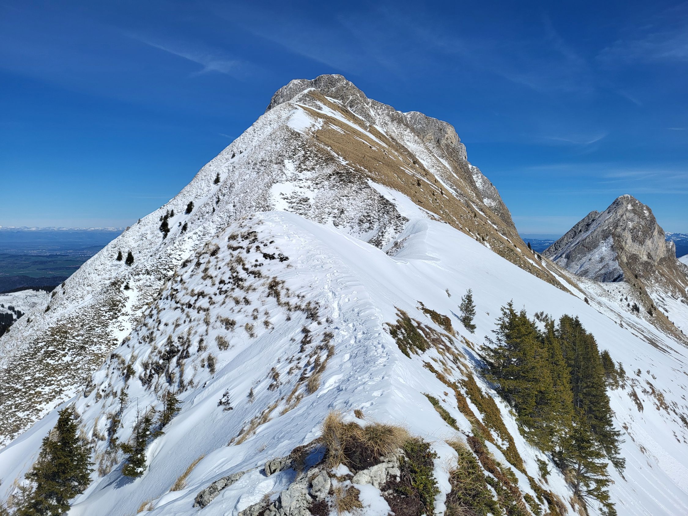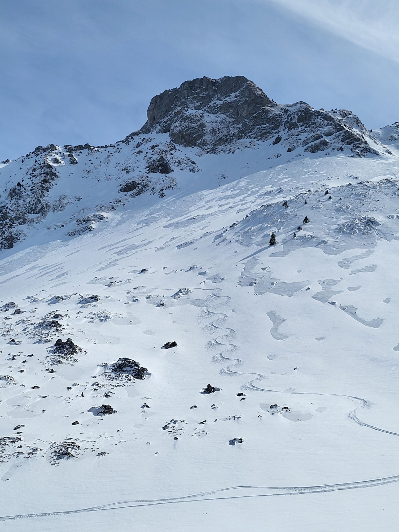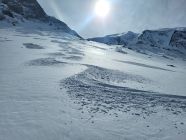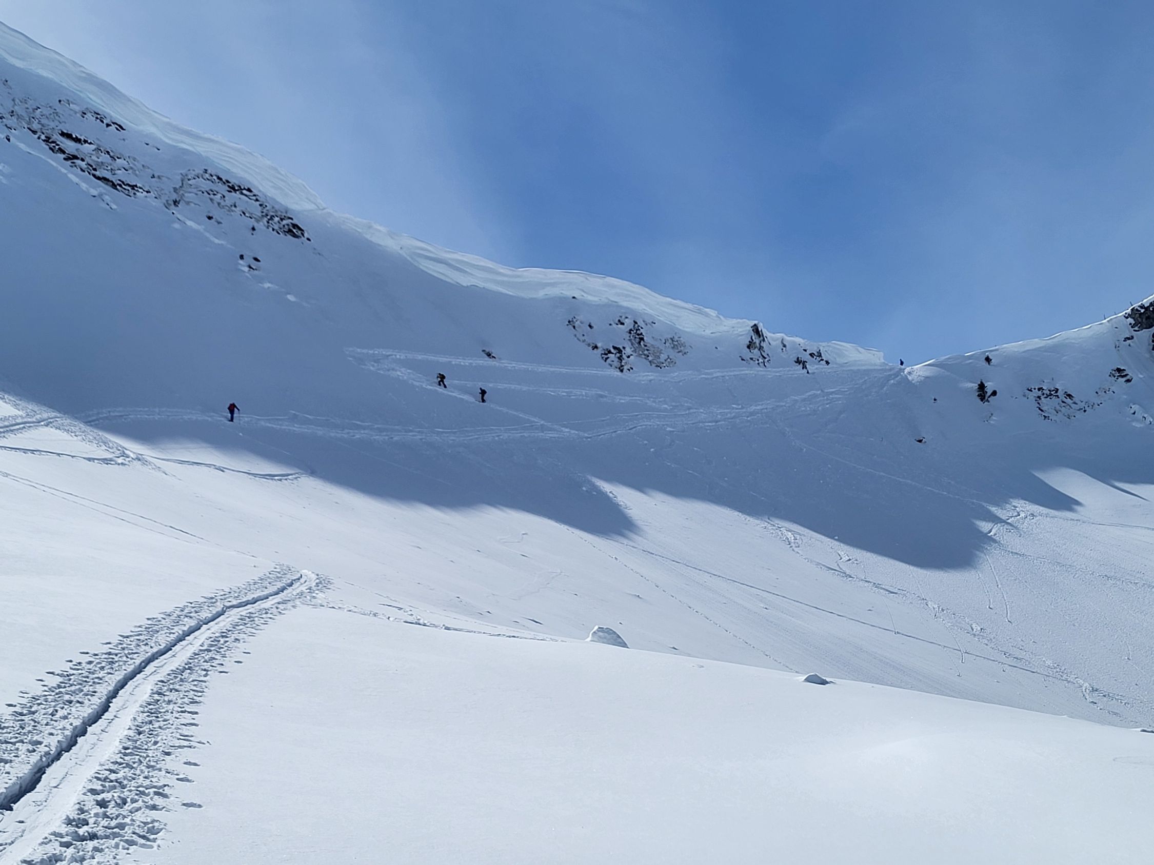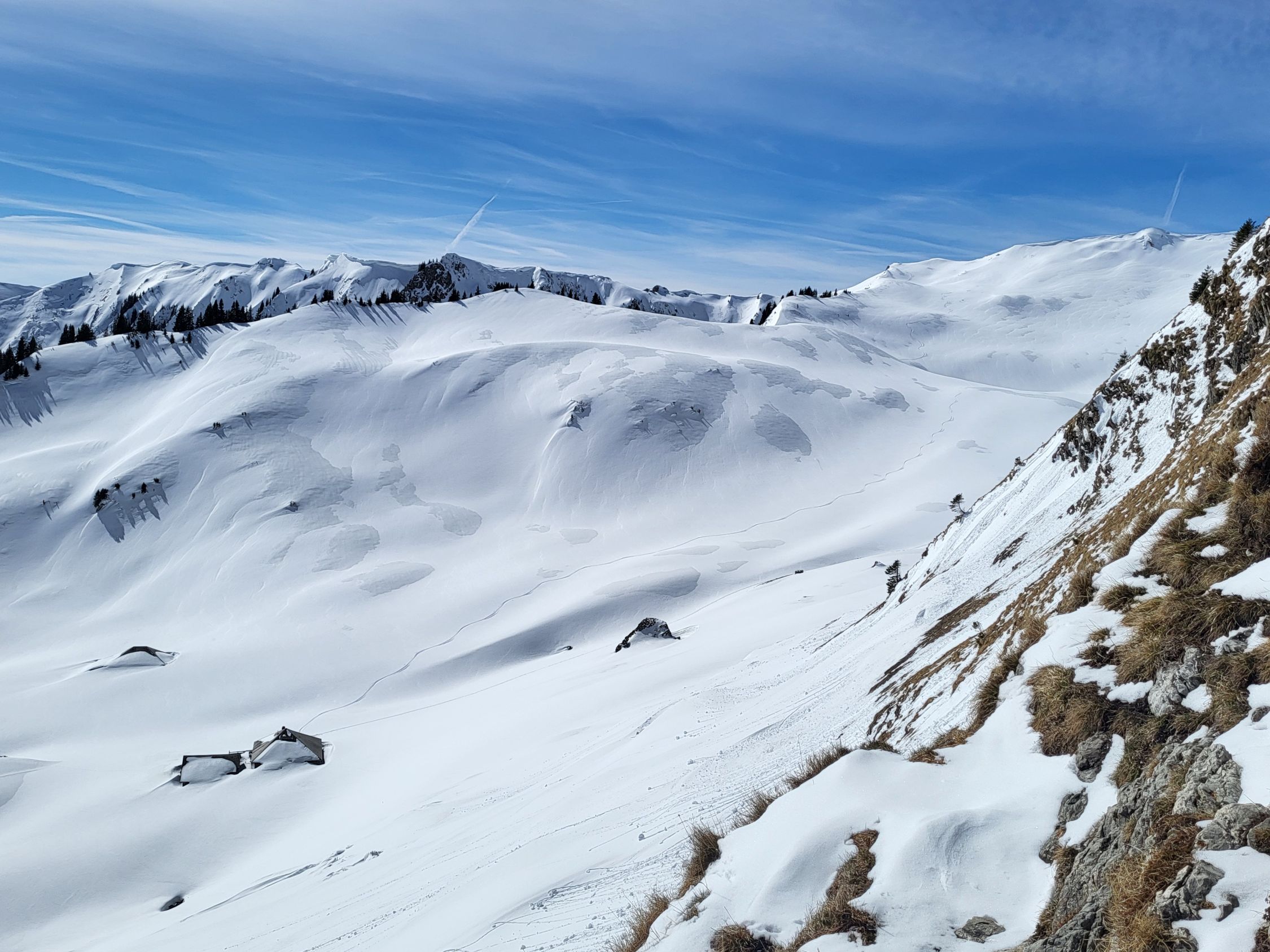 Einstieg in die Bürgle Nordflanke 130 m nach Gipfel sehr gut, es hat viel Pulverschnee im obersten Hang. Danach musste man ähnlich wie am Gustispitz die Schneeflecken suchen und kurze Stücke auf der eisigen Oberfläche fahren.